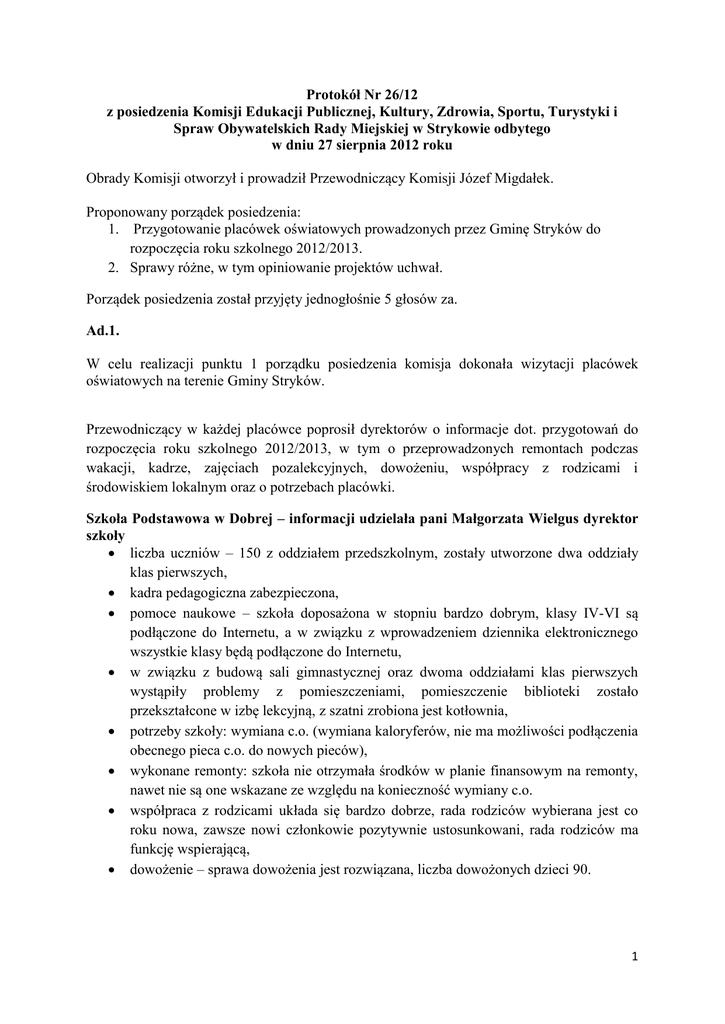 Protokół Nr 26/12 z posiedzenia Komisji Edukacji Publicznej, Kultury, Zdrowia, Sportu, Turystyki i Spraw Obywatelskich Rady Miejskiej w Strykowie odbytego w dniu 27 sierpnia 2012 roku Obrady Komisji otworzył i prowadził Przewodniczący Komisji Józef Migdałek. Proponowany porządek posiedzenia: 1. Przygotowanie placówek oświatowych prowadzonych przez Gminę Stryków do rozpoczęcia roku szkolnego 2012/2013. 2. Sprawy różne, w tym opiniowanie projektów uchwał. Porządek posiedzenia został przyjęty jednogłośnie 5 głosów za. Ad.1. W celu realizacji punktu 1 porządku posiedzenia komisja dokonała wizytacji placówek oświatowych na terenie Gminy Stryków. Przewodniczący w każdej placówce poprosił dyrektorów o informacje dot. przygotowań do rozpoczęcia roku szkolnego 2012/2013, w tym o przeprowadzonych remontach podczas wakacji, kadrze, zajęciach pozalekcyjnych, dowożeniu, współpracy z rodzicami i środowiskiem lokalnym oraz o potrzebach placówki. Szkoła Podstawowa w Dobrej – informacji udzielała pani Małgorzata Wielgus dyrektor szkoły liczba uczniów – 150 z oddziałem przedszkolnym, zostały utworzone dwa oddziały klas pierwszych, kadra pedagogiczna zabezpieczona, pomoce naukowe – szkoła doposażona w stopniu bardzo dobrym, klasy IV-VI są podłączone do Internetu, a w związku z wprowadzeniem dziennika elektronicznego wszystkie klasy będą podłączone do Internetu, w związku z budową sali gimnastycznej oraz dwoma oddziałami klas pierwszych wystąpiły problemy z pomieszczeniami, pomieszczenie biblioteki zostało przekształcone w izbę lekcyjną, z szatni zrobiona jest kotłownia, potrzeby szkoły: wymiana c.o. (wymiana kaloryferów, nie ma możliwości podłączenia obecnego pieca c.o. do nowych pieców), wykonane remonty: szkoła nie otrzymała środków w planie finansowym na remonty, nawet nie są one wskazane ze względu na konieczność wymiany c.o. współpraca z rodzicami układa się bardzo dobrze, rada rodziców wybierana jest co roku nowa, zawsze nowi członkowie pozytywnie ustosunkowani, rada rodziców ma funkcję wspierającą, dowożenie – sprawa dowożenia jest rozwiązana, liczba dowożonych dzieci 90. 1 Pani Anna Sasin sekretarz Miasta-Gminy Stryków powiedziała, że trzeba mieć na uwadze, że liczba uczniów w tej szkole będzie wzrastać, w jednej części szkoły, gdzie jest sala gimnastyczna trzeba pomyśleć o remoncie i wymianie c.o. Szkoła Podstawowa w Koźlu - informacji udzielił pan Jerzy Makowski dyrektor szkoły Dyrektor poinformował, że szkoła otrzymała najwięcej pieniędzy na remont placówki. wykonane remonty: wymiana kaloryferów we wszystkich klasach lekcyjnych, pomalowano ściany po zdjętych kaloryferach, dokończono remonty łazienek, wykonano z kostki brukowej szlaki komunikacyjne wokół szkoły, utwardzono miejsca parkingowe oraz miejsca pod kosze do segregacji odpadów, wykonano przed budynkiem kwietnik, w przyszłości będą jeszcze wykonane dwa takie kwietniki, pomalowano bramki, rozebrana została stara studnia i zabezpieczono ją, wykonano piłko chwyty od strony ulicy. kadra pedagogiczna zapewniona, nie ma wakatów, Potrzeby szkoły: w związku z liczną grupą uczniów w klasie „0” nastąpiła zamiana pomieszczeń przedszkolaków, potrzebne są środki finansowe na przygotowanie tej klasy w kwocie ok. 7 tys. złotych (zakup paneli podłogowych, listew przypodłogowych, zabezpieczenia kaloryferów). liczba uczniów: 81 dowożenie: dowożonych będzie ok. 80% uczniów, zajęcia pozalekcyjne: zuchy, koło dziennikarskie, klub europejczyka, zajęcia muzyczno-ruchowe, zajęcia informatyczne, akademia młodych twórców, chór szkolny, zajęcia z języka angielskiego i francuskiego, zajęcia sportowe: tenis stołowy, współpraca z rodzicami: w poprzednim roku były problemy z klasą szóstą, gdzie zainteresowanie nauką było niewielkie, dyrekcja i rada pedagogiczna była zmuszona do ostrej reakcji u rodziców, dziś ta współpraca jest dobra, rodzice uczestniczą we wszystkich uroczystościach szkoły i świętach okolicznościowych. Zespół Szkół Nr 2 w Bratoszewicach – informacji udzieliła pani Ewa Piórkowska dyrektor Zespołu wykonane remonty: wyremontowana jedna sala lekcyjna, wymienione drzwi, dowożenie: system dowożenia uzgodniony, dowożonych będzie 22 uczniów ze szkoły podstawowej i 84 uczniów z gimnazjum, na świetlicy będzie przebywać ok. 120 uczniów, kadra pedagogiczna zapewniona, plan lekcji ułożony, potrzeby szkoły: na generalny remont sali gimnastycznej w Zespole Szkół Nr 2 w Bratoszewicach wraz z termoizolacją dachu, wymiana parkietu, okien, liczba uczniów – 202, w tym w klasie „0” – 24 uczniów, jest to tendencja spadkowa, współpraca z rodzicami i ze środowiskiem lokalnym jest dobra, społeczność lokalna jest włączana do aktywizacji. Przewodniczący Komisji pytał o powód tej tendencji, czemu jest coraz mniej uczniów z Niesułkowa. Radna Anna Ślęzak mówiła, że dzieci z Niesułkowa nie przychodzą do gimnazjum w Bratoszewicach, odchodzą do Łodzi. Trzeba znaleźć tego przyczynę. Rodzice maja zarzuty do sposobu nauczania, uczniowie czas wolny spędzają na stołówce (brak świetlicy), a nie w salach lekcyjnych, np. komputerowej czy sali gimnastycznej, są problemy z dowożeniem. 2 Pani Ewa Piórkowska dyrektor ZS Nr 2 powiedziała, że przyczyny żadnej nie ma, szkoła w Bratoszewicach jest szkołą bezpieczną, przyjazną, nie ma żadnych przykrych incydentów, zdawalność do szkół średnich jest dobra, warunki posiada jak najlepsze, baza sportowa zapewniona, oferta zajęć poza lekcyjnych także jest bogata. Rodzice bogaci wysyłają dzieci do szkół do Łodzi, jest to tzw. „owczy pęd”. Pani dyrektor powiedziała, że w czasie wolnym nie może uczniów wpuści na salę gimnastyczną bez nadzoru nauczyciela od wychowania fizycznego, dzieci przebywają na stołówce, bo nie ma świetlicy, młodsze dzieci w klasac