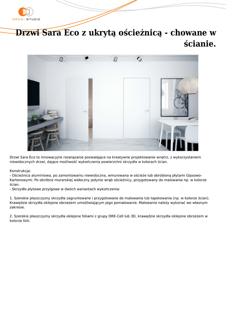 Drzwi Sara Eco z ukrytą ościeżnicą - chowane w ścianie. Drzwi Sara Eco to innowacyjne rozwiązanie pozwalające na kreatywne projektowanie wnętrz, z wykorzystaniem niewidocznych drzwi, dające możliwość wykończenia powierzchni skrzydła w kolorach ścian. Konstrukcja: - Ościeżnica aluminiowa, po zamontowaniu niewidoczna, wmurowana w ościeże lub obrobioną płytami GipsowoKartonowymi. Po obróbce murarskiej widoczny jedynie wrąb ościeżnicy, przygotowany do malowania np. w kolorze ścian. - Skrzydło płytowe przylgowe w dwóch wariantach wykończenia: 1. Szerokie płaszczyzny skrzydła zagruntowane i przygotowane do malowania lub tapetowania (np. w kolorze ścian). Krawędzie skrzydła oklejone obrzeżem umożliwiającym jego pomalowanie. Malowanie należy wykonać we własnym zakresie. 2. Szerokie płaszczyzny skrzydła oklejone foliami z grupy DRE-Cell lub 3D, krawędzie skrzydła oklejone obrzeżem w kolorze folii.