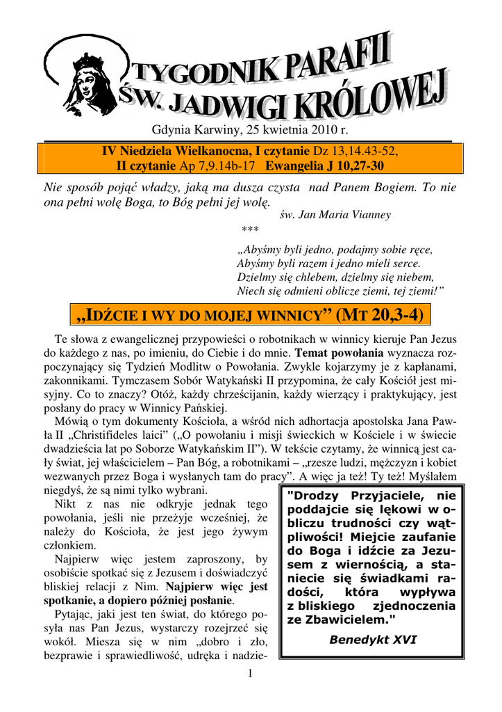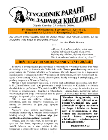 Gdynia Karwiny, 25 kwietnia 2010 r. IV Niedziela Wielkanocna, I czytanie Dz 13,14.43-52, II czytanie Ap 7,9.14b-17 Ewangelia J 10,27-30 Nie sposób pojąć władzy, jaką ma dusza czysta nad Panem Bogiem. To nie ona pełni wolę Boga, to Bóg pełni jej wolę. św. Jan Maria Vianney *** „Abyśmy byli jedno, podajmy sobie ręce, Abyśmy byli razem i jedno mieli serce. Dzielmy się chlebem, dzielmy się niebem, Niech się odmieni oblicze ziemi, tej ziemi!” „IDŹCIE I WY DO MOJEJ WINNICY” (MT 20,3-4) Te słowa z ewangelicznej przypowieści o robotnikach w winnicy kieruje Pan Jezus do każdego z nas, po imieniu, do Ciebie i do mnie. Temat powołania wyznacza rozpoczynający się Tydzień Modlitw o Powołania. Zwykle kojarzymy je z kapłanami, zakonnikami. Tymczasem Sobór Watykański II przypomina, że cały Kościół jest misyjny. Co to znaczy? Otóż, każdy chrześcijanin, każdy wierzący i praktykujący, jest posłany do pracy w Winnicy Pańskiej. Mówią o tym dokumenty Kościoła, a wśród nich adhortacja apostolska Jana Pawła II „Christifideles laici” („O powołaniu i misji świeckich w Kościele i w świecie dwadzieścia lat po Soborze Watykańskim II”). W tekście czytamy, że winnicą jest cały świat, jej właścicielem – Pan Bóg, a robotnikami – „rzesze ludzi, mężczyzn i kobiet wezwanych przez Boga i wysłanych tam do pracy”. A więc ja też! Ty też! Myślałem niegdyś, że są nimi tylko wybrani. "Drodzy Przyjaciele, nie Nikt z nas nie odkryje jednak tego poddajcie się lękowi w opowołania, jeśli nie przeżyje wcześniej, że bliczu trudności czy wątnależy do Kościoła, że jest jego żywym pliwości! Miejcie zaufanie członkiem. do Boga i idźcie za JezuNajpierw więc jestem zaproszony, by sem z wiernością, a staosobiście spotkać się z Jezusem i doświadczyć niecie się świadkami rabliskiej relacji z Nim. Najpierw więc jest dości, która wypływa spotkanie, a dopiero później posłanie. z bliskiego zjednoczenia Pytając, jaki jest ten świat, do którego poze Zbawicielem." syła nas Pan Jezus, wystarczy rozejrzeć się Benedykt XVI wokół. Miesza się w nim „dobro i zło, bezprawie i sprawiedliwość, udręka i nadzie1 ja”. A my, chrześcijanie, mamy być solą ziemi i światłem świata (Mt 5,13-14), bo pierwszym i podstawowym naszym powołaniem jest powołanie do świętości, czyli do doskonałości w miłości. Z tekstu adhortacji wynika, też, jak bardzo ważne jest zaangażowanie na terenie własnej parafii, w której każdy z może służyć tym darem, który otrzymał. Sama doświadczam, ile radości, satysfakcji płynie z tego, że mogę służyć innym! A miejsca dla nikogo z nas nie zabraknie. Tyle jest obszarów apostolskiego działania. W tym tygodniu warto więc zapytać siebie: - Czy pracuję w Winnicy Pańskiej? - Czy zastanawiam się do czego jestem powołany? - Czy staram się, najlepiej jak umiem, wypełniać to powołanie? Im więcej bowiem będzie nas, ludzi świeckich, owianych duchem ewangelizacyjnym, tym naprawdę będzie zmieniać się oblicze ziemi, tej ziemi. Krystyna HISTORYCZNA BUDOWLA Wiele pięknych słów napisano o naszym mieście, ale chyba najtrafniej określono je hasłem: „Gdynia – miasto z morza i marzeń”. Dla ścisłości i prawdy historycznej należałoby jeszcze dodać, że Gdynia powstała również z węgla, który był głównym towarem przeładunkowym gdyńskiego portu. Jako jedna z pierwszych powstała baza przeładunku węgla przy nabrzeżu Węglowym, pozostałością z tamtych lat jest także ulica Węglowa w rejonie portu, przez którą przejeżdżały wagony z węglem. Zapotrzebowanie na polski węgiel z każdym rokiem wzrastało, szczególnie w okresie strajku górników angielskich, a jedynym ograniczeniem dalszego zwiększania jego wywozu drogą morską, m.in. do Skandynawii, była trudność dowozu do Gdyni. To zadecydowało o powstaniu nowej linii kolejowej, nazwanej Magistralą Węglową, która połączyła kopalnie śląskie z portem w Gdyni, omijając Wolne Miasto Gdańsk. Budowano ją etapami; rozpoczęto w 1925 roku, a cały szlak transportowy, będący jedną z największych inwestycji kolejowych Polski międzywojennej, oddano do użytku w 1933 roku. Najkosztowniejszy i najtrudniejszy z powodu niekorzystnych warunków terenowych okazał się odcinek Bydgoszcz-Gdynia, przy czym najwięcej trudności sprawiała projektantom i wykonawcom końcowa jego część z Osowy do Gdyni. Występowała tu duża różnica wysokości terenu, nie ułatwiały prac liczne wzniesienia i pagórki, słowem – była to trasa o parametrach górskich. Tymczasem transport ciężkich wagonów z węglem wymagał, by kolej prowadzić w linii prostej, bez ostrych zakrętów, podjazdów i zjazdów. Końcowym i najbardziej imponującym efektem starań budowniczych Magistrali Węglowej jest istniejąca na terenie naszej parafii historyczna budowla inżynierska, usytuowana poniżej przerzuconego nad torami okazałego wiaduktu. Jest to „Wielki Wykop” o wymiarach: 950 metrów długości i ponad 19 metrów głębokości. Sprawia wrażenie naturalnego uskoku pomiędzy dwoma wzniesieniami morenowymi, a został wykonany siłą ludzkich rąk 2 w ciągu dwóch lat, przy użyciu łopat. Pracowały przy nim setki robotników. Ciężki sprzęt ograniczał się jedynie do dwóch parowych koparek. Przemieszczono ponad 400 tys. m kw. ziemi. Wykopany piasek wywożono kolejkami wąskotorowymi w inne miejsca , gdzie użyto go m.in. do budowy nasypów w Małym Kacku i pod stację Kack Wielki, usypano groblę na bagnie, będącym pozostałością po osuszonym na początku XX wieku Jeziorze Wielkokackim. Obecnie dawna magistrala, zelektryfikowana w latach sześćdziesiątych ubiegłego wieku i prowadząca przez Kaszuby do Kościerzyny, jest uznawana za unikatowy na skalę europejską skansen przedwojennej techniki kolejowej, a Wielki Wykop jest jej istotnym elementem. Z nastaniem wiosny i lata zwiększa