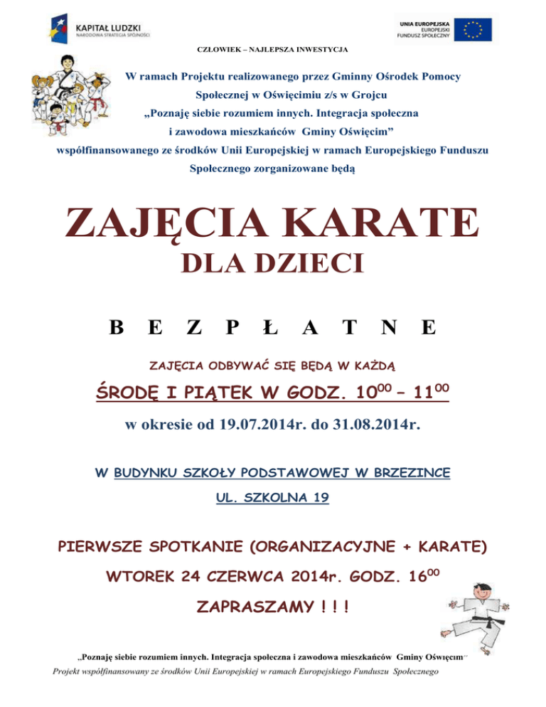 CZŁOWIEK – NAJLEPSZA INWESTYCJA W ramach Projektu realizowanego przez Gminny Ośrodek Pomocy Społecznej w Oświęcimiu z/s w Grojcu „Poznaję siebie rozumiem innych. Integracja społeczna i zawodowa mieszkańców Gminy Oświęcim” współfinansowanego ze środków Unii Europejskiej w ramach Europejskiego Funduszu Społecznego zorganizowane będą ZAJĘCIA KARATE DLA DZIECI B E Z P Ł A T N E ZAJĘCIA ODBYWAĆ SIĘ BĘDĄ W KAŻDĄ ŚRODĘ I PIĄTEK W GODZ. 1000 – 1100 w okresie od 19.07.2014r. do 31.08.2014r. W BUDYNKU SZKOŁY PODSTAWOWEJ W BRZEZINCE UL. SZKOLNA 19 PIERWSZE SPOTKANIE (ORGANIZACYJNE + KARATE) WTOREK 24 CZERWCA 2014r. GODZ. 1600 ZAPRASZAMY ! ! ! „Poznaję siebie rozumiem innych. Integracja społeczna i zawodowa mieszkańców Gminy Oświęcim” Projekt współfinansowany ze środków Unii Europejskiej w ramach Europejskiego Funduszu Społecznego