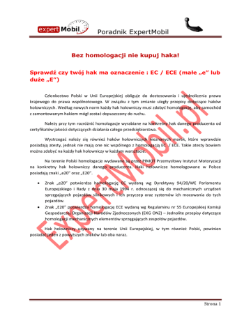 Poradnik ExpertMobil Bez homologacji nie kupuj haka! Sprawdź czy twój hak ma oznaczenie : EC / ECE (małe „e” lub duże „E”) Członkostwo Polski w Unii Europejskiej obliguje do dostosowania i ujednolicenia prawa krajowego do prawa wspólnotowego. W związku z tym zmianie uległy przepisy dotyczące haków holowniczych. Według nowych norm każdy hak holowniczy musi zdobyd homologację, aby samochód z zamontowanym hakiem mógł zostad dopuszczony do ruchu. Należy przy tym rozróżnid homologacje wyrabiane na konkretny hak danego producenta od certyfikatów jakości dotyczących działania całego przedsiębiorstwa. Wystrzegad należy się również haków holowniczych nieznanych marek, które wprawdzie posiadają atesty, jednak nie mają one nic wspólnego z homologacją EC / ECE. Takie atesty bowiem można zdobyd na każdy hak holowniczy w każdym warsztacie. Na terenie Polski homologacje wydawane są przez PIMOT Przemysłowy Instytut Motoryzacji na konkretny hak holowniczy danego producenta. Haki holownicze homologowane w Polsce posiadają znaki „e20” oraz „E20”. Znak „e20” potwierdza homologację EC wydaną wg Dyrektywy 94/20/WE Parlamentu Europejskiego i Rady z dnia 30 maja 1994 r. odnoszącej się do mechanicznych urządzeo sprzęgających pojazdów silnikowych i ich przyczep oraz systemów ich mocowania do tych pojazdów. Znak „E20” potwierdza homologację ECE wydaną wg Regulaminu nr 55 Europejskiej Komisji Gospodarczej Organizacji Narodów Zjednoczonych (EKG ONZ) – Jednolite przepisy dotyczące homologacji mechanicznych elementów sprzęgających zespołów pojazdów. Hak holowniczy używany na terenie Unii Europejskiej, w tym również Polski, powinien posiadad jeden z powyższych znaków lub oba naraz. Strona 1 Poradnik ExpertMobil Niestety producenci haków holowniczych nie zawsze posiadają homologacje na cały swój asortyment. Dlatego ważne jest, aby przed kupnem haka sprawdzid czy jest on markowany znakiem „e20” lub/i „E20”. Co prawda w Polsce zarejestrowanie i używanie niehomologowanego haka holowniczego nie spotyka się z restrykcyjnymi konsekwencjami jednak wyjazd poza granice naszego kraju może grozid kłopotami podczas rutynowej kontroli. W sklepie ExpertMobil selekcjonujemy towar najwyższej jakości i dbamy, aby sprzedawane przez nas haki holownicze posiadały homologacje. Należy jednak pamiętad, że haki dla nietypowych samochodów mogą nie posiadad homologacji u żadnego producenta. Dlatego oferujemy również haki bez homologacji uznanych producentów. Nasz sklep nie chce jednak wprowadzad w błąd swoich klientów i w ofertach wyraźnie informuje, które haki holownicze posiadają homologacje. Możliwośd wyboru zostawiamy naszym klientom. Serdecznie zapraszamy do skorzystania z naszej oferty! Strona 2