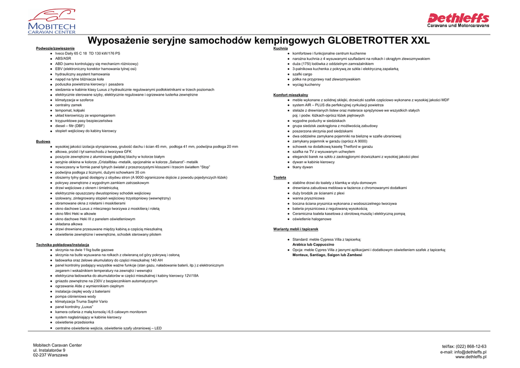 Wyposażenie seryjne samochodów kempingowych GLOBETROTTER XXL Podwozie/zawieszenie ● Iveco Daily 65 C 18 TD 130 kW/176 PS ● ABS/ASR ● ABD (samo kontrolujący się mechanizm różnicowy) ● EBV (elektroniczny korektor hamowania tylnej osi) ● hydrauliczny asystent hamowania ● napęd na tylne bliźniacze koła ● poduszka powietrzna kierowcy i pasażera ● siedzenia w kabinie klasy Luxus z hydraulicznie regulowanymi podłokietnikami w trzech poziomach ● elektrycznie sterowane szyby, elektrycznie regulowane i ogrzewane lusterka zewnętrzne ● klimatyzacja w szoferce ● centralny zamek ● tempomat, kołpaki ● układ kierowniczy ze wspomaganiem ● trzypunktowe pasy bezpieczeństwa ● diesel – filtr (DBF) ● stopień wejściowy do kabiny kierowcy Budowa ● ● ● ● ● ● ● ● ● ● ● ● ● ● ● ● ● ● wysokiej jakości izolacja styropianowa, grubość dachu i ścian 45 mm, podłoga 41 mm, podwójna podłoga 20 mm alkowa, przód i tył samochodu z tworzywa GFK poszycie zewnętrzne z aluminiowej gładkiej blachy w kolorze białym seryjnie okleina w kolorze „Cristallblau -metalik, opcjonalnie w kolorze „Salsarot”- metalik nowoczesny w formie panel tylnych świateł z przezroczystymi kloszami i trzecim światłem “Stop” podwójna podłoga z licznymi, dużymi schowkami 35 cm obszerny tylny garaż dostępny z obydwu stron (A 9000 ograniczone dojście z powodu pojedynczych łóżek) pokrywy zewnętrzne z wygodnym zamkiem zatrzaskowym drzwi wejściowe z oknem i śmietniczką elektrycznie opuszczany dwustopniowy schodek wejściowy izolowany, zintegrowany stopień wejściowy trzystopniowy (wewnętrzny) obramowane okna z roletami i moskitierami okno dachowe Luxus z mlecznego tworzywa z moskitierą i roletą okno Mini Heki w alkowie okno dachowe Heki III z panelem oświetleniowym składana alkowa drzwi drewniane przesuwane między kabiną a częścią mieszkalną oświetlenie zewnętrzne i wewnętrzne, schodek sterowany pilotem Technika pokładowa/instalacja ● skrzynia na dwie 11kg butle gazowe ● skrzynia na butle wysuwana na rolkach z otwieraną od góry pokrywą i osłoną ● ładowarka oraz żelowe akumulatory do części mieszkalnej 140 AH ● panel kontrolny podający wszystkie ważne funkcje (stan gazu, naładowanie baterii, itp.) z elektronicznym zegarem i wskaźnikiem temperatury na zewnątrz i wewnątrz ● elektryczna ładowarka do akumulatorów w części mieszkalnej i kabiny kierowcy 12V/18A ● gniazdo zewnętrzne na 230V z bezpiecznikiem automatycznym ● ogrzewanie Alde z wymiennikiem cieplnym ● instalacja ciepłej wody z bateriami ● pompa ciśnieniowa wody ● klimatyzacja Truma Saphir Vario ● panel kontrolny „Luxus” ● kamera cofania z małą konsolą i 6,5 calowym monitorem ● system nagłaśniający w kabinie kierowcy ● oświetlenie przedsionka Kuchnia ● ● ● ● ● ● ● komfortowe i funkcjonalne centrum kuchenne narożna kuchnia z 4 wysuwanymi szufladami na rolkach i okrągłym zlewozmywakiem duża (175l) lodówka z oddzielnym zamrażalnikiem 3-palnikowa kuchenka z pokrywą ze szkła i elektryczną zapalarką szafki cargo półka na przyprawy nad zlewozmywakiem wyciąg kuchenny Komfort mieszkalny ● meble wykonane z solidnej sklejki, drzwiczki szafek częściowo wykonane z wysokiej jakości MDF ● system AIR – PLUS dla perfekcyjnej cyrkulacji powietrza ● stelaże z drewnianych listew oraz materace sprężynowe we wszystkich stałych poj. i podw. łóżkach-oprócz łóżek piętrowych ● wygodne poduchy w siedziskach ● grupa siedzisk zaokrąglona z możliwością zabudowy ● poszerzona skrzynia pod siedziskami ● dwa oddzielne zamykane pojemniki na bieliznę w szafie ubraniowej ● zamykany pojemnik w garażu (oprócz A 9000) ● schowek na dodatkową kasetę Thetford w garażu ● szafka na TV z wysuwanym uchwytem ● elegancki barek na szkło z zaokrąglonymi drzwiczkami z wysokiej jakości plexi ● dywan w kabinie kierowcy ● tkany dywan Toaleta ● ● ● ● ● ● ● ● stabilne drzwi do toalety z klamką w stylu domowym drewniana zabudowa meblowa w łazience z chromowanymi dodatkami duży brodzik ze ścianami z plexi wanna prysznicowa boczna ściana prysznica wykonana z wodoszczelnego tworzywa bateria prysznicowa z regulowaną wysokością Ceramiczna toaleta kasetowa z obrotową muszlą i elektryczną pompą oświetlenie halogenowe Warianty mebli i tapicerek ● Standard: meble Cypress Villa z tapicerką: Arabica lub Cappuccino ● Opcja: meble Cypres Villa z jasnymi aplikacjami i dodatkowym oświetleniem szafek z tapicerką: Monteux, Santiago, Saigon lub Zambesi ● centralne oświetlenie wejścia, oświetlenie szafy ubraniowej – LED Mobitech Caravan Center ul. Instalatorów 9 02-237 Warszawa tel/fax: (022) 868-12-63 e-mail: [email protected] www.dethleffs.pl Mobitech Caravan Center ul. Instalatorów 9 02-237 Warszawa tel/fax: (022) 868-12-63 e-mail: [email protected] www.dethleffs.pl