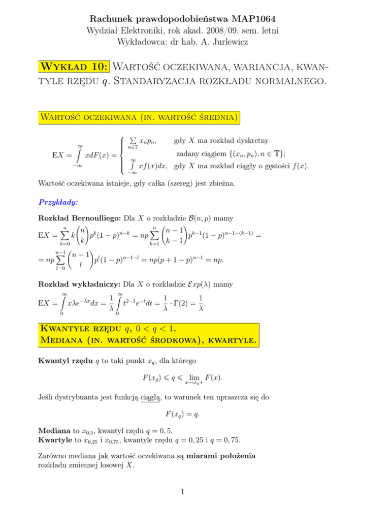 Wykład 10: Wartość oczekiwana, wariancja, kwantyle rzędu q. Standaryzacja rozkładu normalnego.