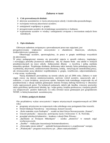 Zabawa w teatr 1.      Cele prowadzonych działań: aktywne uczestnictwo w życiu artystycznym szkoły i środowiska pozaszkolnego; rozwijanie twórczej aktywności uczniów; umiejętność współpracy w grupie; przygotowanie uczniów do świadomego uczestnictwa w kulturze; wyposażenie uczniów w wiedzę i umiejętności związane z tworzeniem małych form teatralnych; 2. Opis działania: Głównym zadaniem związanym z prowadzonymi przez nas zajęciami, jest przygotowywanie większości uroczystości o charakterze klasowym, szkolnym, środowiskowym i gminnym. Obserwując uczniów, spostrzegłyśmy, że praca w grupie mobilizuje wszystkich do aktywności. W pracy pedagogicznej staramy się prowadzić zajęcia w sposób ciekawy, inspirujący i rozwijający potrzeby poznawcze młodzieży tak, by chętnie brała ona udział w różnych przedsięwzięciach na rzecz szkoły. Jednocześnie dbamy o życzliwą i pełną zaufania atmosferę spotkań. Projektując działania, dobieramy takie metody, które pobudzają myślenie, wyobraźnię, aktywność, zainteresowanie literaturą, sztuką, motywują do samodzielnej pracy, ale równocześnie uczą młodzież współdziałania w grupie, wrażliwości, odpowiedzialności, a więc ucząc, wychowują. Naszą działalność prowadzimy na terenie szkoły już od 2004 roku. Zabawa w teatr ciągle cieszy się dużym zainteresowaniem, zarówno wśród uczniów, nauczycieli, jak i rodziców, o czym świadczą pozytywne opinie. Istnienie koła teatralnego rozpoczęło się od przedstawienia z okazji nadania gimnazjum imienia Świętej Jadwigi Królowej w obecności wielu zaproszonych gości. Na kolejnych pokazach, takich jak Jasełka, wieczory poetyckie także gościliśmy społeczność lokalną, np.: wójta gminy, księdza proboszcza z tutejszej parafii czy miejscowych poetów ludowych. Co roku również nasze gimnazjum jest gospodarzem WOŚP, w której koncertach uczestniczymy. 3. Efekty podjętych działań Oto przykładowy wykaz uroczystości i imprez artystycznych zorganizowanych od 2004 roku: programy artystyczne na rozpoczęcie roku szkolnego oraz pożegnanie klas trzecich; Dzień Edukacji Narodowej – inscenizacje, koncert życzeń; „Koło teatralne czyta Szekspira” – scenki na letni festyn Stowarzyszenia „Szansa”; wieczór poetycko – muzyczny poświęcony życiu i twórczości C. K. Norwida; przegląd szkolnych kabaretów – konkurs z okazji Dnia Wiosny; „Spotkanie ze Świętym Mikołajem” – scenka „dramowa” w ramach zajęć wychowawczych; „Jasełka” – tradycyjne inscenizacje bożonarodzeniowe; „Dzieciątko niesie miłość” – spektakl bożonarodzeniowy („współczesna” wersja); „Walentynki”- program rozrywkowy pt.: „Biuro matrymonialne”; przedstawienie teatralne pt.: „Melicerta” wg niedokończonej sztuki Moliera; inscenizacja sztuki K.I. Gałczyńskiego pt. „Babcia i wnuczek”; adaptacja bajki Jana Brzechwy pt. „Pchła Szachrajka”. przygotowywanie uczniów do roli przewodników podczas Dnia Otwartego dla szóstoklasistów; Konstytucja 3 Maja – inscenizacja „Koncertu Jankiela”; spektakle uświetniające Dzień Patrona; spektakl z okazji 30 rocznicy pontyfikatu papieża – Polaka pt.: „Kawiarniane wspomnienia o Janie Pawle II; spektakle profilaktyczne: „Mur” oraz „Hell”; współpraca z katechetami: doskonalenie umiejętności pięknego czytania przez lektorów, realizacja przedstawienia pt: „Ksiądz Piotr” z udziałem zaproszonego gościa – autora scenariusza, ks. prof. Jana Machniaka (współpracującego z Centrum Dialogu i Modlitwy w Oświęcimiu); przedstawienie pt. „Księżniczka na ziarnku grochu.”; wystawienie spektaklu kabaretowego w Centrum Kultury i Promocji; Dodatkowym efektem naszych działań były żywe komentarze ze strony uczniów na łamach szkolnej gazety „Ja, Gimnazjalista”, zamieszczane przez nich pozytywne recenzje imprez, w których podkreślali fakt angażowania wielu pierwszoklasistów. Zaowocowało to odkryciem nowych talentów aktorskich i rozwijaniem ich zainteresowań w tej dziedzinie. Na szczególną uwagę zasługuje to, że kilkoro absolwentów kontynuowało swoje pasje w Teatrze Ludowym w ramach projektu „Ukryte skrzydła” oraz podjęło naukę w szkołach o profilach artystycznych. Jako nauczyciele wychowawcy mamy okazję lepiej poznać naszych uczniów podczas realizacji zadań artystycznych, co korzystnie wpływa na codzienne relacje. Opracowanie: Beata Dzień Agnieszka Lutyńska