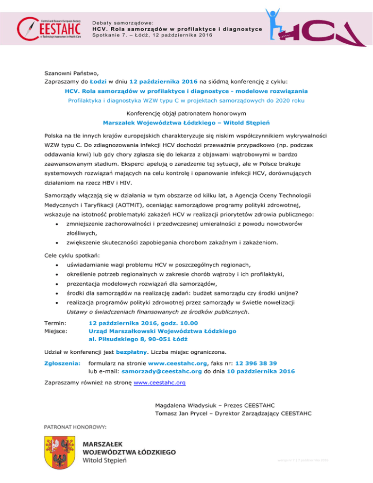 Debaty samorządowe: HCV. Rola samorządów w profilaktyce i diagnostyce Spotkanie 7. – Łódź, 12 października 2016 Szanowni Państwo, Zapraszamy do Łodzi w dniu 12 października 2016 na siódmą konferencję z cyklu: HCV. Rola samorządów w profilaktyce i diagnostyce - modelowe rozwiązania Profilaktyka i diagnostyka WZW typu C w projektach samorządowych do 2020 roku Konferencję objął patronatem honorowym Marszałek Województwa Łódzkiego – Witold Stępień Polska na tle innych krajów europejskich charakteryzuje się niskim współczynnikiem wykrywalności WZW typu C. Do zdiagnozowania infekcji HCV dochodzi przeważnie przypadkowo (np. podczas oddawania krwi) lub gdy chory zgłasza się do lekarza z objawami wątrobowymi w bardzo zaawansowanym stadium. Eksperci apelują o zaradzenie tej sytuacji, ale w Polsce brakuje systemowych rozwiązań mających na celu kontrolę i opanowanie infekcji HCV, dorównujących działaniom na rzecz HBV i HIV. Samorządy włączają się w działania w tym obszarze od kilku lat, a Agencja Oceny Technologii Medycznych i Taryfikacji (AOTMiT), oceniając samorządowe programy polityki zdrowotnej, wskazuje na istotność problematyki zakażeń HCV w realizacji priorytetów zdrowia publicznego: zmniejszenie zachorowalności i przedwczesnej umieralności z powodu nowotworów złośliwych, zwiększenie skuteczności zapobiegania chorobom zakaźnym i zakażeniom. Cele cyklu spotkań: uświadamianie wagi problemu HCV w poszczególnych regionach, określenie potrzeb regionalnych w zakresie chorób wątroby i ich profilaktyki, prezentacja modelowych rozwiązań dla samorządów, środki dla samorządów na realizację zadań: budżet samorządu czy środki unijne? realizacja programów polityki zdrowotnej przez samorządy w świetle nowelizacji Ustawy o świadczeniach finansowanych ze środków publicznych. Termin: Miejsce: 12 października 2016, godz. 10.00 Urząd Marszałkowski Województwa Łódzkiego al. Piłsudskiego 8, 90-051 Łódź Udział w konferencji jest bezpłatny. Liczba miejsc ograniczona. Zgłoszenia: formularz na stronie www.ceestahc.org, faks nr: 12 396 38 39 lub e-mail: [email protected] do dnia 10 października 2016 Zapraszamy również na stronę www.ceestahc.org Magdalena Władysiuk – Prezes CEESTAHC Tomasz Jan Prycel – Dyrektor Zarządzający CEESTAHC wersja nr 7 | 7 października 2016 Debaty samorządowe: HCV. Rola samorządów w profilaktyce i diagnostyce Spotkanie 7. – Łódź, 12 października 2016 Termin: 12 października 2016, godz. 10.00 Miejsce: Urząd Marszałkowski Województwa Łódzkiego al. Piłsudskiego 8, 90-051 Łódź Powitanie oraz wystąpienie Przedstawiciela Urzędu Marszałkowskiego 10 min. Problematyka wirusowego zapalenia wątroby 20 min. Zakażenie HCV: diagnostyka i terapia 2016 dr hab. n. med. Anna Piekarska - Kierownik Kliniki Chorób Zakaźnych i Hepatologii Uniwersytetu Medycznego w Łodzi, Ordynator Oddziału Chorób Zakaźnych dla dorosłych w WSSZ im. Biegańskiego Aspekt społeczny HCV, koszty pośrednie, w tym aktywność zawodowa i powroty do pracy 15 min. Magdalena Władysiuk – Prezes Stowarzyszenia CEESTAHC Koszty terapii wirusowych chorób wątroby z perspektywy płatnika 15 min. Małgorzata Żurawska-Klepacz - Zastępca Dyrektora do spraw Medycznych, Łódzki Oddział Wojewódzki Narodowego Funduszu Zdrowia Orzekanie o świadczeniach z ubezpieczenia społecznego w przewlekłym, wirusowym zapaleniu wątroby 10 min. prof. dr. hab. n. med. Bogdan Modzelewski - Zastępca Głównego Lekarza Orzecznika ZUS I Oddział w Łodzi, Ordynator Oddziału Klinicznego Chirurgii Gastroenterologicznej, Onkologicznej i Ogólnej w Szpitalu im. N. Barlickiego w Łodzi 15 min. Działania Państwowej Inspekcji Sanitarnej w województwie łódzkim w zapobieganiu zakażeniom HCV Urszula Sztuka-Polińska - Dyrektor Wojewódzkiej Stacji Sanitarno-Epidemiologicznej w Łodzi, Państwowy Wojewódzki Inspektor Sanitarny w Łodzi Modelowe rozwiązania dla samorządów 15 min. Tomasz Jan Prycel – Dyrektor Zarządzający Stowarzyszenia CEESTAHC Dyskusja z udziałem decydentów nt. możliwych rozwiązań i działań w regionie 30 min. wczesna diagnostyka samoświadomość pacjentów terapia i rehabilitacja rola samorządów i innych instytucji publicznych i organizacji pozarządowych rola ubezpieczyciela Podsumowanie 10min. Poczęstunek Planowany łączny czas trwania konferencji: ok. 2 godz. 20 min. wersja nr 7 | 7 października 2016 Debaty samorządowe: HCV. Rola samorządów w profilaktyce i diagnostyce Spotkanie 7. – Łódź, 12 października 2016 FORMULARZ ZGŁOSZENIOWY na cykl konferencji HCV. Rola samorządów w profilaktyce i diagnostyce Spotkanie 7. – Łódź, 12 października 2016 Zgłoszenia można dokonać na trzy sposoby: 1. wypełnić formularz elektroniczny na stronie www.ceestahc.org 2. przesłać faksem zamieszczony poniżej formularz na nr faks: 12 396 38 39 3. przesyłać dane potrzebne do zgłoszenia na e-mail: [email protected] Termin przyjmowania zgłoszeń: 10 października 2016 Po otwarciu pliku PDF programem Acrobat pojawią się aktywne pola formularza. Przy wypełnianiu ręcznym prosimy wypełniać DRUKOWANYMI LITERAMI. DANE OSOBOWE Imię i nazwisko Stanowisko / Funkcja Reprezentowana instytucja Adres instytucji Telefon kontaktowy Adres e-mail Wypełniając niniejszy formularz zgłaszam chęć udziału w konferencji edukacyjnej "HCV. Rola samorządów w profilaktyce i diagnostyce", organizowanej przez Stowarzyszenie CEESTAHC w dniu 12 października 2016 w Łodzi. Oświadczam, że zapoznałem się z warunkami udziału oraz wyrażam zgodę na przetwarzanie moich danych osobowych niezbędnych do realizacji prac nad konferencją, zgodnie z Ustawą z dnia 29 sierpnia 1997 o ochronie danych osobowych (Dz. U. 1997 r. Nr 133 poz. 833). wersja nr 7 | 7 października 2016
