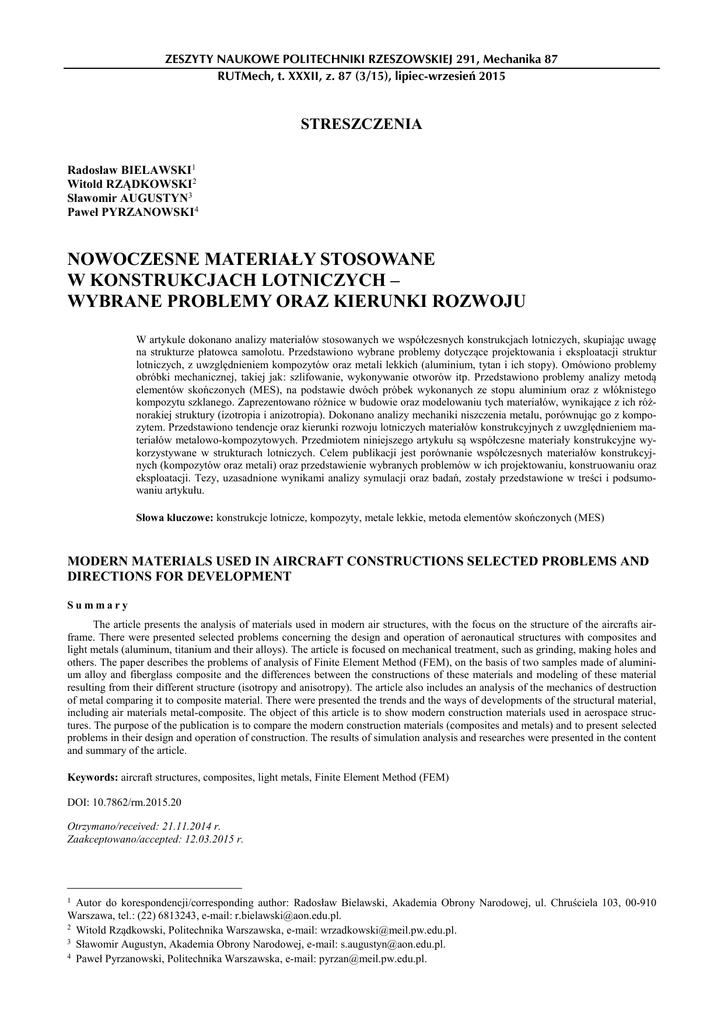 ZESZYTY NAUKOWE POLITECHNIKI RZESZOWSKIEJ 291, Mechanika 87 RUTMech, t. XXXII, z. 87 (3/15), lipiec-wrzesień 2015 STRESZCZENIA Radosław BIELAWSKI1 Witold RZĄDKOWSKI2 Sławomir AUGUSTYN3 Paweł PYRZANOWSKI4 NOWOCZESNE MATERIAŁY STOSOWANE W KONSTRUKCJACH LOTNICZYCH – WYBRANE PROBLEMY ORAZ KIERUNKI ROZWOJU W artykule dokonano analizy materiałów stosowanych we współczesnych konstrukcjach lotniczych, skupiając uwagę na strukturze płatowca samolotu. Przedstawiono wybrane problemy dotyczące projektowania i eksploatacji struktur lotniczych, z uwzględnieniem kompozytów oraz metali lekkich (aluminium, tytan i ich stopy). Omówiono problemy obróbki mechanicznej, takiej jak: szlifowanie, wykonywanie otworów itp. Przedstawiono problemy analizy metodą elementów skończonych (MES), na podstawie dwóch próbek wykonanych ze stopu aluminium oraz z włóknistego kompozytu szklanego. Zaprezentowano różnice w budowie oraz modelowaniu tych materiałów, wynikające z ich różnorakiej struktury (izotropia i anizotropia). Dokonano analizy mechaniki niszczenia metalu, porównując go z kompozytem. Przedstawiono tendencje oraz kierunki rozwoju lotniczych materiałów konstrukcyjnych z uwzględnieniem materiałów metalowo-kompozytowych. Przedmiotem niniejszego artykułu są współczesne materiały konstrukcyjne wykorzystywane w strukturach lotniczych. Celem publikacji jest porównanie współczesnych materiałów konstrukcyjnych (kompozytów oraz metali) oraz przedstawienie wybranych problemów w ich projektowaniu, konstruowaniu oraz eksploatacji. Tezy, uzasadnione wynikami analizy symulacji oraz badań, zostały przedstawione w treści i podsumowaniu artykułu. Słowa kluczowe: konstrukcje lotnicze, kompozyty, metale lekkie, metoda elementów skończonych (MES) MODERN MATERIALS USED IN AIRCRAFT CONSTRUCTIONS SELECTED PROBLEMS AND DIRECTIONS FOR DEVELOPMENT Summary The article presents the analysis of materials used in modern air structures, with the focus on the structure of the aircrafts airframe. There were presented selected problems concerning the design and operation of aeronautical structures with composites and light metals (aluminum, titanium and their alloys). The article is focused on mechanical treatment, such as grinding, making holes and others. The paper describes the problems of analysis of Finite Element Method (FEM), on the basis of two samples made of aluminium alloy and fiberglass composite and the differences between the constructions of these materials and modeling of these material resulting from their different structure (isotropy and anisotropy). The article also includes an analysis of the mechanics of destruction of metal comparing it to composite material. There were presented the trends and the ways of developments of the structural material, including air materials metal-composite. The object of this article is to show modern construction materials used in aerospace structures. The purpose of the publication is to compare the modern construction materials (composites and metals) and to present selected problems in their design and operation of construction. The results of simulation analysis and researches were presented in the content and summary of the article. Keywords: aircraft structures, composites, light metals, Finite Element Method (FEM) DOI: 10.7862/rm.2015.20 Otrzymano/received: 21.11.2014 r. Zaakceptowano/accepted: 12.03.2015 r. Autor do korespondencji/corresponding author: Radosław Bielawski, Akademia Obrony Narodowej, ul. Chruściela 103, 00-910 Warszawa, tel.: (22) 6813243, e-mail: [email protected]. 2 Witold Rządkowski, Politechnika Warszawska, e-mail: [email protected]. 3 Sławomir Augustyn, Akademia Obrony Narodowej, e-mail: [email protected]. 4 Paweł Pyrzanowski, Politechnika Warszawska, e-mail: [email protected]. 1 Paweł GIL5 Joanna WILK6 INSTALACJA CHP Z SILNIKIEM SPALINOWYM ZASILANYM GAZEM DRZEWNYM Artykuł zawiera opis koncepcji kogeneratora z silnikiem spalinowym czterosuwowym iskrowym zasilanym gazem drzewnym, pochodzącym ze zgazowania biomasy. Przedstawiono metody adaptacji silników spalinowych z zapłonem iskrowym oraz zapłonem samoczynnym do wykorzystania gazu drzewnego. Zaprezentowano problemy techniczne silników zasilanych gazem drzewnym. Słowa kluczowe: zgazowanie biomasy, CHP, skojarzone wytwarzanie energii elektrycznej i ciepła, oczyszczanie gazu drzewnego COMBINED HEAT AND POWER SYSTEM WITH COMBUSTION ENGINE FUELLED BY WOOD GAS Summary The article contains a description of the concept of CHP unit with a four-stroke internal combustion engine powered by wood gas from biomass gasification. The methods of adaptation of internal combustion spark-ignition and compression-ignition engines to using wood gas were presented. Technical problems of engines powered by wood gas were also presented. Keywords: gasification of biomass, CHP, combined production of electricity and heat, wood gas cleaning DOI: 10.7862/rm.2015.21 Otrzymano/received: 11.01.2015 r. Zaakceptowano/accepted: 12.03.2015 r. Autor do korespondencji/corresponding author: Paweł Gil, Politechnika Rzeszowska, tel.: [email protected]. 6 Joanna Wilk, Politechnika Rzeszowska, e-mail: [email protected]. 5 (17) 8651288, e-mail: gilpa- Sebastian LEPSZY7 Tadeusz CHMIELNIAK8 ANALIZA MATEMATYCZNA PRACY PROSTEJ TURBINY GAZOWEJ PO ZMIANIE PALIWA Zastosowanie biomasy do produkcji energii elektrycznej z użyciem turbin gazowych małej mocy wymaga opracowania modeli maszyn i urządzeń o odmiennej charakterystyce w stosunku do szeroko rozpowszechnionych układów lotniczych i przemysłowych wykorzystujących paliwa konwencjonalne. W celu wskazania najistotniejszych zagadnień związanych z opracowaniem nowych rozwiązań dla turbin gazowych zasilanych paliwem z biomasy, w artykule przedstawiono analizę matematyczną pracy prostej turbiny gazowej małej mocy po zmianie paliwa. W szczególności zwrócono uwagę na możliwość wystąpienia pompażu, przekroczenia dopuszczalnyc