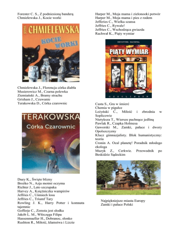 Forester C. S., Z podniesioną banderą Chmielewska J., Kocie worki Chmielewska J., Florencja córka diabła Musierowicz M., Czarna polewka Ziemiański A., Bramy strachu Grisham J., Czuwanie Terakowska D., Córka czarownic Duey K., Święte blizny Brożko N., Azja moimi oczyma Richter J., Lato szczupaka Harvey A., Księżniczka wampirów Jeffries C., Uśmiech losu Jeffries C., Triumf Tary Rowling J. K., Harry Potter i komnata tajemnic Gofferje C., Zemsta jest słodka Jakób L. M., Włóczęga Filipa Hassenmueller H., Dobranoc, słonko Rushton R., Miłość, kłamstwa i Lizzie Harper M., Moja mama i zielonooki potwór Harper M., Moja mama i pies z rodem Jefferies C., Wielka szansa Jeffries C., Rywale! Jeffries C., Wschodząca gwiazda Rachwał K., Piąty wymiar Casta S., Gra w śmierć Chemia w pigułce Leżyński C., Miłość i zbrodnia w Soplicowie Nietyksza T., Wiersze pachnące jedliną Pawlak R., Czapka Holmesa Gaworski M., Zamki, pałace i dwory Opolszczyzny Klucz gimnazjalisty. Blok humanistyczny: teoria Cronin A. Ocal planetę! Poradnik młodego ekologa Muzyk Z., Cerkwie. Przewodnik po Beskidzie Sądeckim Najpiękniejsze miasta Europy Zamki i pałace Polski
