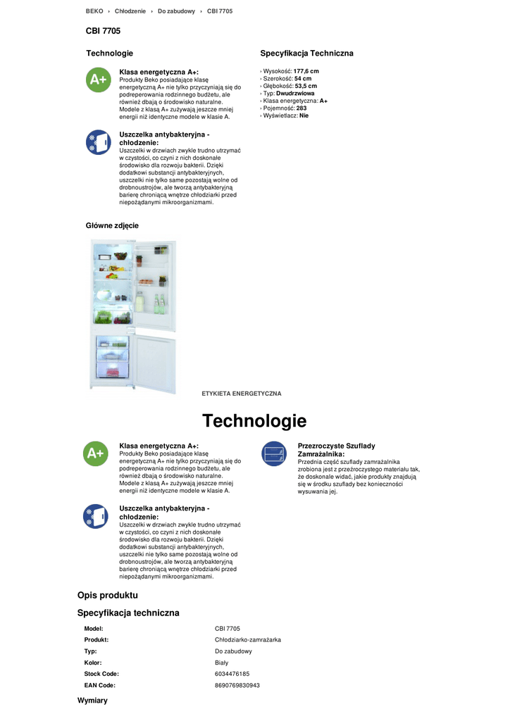 BEKO › Chłodzenie › Do zabudowy › CBI 7705 CBI 7705 Technologie Specyfikacja Techniczna Klasa energetyczna A+: Produkty Beko posiadające klasę energetyczną A+ nie tylko przyczyniają się do podreperowania rodzinnego budżetu, ale również dbają o środowisko naturalne. Modele z klasą A+ zużywają jeszcze mniej energii niż identyczne modele w klasie A. › Wysokość: 177,6 cm › Szerokość: 54 cm › Głębokość: 53,5 cm › Typ: Dwudrzwiowa › Klasa energetyczna: A+ › Pojemność: 283 › Wyświetlacz: Nie Uszczelka antybakteryjna chłodzenie: Uszczelki w drzwiach zwykle trudno utrzymać w czystości, co czyni z nich doskonałe środowisko dla rozwoju bakterii. Dzięki dodatkowi substancji antybakteryjnych, uszczelki nie tylko same pozostają wolne od drobnoustrojów, ale tworzą antybakteryjną barierę chroniącą wnętrze chłodziarki przed niepożądanymi mikroorganizmami. Główne zdjęcie ETYKIETA ENERGETYCZNA Technologie Klasa energetyczna A+: Produkty Beko posiadające klasę energetyczną A+ nie tylko przyczyniają się do podreperowania rodzinnego budżetu, ale również dbają o środowisko naturalne. Modele z klasą A+ zużywają jeszcze mniej energii niż identyczne modele w klasie A. Uszczelka antybakteryjna chłodzenie: Uszczelki w drzwiach zwykle trudno utrzymać w czystości, co czyni z nich doskonałe środowisko dla rozwoju bakterii. Dzięki dodatkowi substancji antybakteryjnych, uszczelki nie tylko same pozostają wolne od drobnoustrojów, ale tworzą antybakteryjną barierę chroniącą wnętrze chłodziarki przed niepożądanymi mikroorganizmami. Opis produktu Specyfikacja techniczna Model: CBI 7705 Produkt: Chłodziarko-zamrażarka Typ: Do zabudowy Kolor: Biały Stock Code: 6034476185 EAN Code: 8690769830943 Wymiary Przezroczyste Szuflady Zamrażalnika: Przednia część szuflady zamrażalnika zrobiona jest z przeźroczystego materiału tak, że doskonale widać, jakie produkty znajdują się w środku szuflady bez konieczności wysuwania jej. Wysokość: 177,6 cm Szerokość: 54 cm Głębokość: 53,5 cm Waga netto: 55 kg Pojemność Pojemność całkowita brutto: 283 l Pojemność chłodziarki netto: 189 l Pojemność zamrażarki netto: 55 l Parametry Klasa efektywności energetycznej: A+ Zużycie energii na dobę (kWh): 0,742 kWh Zużycie energii na rok (kWh): 271 kWh Zdolność zamrażania (kg/24 godz.): 4 kg/24 godz. Czas przechowywania bez zasilania (godz.): 20 godz. Sterowanie: Mechaniczne System chłodzenia: Statyczny Czynnik chłodniczy: R600a Poziom hałasu [dB(A)]: 38 dB(A) Specyfikacja Możliwość przełożenia drzwi: Tak Wyświetlacz elektroniczny: Nie Dozownik wody: Nie Specyfikacja - Chłodziarka Oświetlenie wnętrza: Standardowe Komora 0°C: Nie Filtr antyzapachowy: Nie Aktywny jonizator: Nie Uszczelka antybakteryjna: Tak Niebieskie światło: Nie Pojemnik na warzywa i owoce: 2 Półki: 4 Uchwyt na butelkę: Nie Chromowana półka na butelki: Nie Półki na drzwiach: 4 Easy Boxes: Nie Pojemnik na nabiał: Nie Tacka na jajka: Tak Rozmrażanie: Automatyczne Specyfikacja - Zamrażarka Liczba pełnych suflad: 3 Liczba komór: 0 Kostki lodu: tacka na lód Rozmrażanie: Manualne Komora szybkiego mrożenia: Nie Informacje produktowe zawarte na stronie internetowej mają charakter poglądowy i mogą odbiegać od rzeczywistości | Informacje o plikach cookies projekt i realizacja 4 All Multimedia