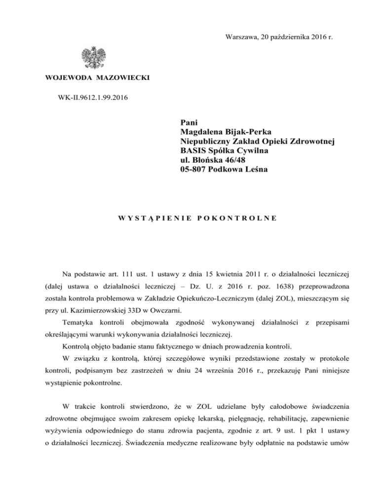 Warszawa, 20 października 2016 r. WOJEWODA MAZOWIECKI WK-II.9612.1.99.2016 Pani Magdalena Bijak-Perka Niepubliczny Zakład Opieki Zdrowotnej BASIS Spółka Cywilna ul. Błońska 46/48 05-807 Podkowa Leśna WYSTĄPIENIE POKONTROLNE Na podstawie art. 111 ust. 1 ustawy z dnia 15 kwietnia 2011 r. o działalności leczniczej (dalej ustawa o działalności leczniczej – Dz. U. z 2016 r. poz. 1638) przeprowadzona została kontrola problemowa w Zakładzie Opiekuńczo-Leczniczym (dalej ZOL), mieszczącym się przy ul. Kazimierzowskiej 33D w Owczarni. Tematyka kontroli obejmowała zgodność wykonywanej działalności z przepisami określającymi warunki wykonywania działalności leczniczej. Kontrolą objęto badanie stanu faktycznego w dniach prowadzenia kontroli. W związku z kontrolą, której szczegółowe wyniki przedstawione zostały w protokole kontroli, podpisanym bez zastrzeżeń w dniu 24 września 2016 r., przekazuję Pani niniejsze wystąpienie pokontrolne. W trakcie kontroli stwierdzono, że w ZOL udzielane były całodobowe świadczenia zdrowotne obejmujące swoim zakresem opiekę lekarską, pielęgnację, rehabilitację, zapewnienie wyżywienia odpowiedniego do stanu zdrowia pacjenta, zgodnie z art. 9 ust. 1 pkt 1 ustawy o działalności leczniczej. Świadczenia medyczne realizowane były odpłatnie na podstawie umów cywilnoprawnych podpisywanych z pacjentami. Pomieszczenia ZOL spełniały wymagania określone w rozporządzeniu Ministra Zdrowia z dnia 26 czerwca 2012 r. w sprawie szczegółowych wymagań, jakim powinny odpowiadać pomieszczenia i urządzenia podmiotu wykonującego działalność leczniczą (Dz. U. z 2012 r. poz. 739). Warunki bytowe pacjentów były dobre, a pomieszczenia kontrolowanej placówki utrzymane były w porządku i czystości – ich stan sanitarno-higieniczny w dniach prowadzenia kontroli nie budził zastrzeżeń. Dla potrzeb ZOL zapewniono pomieszczenie specjalnie przeznaczone na przechowywanie zwłok osoby zmarłej w okresie pomiędzy stwierdzeniem zgonu a przewiezieniem ich do chłodni, zapewniające godność należną zmarłemu, zgodnie z § 3 ust. 8 rozporządzenia Ministra Zdrowia z dnia 10 kwietnia 2012 r. w sprawie sposobu postępowania podmiotu leczniczego wykonującego działalność leczniczą w rodzaju stacjonarne i całodobowe świadczenia zdrowotne ze zwłokami pacjenta w przypadku śmierci pacjenta (Dz. U. z 2012 r. poz. 420). Podmiot posiadał zawartą umowę ubezpieczenia odpowiedzialności cywilnej, zgodnie z obowiązkiem ustalonym w art. 25 ust. 1 pkt 1 i ust. 2 ustawy o działalności leczniczej. W kontrolowanej placówce umieszczono informację o prawach pacjenta, zgodnie z wymogiem określonym w art. 11 ust. 1 ustawy z dnia 6 listopada 2008 r. o prawach pacjenta i Rzeczniku Praw Pacjenta (Dz. U. z 2016 r. poz. 186.). W dniach prowadzenia kontroli w ZOL przebywało 29 pacjentów – 22 kobiety i 7 mężczyzn. Pacjentami kontrolowanej placówki były głównie osoby, u których zdiagnozowano zespół otępienny, chorobę Alzheimera, chorobę Parkinsona i zaburzenia depresyjne. Grupę chorych stanowiły osoby po przebytym udarze mózgu, po złamaniu szyjki kości udowej oraz po urazie miednicy, wymagające pielęgnacji i usprawniania. U chorych zdiagnozowano również choroby układu krążenia – niewydolność krążenia, miażdżycę uogólnioną, nadciśnienie tętnicze, zaburzenia rytmu serca, jak również niewydolność nerek, przerost gruczołu krokowego, jaskrę, zwyrodnienia stawów i cukrzycę. Podawania insuliny wymagał 1 pacjent. Piętnastu pacjentów funkcjonowało samodzielnie, a okresowej pomocy kadry medycznej wymagało 14 chorych poruszających się przy pomocy sprzętu rehabilitacyjnego. Podopieczni przebywający w placówce mieli zabezpieczony dostęp do całodobowej opieki lekarskiej, jak również do usług pielęgniarskich i rehabilitacyjnych. Świadczenia zdrowotne realizowane były przez 2 lekarzy – specjalistę medycyny rodzinnej i onkologa, którzy jednocześnie posiadali I specjalizacji w dziedzinie chorób wewnętrznych. Opiekę sprawowało 7 pielęgniarek, z których pięć ukończyło kurs kwalifikacyjny w zakresie pielęgniarstwa środowiskoworodzinnego. Opieka pielęgniarska sprawowana była w systemie 12-godzinnych dyżurów dziennych i nocnych – każdorazowo dyżur pełniła 1 pielęgniarka. 2 Świadczenia rehabilitacyjne realizowane były przez magistra rehabilitacji i technika rehabilitacji – w zależności od stanu pacjentów – na świetlicy bądź przy łóżku pacjenta. Wyżywienie pacjentów uwzględniało dietę lekkostrawną, cukrzycową oraz niskobiałkową a okazany niesięczny jadłospis sporządzany był przez lekarza – specjalistę medycyny rodzinnej. W ZOL prowadzone były działania w zakresie promocji zdrowia, ze szczególnym uwzględnieniem prawidłowego żywienia, zdrowego stylu życia, zagadnień związanych z problemami zdrowotnymi wieku starczego oraz przygotowaniem pacjenta do samoopieki i samopielęgnacji w warunkach domowych. W dokumentacji podmiotu leczniczego zgromadzono dokumenty potwierdzające prawo wykonywania zawodu aktualnie zatrudnionych lekarzy i kadry pielęgniarskiej. ZOL dysponował dokumentacją potwierdzającą sprawność techniczną aparatury i sprzętu medycznego wykorzystywanego przy udzielaniu świadczeń medycznych, do której posiadania i okazania organowi kontroli podmiot jest zobowiązany na podstawie art. 90 ust. 6, 7 i 9 ustawy z dnia 20 maja 2010 r. o wyrobach medycznych (Dz. U. z 2015 r. poz. 876, z późn. zm.). Dokumentacja medyczna przechowywana była zgodnie z zasadami ustalonymi w rozporządzeniu Ministra Zdrowia z dnia 9 listopada 2015 r. w sprawie rodzajów, zakresu i wzorów dokumentacji medycznej oraz sposobu jej przetwarzania (dalej rozporządzenie w sprawie rodzajów, zakresu i wzorów dokumentacji medycznej – Dz. U. z 2015 r. poz. 2069). W wyniku kontroli stwierdzono następujące nieprawidłowości: 1. Niezgłoszenie zm