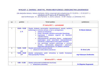 WYKŁADY Z ZAKRESU BIOETYKI, PRAWA MEDYCZNEGO i ORZECZNICTWA LEKARSKIEGO (dla stażystów lekarzy i lekarzy dentysów, którzy rozpoczęli staż podyplomowy 01.10.2016 r. i 01.03.2017 r.) - szkolenie od 27 marca do 07 kwietnia 2017 r. sala konferencyjna im. Jana Rymiana w „Domu Lekarza”, 10-561 Olsztyn, ul. Żołnierska 16 C. Lp. godzina Temat wykładu wykładowca 27 marca 2017 r. – poniedziałek 1. 10.00 – 12.00 2 P 2. 12.00 – 14.00 3. 2P 14.00 – 16.00 2P Zasady działania samorządów reprezentujących zawody zaufania publicznego w ochronie zdrowia, w tym w szczególności: zadania izb lekarskich, prawa i obowiązki członków samorządu lekarskiego, organizacja i działanie organów izb lekarskich i zjazdów lekarzy, odpowiedzialność zawodowa lekarzy - postępowanie wyjaśniające przed rzecznikiem odpowiedzialności zawodowej, postępowanie przed sądem lekarskim, inne samorządy zaufania publicznego w ochronie zdrowia – farmaceutów, pielęgniarek i położnych, diagnostów laboratoryjnych, ich zadania i struktura. Zasady wykonywania zawodu lekarza: ustawiczne doskonalenie zawodowe Zasady sprawowania opieki zdrowotnej w świetle Konstytucji Rzeczypospolitej Polskiej. Dr Marek Zabłocki Dr Anna Lella mgr Katarzyna Godlewska 28 marca 2017 r. – wtorek 1. 8.00 – 12.00 Zasady wykonywania działalności leczniczej: świadczenia zdrowotne, Dr Zbigniew Gugnowski 4P podmioty lecznicze – rejestracja, zasady działania, szpitale kliniczne, nadzór, dokumentacja medyczna, nadzór specjalistyczny, działalność lecznicza lekarza, lekarza dentysty w formie wykonywania praktyki zawodowej. 2. 12.00 – 13.00 1B Europejska konwencja bioetyczna. 3. 13.00 - 15.00 Etyczne aspekty relacji lekarz-pacjent - autonomia i godność pacjenta, informacja i zgoda poinformowanego, tajemnica lekarska, lojalność wobec pacjenta, prawo lekarza do odmowy leczenia. Dr Beata Kosiba Etyczne aspekty problemu umierania. Problem godności umierania. Problem eutanazji w świetle medycyny hipokratejskiej. Dr Beata Kosiba 2B 4. 15.00 – 16.00 Dr n. med. Ryszard Targoński 1B 29 maca 2017 r. – środa 1. 08.00 – 11.00 3P 2. 3. 11.00 – 13.00 2P 13.00 – 16.00 3B Zasady powszechnego ubezpieczenia zdrowotnego, w szczególności: prawa i obowiązki osoby ubezpieczonej i lekarza ubezpieczenia zdrowotnego, organizacja udzielania i zakres świadczeń z tytułu ubezpieczenia zdrowotnego, dokumentacja związana z udzielaniem świadczeń z tytułu ubezpieczenia. Uregulowania szczególne dotyczące postępowania lekarza w ustawach, w tym w szczególności: o sztucznej prokreacji, przerywania ciąży. Prokreacja ludzka – aspekty etyczne działań lekarskich związane z ludzka prokreacją w świetle Kodeksu Etyki Lekarskiej. Problemy etyczne wspomaganej prokreacji. Problem klonowania ludzi w świetle Dr Andrzej Zakrzewski Dr n. med. Grzegorz Roman Dr n. med. Grzegorz Roman Kodeksu Etyki Lekarskiej i Europejskiej konwencji biotycznej. 30 marca 2017 r. – czwartek 1. 2. 08.00 – 09.00 1P Uregulowania szczególne dotyczące postępowania lekarza w ustawach, w tym w szczególności niektórych chorób zakaźnych. 09.00 – 10.00 Uregulowania szczególne dotyczące postępowania w ustawach, w tym w szczególności: leczenia paliatywnego i stanów terminalnych. 1P 3. 10.00 – 12.00 2B 4. 12.00 – 13.00 1P 5. 13.00 – 16.00 3P Lek Piotr Kocbach lekarza Dr Beata Kosiba Etyczna problematyka związana z reanimacją i uporczywą terapią – wartość i jakość życia ludzkiego. Wskazania do reanimacji w świetle Kodeksu Etyki Lekarskiej, kryteria śmierci, pojęcie stanu terminalnego. Problem moralnego prawa odstąpienia od reanimacji i uporczywej terapii. Uregulowania szczególne dotyczące postępowania lekarza w ustawach, w tym w szczególności: przeszczepiania narządów i tkanek, zabiegów estetycznych. Odpowiedzialność prawna lekarza - karna, cywilna i zawodowa: pojęcie wykroczenia zawodowego, naruszenie dóbr osobistych, szkody, winy, odszkodowania i zadośćuczynienia. Dr Iwona Podlińska Dr Iwona Podlińska mgr Katarzyna Godlewska 31 marca 2017 r. – piątek 1. 9.00 – 11.00 2B Etyczne aspekty walki z bólem. Etyczne aspekty paliatywnego. Leczenie hospicyjne z punktu widzenia etyki. 2. 11.00 – 13.00 Cnoty i ideały w życiu zawodowym lekarza. Pojęcie godności zawodu lekarza. Wzorce postaw godnych naśladowania. Wybrane dane z historii medycyny w zakresie pojęć bioetycznych. Kazusy w bioetyce. 2B leczenia Dr Beata Kosiba Dr Zygmunt Trusewicz 3. 13.00 - 16.00 3B Przysięga i przykazanie Hipokratesa, Powszechna Deklaracja Praw Człowieka, Deklaracja helsińska i tokijska, polskie kodeksy etyki lekarskiej – przedwojenny Kodeks Izb Lekarskich, Zbiór zasad etyczno-deonotologicznych polskiego lekarza, Kodeks Etyki Lekarskiej. Dr Beata Kosiba 03 kwietnia 2017 r. – poniedziałek 1. 8.00 - 11.00 3B 2. 11.00 – 12.00 1P 3. 09.00 – 10.00 1B Etyczne aspekty eksperymentów medycznych – eksperyment leczniczy i badawczy, etyczne zasady prowadzenia eksperymentu medycznego. Etyczne aspekty pobierania tkanek i narządów do transplantacji. Odpowiedzialność prawna lekarza - karna, cywilna i zawodowa: ubezpieczenie od odpowiedzialności cywilnej lekarza, grupowej praktyki lekarskiej, innych podmiotów wykonujących działalność leczniczą. Problemy etyczne dotyczące racjonowania metod leczenia i alokacji środków finansowych. Dr n. med. Beata JanuszkoGiergielewicz mgr Tomasz Kozak Dr Wojciech Dobrzeniecki 04 kwietnia 2017 r. – wtorek 1. 8.00 - 11.00 3P 2. 11.00 – 12.00 Zasady wykonywania zawodu lekarza: definicja zawodu lekarza, prawo wykonywania zawodu, uprawnienia zawodowe lekarza, kwalifikacje zawodowe, eksperyment medyczny, dokumentacja medyczna, lekarz a prawa pacjenta, stwierdzenie zgonu i ustalenie przyczyny zgonu. Uregulowania szczególne dotyczące postępowania w ustawach, w tym w szczególności: Dr Zbigniew Gugnowski lekarza Dr Stanisław Adamowicz 3. 1P 12.00 – 13.00 1P 4. 13