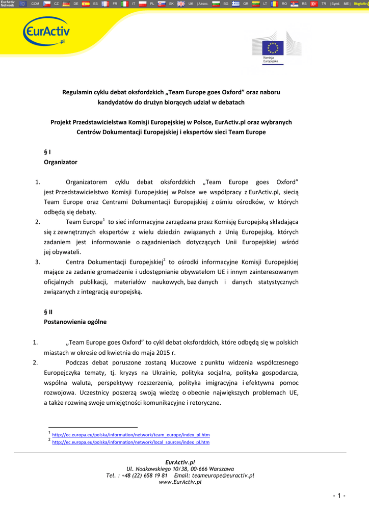 - 1 - Regulamin cyklu debat oksfordzkich „Team Europe goes Oxford
