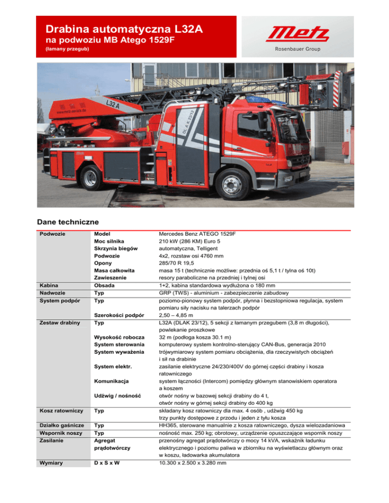 Drabina automatyczna L32A na podwoziu MB Atego 1529F (łamany przegub) Dane techniczne Podwozie Kabina Nadwozie System podpór Model Moc silnika Skrzynia biegów Podwozie Opony Masa całkowita Zawieszenie Obsada Typ Typ Zestaw drabiny Szerokości podpór Typ Wysokość robocza System sterowania System wyważenia System elektr. Komunikacja Udźwig / nośność Kosz ratowniczy Typ Działko gaśnicze Wspornik noszy Zasilanie Typ Typ Agregat prądotwórczy Wymiary DxSxW Mercedes Benz ATEGO 1529F 210 kW (286 KM) Euro 5 automatyczna, Telligent 4x2, rozstaw osi 4760 mm 285/70 R 19,5 masa 15 t (technicznie możliwe: przednia oś 5,1 t / tylna oś 10t) resory paraboliczne na przedniej i tylnej osi 1+2, kabina standardowa wydłużona o 180 mm GRP (TWS) - aluminium - zabezpieczenie zabudowy poziomo-pionowy system podpór, płynna i bezstopniowa regulacja, system pomiaru siły nacisku na talerzach podpór 2,50 – 4,85 m L32A (DLAK 23/12), 5 sekcji z łamanym przegubem (3,8 m długości), powlekanie proszkowe 32 m (podłoga kosza 30.1 m) komputerowy system kontrolno-sterujący CAN-Bus, generacja 2010 trójwymiarowy system pomiaru obciążenia, dla rzeczywistych obciążeń i sił na drabinie zasilanie elektryczne 24/230/400V do górnej części drabiny i kosza ratowniczego system łączności (Intercom) pomiędzy głównym stanowiskiem operatora a koszem otwór nośny w bazowej sekcji drabiny do 4 t, otwór nośny w górnej sekcji drabiny do 400 kg składany kosz ratowniczy dla max. 4 osób , udźwig 450 kg trzy punkty dostępowe z przodu i jeden z tyłu kosza HH365, sterowane manualnie z kosza ratowniczego, dysza wielozadaniowa nośność max. 250 kg; obrotowy, urządzenie opuszczające wspornik noszy przenośny agregat prądotwórczy o mocy 14 kVA, wskaźnik ładunku elektrycznego i poziomu paliwa w zbiorniku na wyświetlaczu głównym oraz w koszu, ładowarka akumulatora 10.300 x 2.500 x 3.280 mm Drabina automatyczna L32A na podwoziu MB Atego 1529F (łamany przegub) Wyposażenie dodatkowe, opcjonalne Nadwozie wykonane z TWS (GRP) i aluminium Wentylator oddymiający Rosenbauer Fanergy E16R, włącznie ze stelażem montażowym na koszu Przednie oświetlenie alarmowe na dachu kabiny oraz na podstawie obrotowej w technologii LED Przenośny agregat prądotwórczy Rosenbauer, typ RS14 podłączony do systemu CAN-Bus Kamera cofania – wyświetlacz w kabinie Kamera na przedzie kosza, wyświetlacz na głównym stanowisku operatora Kamera obserwacji kosza, wyświetlacz na głównym stanowisku operatora Wyświetlacze na obu panelach sterowania podporami Oświetlenie LED dla: talerzy podpór hydraulicznych, wnętrza kosza, bazowej sekcji drabiny Oświetlenie robocze LED, 2 lampy na przedzie kosza oraz 2 pod koszem Zewnętrzne oświetlenie LED po lewej i prawej stronie kosza Oświetlenie pola pracy w LED zgodnie z EN 1846T2 Oświetlenie kierowania ruchem (LED, żółte) w tylnej części podstawy obrotowej Wspornik noszy Kombi odpowiedni również dla noszy kubełkowych ARF (Automatic Return -Function) - funkcja automatycznego powrotu TMS (Target Memory System) - system pamięci celu VRS (Vertical Rescue-System) - pionowy system ratowniczy Kontakt METZ Aerials GmbH & Co. KG Carl-Metz-Strasse 9 76185 Karlsruhe, Niemcy Tel.: + 49 (0)721 5965-0 Fax: + 49 (0)721 5965-238 www.metz-aerials.com Tekst i ilustracje nie są wiążące. Zdjęcia i rysunki mogą ukazywać opcjonalne wyposażenie, dostępne wyłącznie za dodatkową opłatą. Rosenbauer rezerwuje sobie prawo do zmian w powyższej specyfikacji i wymiarów bez wcześniejszego powiadomienia. BIURO HANDLOWE: ul. Konarskiego 50 05-092 Łomianki tel./fax. (022) 751-68-95 [email protected] www.steo.com.pl
