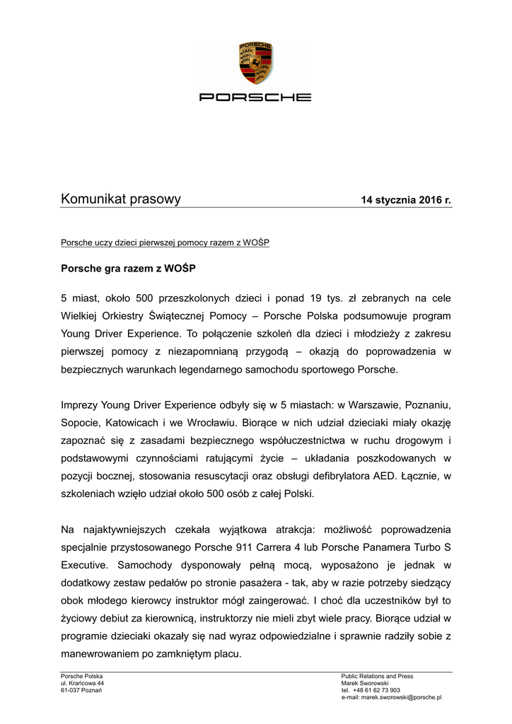 Komunikat prasowy 14 stycznia 2016 r. Porsche uczy dzieci pierwszej pomocy razem z WOŚP Porsche gra razem z WOŚP 5 miast, około 500 przeszkolonych dzieci i ponad 19 tys. zł zebranych na cele Wielkiej Orkiestry Świątecznej Pomocy – Porsche Polska podsumowuje program Young Driver Experience. To połączenie szkoleń dla dzieci i młodzieży z zakresu pierwszej pomocy z niezapomnianą przygodą – okazją do poprowadzenia w bezpiecznych warunkach legendarnego samochodu sportowego Porsche. Imprezy Young Driver Experience odbyły się w 5 miastach: w Warszawie, Poznaniu, Sopocie, Katowicach i we Wrocławiu. Biorące w nich udział dzieciaki miały okazję zapoznać się z zasadami bezpiecznego współuczestnictwa w ruchu drogowym i podstawowymi czynnościami ratującymi życie – układania poszkodowanych w pozycji bocznej, stosowania resuscytacji oraz obsługi defibrylatora AED. Łącznie, w szkoleniach wzięło udział około 500 osób z całej Polski. Na najaktywniejszych czekała wyjątkowa atrakcja: możliwość poprowadzenia specjalnie przystosowanego Porsche 911 Carrera 4 lub Porsche Panamera Turbo S Executive. Samochody dysponowały pełną mocą, wyposażono je jednak w dodatkowy zestaw pedałów po stronie pasażera - tak, aby w razie potrzeby siedzący obok młodego kierowcy instruktor mógł zaingerować. I choć dla uczestników był to życiowy debiut za kierownicą, instruktorzy nie mieli zbyt wiele pracy. Biorące udział w programie dzieciaki okazały się nad wyraz odpowiedzialne i sprawnie radziły sobie z manewrowaniem po zamkniętym placu. Porsche Polska ul. Krańcowa 44 61-037 Poznań Public Relations and Press Marek Sworowski tel. +48 61 62 73 903 e-mail: [email protected] Rodzice dzieci, które nie brały udziału w szkoleniach, a chciały spełnić swoje marzenie i przygodę z samochodami zacząć od Porsche, mogli wziąć udział w specjalnych aukcjach Allegro zorganizowanych z okazji 24. Finału WOŚP. Dodatkowo, Porsche Polska przekazało na licytację na rzecz Orkiestry jedno miejsce na tegorocznym wyjeździe z serii Porsche On Track do Stambułu, gdzie na torze Formuły 1, w wyczynowych warunkach, będzie można przetestować samochody Porsche. Na chwilę obecną dochód ze wszystkich aukcji przekroczył już 19 000 zł. Szkolenie nadal można licytować pod adresem: http://aukcje.wosp.org.pl/szkolenie-na-torze-formuly-1-w-stambule-i2604107 Zapraszamy również do obejrzenia relacji wideo z tego charytatywnego wydarzenia: https://www.youtube.com/watch?v=_gGqnA4VjRw
