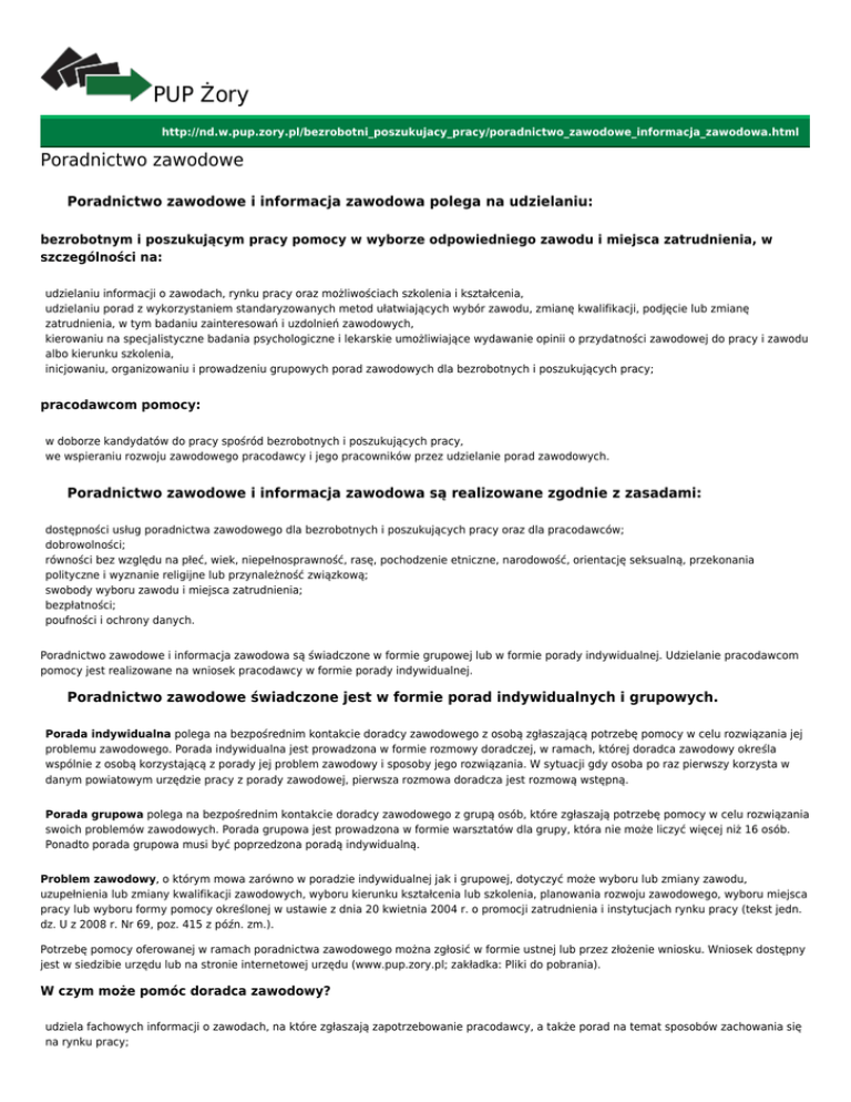 PUP Żory http://nd.w.pup.zory.pl/bezrobotni_poszukujacy_pracy/poradnictwo_zawodowe_informacja_zawodowa.html Poradnictwo zawodowe Poradnictwo zawodowe i informacja zawodowa polega na udzielaniu: bezrobotnym i poszukującym pracy pomocy w wyborze odpowiedniego zawodu i miejsca zatrudnienia, w szczególności na: udzielaniu informacji o zawodach, rynku pracy oraz możliwościach szkolenia i kształcenia, udzielaniu porad z wykorzystaniem standaryzowanych metod ułatwiających wybór zawodu, zmianę kwalifikacji, podjęcie lub zmianę zatrudnienia, w tym badaniu zainteresowań i uzdolnień zawodowych, kierowaniu na specjalistyczne badania psychologiczne i lekarskie umożliwiające wydawanie opinii o przydatności zawodowej do pracy i zawodu albo kierunku szkolenia, inicjowaniu, organizowaniu i prowadzeniu grupowych porad zawodowych dla bezrobotnych i poszukujących pracy; pracodawcom pomocy: w doborze kandydatów do pracy spośród bezrobotnych i poszukujących pracy, we wspieraniu rozwoju zawodowego pracodawcy i jego pracowników przez udzielanie porad zawodowych. Poradnictwo zawodowe i informacja zawodowa są realizowane zgodnie z zasadami: dostępności usług poradnictwa zawodowego dla bezrobotnych i poszukujących pracy oraz dla pracodawców; dobrowolności; równości bez względu na płeć, wiek, niepełnosprawność, rasę, pochodzenie etniczne, narodowość, orientację seksualną, przekonania polityczne i wyznanie religijne lub przynależność związkową; swobody wyboru zawodu i miejsca zatrudnienia; bezpłatności; poufności i ochrony danych. Poradnictwo zawodowe i informacja zawodowa są świadczone w formie grupowej lub w formie porady indywidualnej. Udzielanie pracodawcom pomocy jest realizowane na wniosek pracodawcy w formie porady indywidualnej. Poradnictwo zawodowe świadczone jest w formie porad indywidualnych i grupowych. Porada indywidualna polega na bezpośrednim kontakcie doradcy zawodowego z osobą zgłaszającą potrzebę pomocy w celu rozwiązania jej problemu zawodowego. Porada indywidualna jest prowadzona w formie rozmowy doradczej, w ramach, której doradca zawodowy określa wspólnie z osobą korzystającą z porady jej problem zawodowy i sposoby jego rozwiązania. W sytuacji gdy osoba po raz pierwszy korzysta w danym powiatowym urzędzie pracy z porady zawodowej, pierwsza rozmowa doradcza jest rozmową wstępną. Porada grupowa polega na bezpośrednim kontakcie doradcy zawodowego z grupą osób, które zgłaszają potrzebę pomocy w celu rozwiązania swoich problemów zawodowych. Porada grupowa jest prowadzona w formie warsztatów dla grupy, która nie może liczyć więcej niż 16 osób. Ponadto porada grupowa musi być poprzedzona poradą indywidualną. Problem zawodowy, o którym mowa zarówno w poradzie indywidualnej jak i grupowej, dotyczyć może wyboru lub zmiany zawodu, uzupełnienia lub zmiany kwalifikacji zawodowych, wyboru kierunku kształcenia lub szkolenia, planowania rozwoju zawodowego, wyboru miejsca pracy lub wyboru formy pomocy określonej w ustawie z dnia 20 kwietnia 2004 r. o promocji zatrudnienia i instytucjach rynku pracy (tekst jedn. dz. U z 2008 r. Nr 69, poz. 415 z późn. zm.). Potrzebę pomocy oferowanej w ramach poradnictwa zawodowego można zgłosić w formie ustnej lub przez złożenie wniosku. Wniosek dostępny jest w siedzibie urzędu lub na stronie internetowej urzędu (www.pup.zory.pl; zakładka: Pliki do pobrania). W czym może pomóc doradca zawodowy? udziela fachowych informacji o zawodach, na które zgłaszają zapotrzebowanie pracodawcy, a także porad na temat sposobów zachowania się na rynku pracy; służy poradą w zakresie określenia możliwości rozwiązania sytuacji bezrobotnego; niesie wsparcie wszystkim tym, którzy w nowej rzeczywistości nie potrafią się odnaleźć na zmienionym rynku pracy; pomaga w podjęciu decyzji dotyczącej przekwalifikowania, przyuczenia do zawodu. Informuje o możliwościach kształcenia, szkolenia, podnoszenia już posiadanych kwalifikacji zawodowych. Skontaktuj się z Doradcą Zawodowym, gdy… oczekujesz pomocy w: podjęciu decyzji o wyborze zawodu; podjęciu decyzji o zmianie zawodu; określeniu zainteresowań i predyspozycji zawodowych; przygotowaniu do rozmowy kwalifikacyjnej. Poszukujesz informacji na temat: zadań i czynności wykonywanych w danym zawodzie; instytucji kształcących w danym zawodzie; możliwości podnoszenia kwalifikacji zawodowych; szans zatrudnienia w poszczególnych zawodach na lokalnym rynku pracy. Chcesz się dowiedzieć: jak skutecznie szukać pracy; jak sporządzać dokumenty niezbędne przy poszukiwaniu pracy (życiorys zawodowy – CV, list motywacyjny, własna oferta); jakie wymagania stawiają pracodawcy kandydatom do pracy. U doradcy zawodowego dostępne są zbiory informacji zawodowych: 1. 2. 3. 4. 5. 6. 7. 8. 9. 10. 11. 12. 13. 14. przewodnik po zawodach i specjalnościach; teczki informacji o zawodach, zawierające opisy czynności, zadań, wymagań, dróg kształcenia i podnoszenia kwalifikacji; klasyfikacja zawodów i specjalności MPiPS; informator o szkołach, instytucjach szkoleniowych oraz stowarzyszeniach zawodowych; informacje o lokalnym rynku pracy; informacje o zakresie i formach działania instytucji publicznych, które mogą być przydatne w rozwiązywaniu problemów zawodowych; wzory życiorysów zawodowych i listów motywacyjnych; informacje o metodach i sposobach poszukiwania pracy w kraju i za granicą, w tym przez sieć EURES; informacje o warunkach prowadzenia działalności gospodarczej, w tym o przepisach prawnych, procedurach postępowania i wzorach dokumentów; informacje o instytucjach i organizacjach, które mogą wspierać indywidualne działania związane z rozwiązywaniem problemów zawodowych, poszukiwaniem pracy lub podejmowaniem działalności gospodarczej; filmy o zawodach oraz filmy instruktażowe dotyczące np.: rozmowy kwalifikacyjnej, autoprezentacji, asertywności, marketingu; program komputerowy, który um