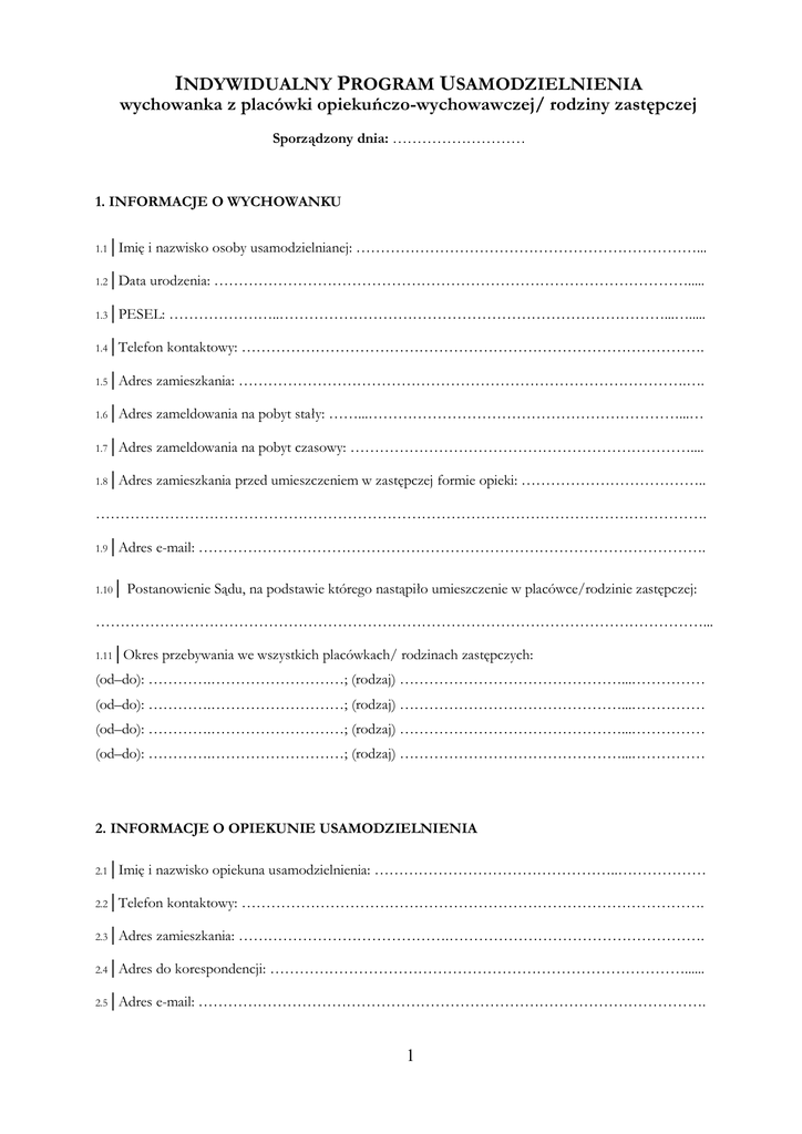 INDYWIDUALNY PROGRAM USAMODZIELNIENIA wychowanka z placówki opiekuńczo-wychowawczej/ rodziny zastępczej Sporządzony dnia: ……………………… 1. INFORMACJE O WYCHOWANKU 1.1│Imię i nazwisko osoby usamodzielnianej: ……………………………………………………………... 1.2│Data urodzenia: ……………………………………………………………………………………..... 1.3│PESEL: …………………..……………………………………………………………………...…..... 1.4│Telefon kontaktowy: …………………………………………………………………………………. 1.5│Adres zamieszkania: ……………………………………………………………………………….…. 1.6│Adres zameldowania na pobyt stały: ……...………………………………………………………...… 1.7│Adres zameldowania na pobyt czasowy: …………………………………………………………….... 1.8│Adres zamieszkania przed umieszczeniem w zastępczej formie opieki: ……………………………….. ……………………………………………………………………………………………………………. 1.9│Adres 1.10│ e-mail: …………………………………………………………………………………………. Postanowienie Sądu, na podstawie którego nastąpiło umieszczenie w placówce/rodzinie zastępczej: ……………………………………………………………………………………………………………... 1.11│Okres przebywania we wszystkich placówkach/ rodzinach zastępczych: (od–do): ………….………………………; (rodzaj) ………………………………………...…………… (od–do): ………….………………………; (rodzaj) ………………………………………...…………… (od–do): ………….………………………; (rodzaj) ………………………………………...…………… (od–do): ………….………………………; (rodzaj) ………………………………………...…………… 2. INFORMACJE O OPIEKUNIE USAMODZIELNIENIA 2.1│Imię i nazwisko opiekuna usamodzielnienia: …………………………………………..……………… 2.2│Telefon kontaktowy: …………………………………………………………………………………. 2.3│Adres zamieszkania: …………………………………….……………………………………………. 2.4│Adres do korespondencji: …………………………………………………………………………...... 2.5│Adres e-mail: …………………………………………………………………………………………. 1 3. PODSTAWA PRAWNA Ustawa o wspieraniu rodziny i systemie pieczy zastępczej z dnia 9 czerwca 2011r.: zgodnie z art. 140 ust. 1 „Osobie opuszczającej, po osiągnięciu pełnoletniości, rodzinę zastępczą, rodzinny dom dziecka, placówkę opiekuńczo-wychowawczą, nazywamy ,,osobą usamodzielnioną”, w przypadku gdy umieszczenie w pieczy zastępczej nastąpiło na podstawie orzeczenia sądu: 1. przyznaje się pomoc na: a) kontynuowanie nauki, b) usamodzielnienie, c) zagospodarowanie.” Zgodnie z art. 145 ust. 1 „warunkiem przyznania pomocy na kontynuowanie nauki i na usamodzielnienie jest złożenie wniosku oraz posiadanie indywidualnego programu usamodzielnienia, opracowanego przez osobę usamodzielnioną wspólnie z opiekunem usamodzielnia lub koordynatorem rodzinnej pieczy zastępczej, zatwierdzonego przez kierownika powiatowego centrum pomocy rodzinie. Indywidualny program usamodzielnia określa w szczególności: 1. zakres współdziałania osoby usamodzielnianej z opiekunem usamodzielnienia, 2. sposób uzyskania przez osobę usamodzielnianą wykształcenia lub kwalifikacji zawodowych, pomocy w uzyskaniu odpowiednich warunków mieszkaniowych oraz w podjęciu przez osobę usamodzielnianą zatrudnienia.” 4. UZASADNIENIE PRZYGOTOWANIA PROGRAMU Celem programu jest życiowe usamodzielnienie Pani/Pana …………………………………. poprzez uzyskanie wykształcenia i zdobycie zawodu, zgodnie z możliwościami i aspiracjami wychowanka oraz stabilizacji sytuacji mieszkaniowej. 5. PROGRAM USAMODZIELNIENIA OKREŚLA SPOSÓB I FORMY DZIAŁANIA 5.1│Współdziałanie i wspieranie osoby usamodzielnianej w kontaktach z rodziną i środowiskiem, poprzez: …………………………………………………………………………… ……………………………………………………………………………………………………… …..…………………………………………………………………………………………………… ……………………………………………………………………………………………………… ……………………………………………………………………………………………………… ……………………………………………………………………………………………………… 5.2│Uzyskanie wykształcenia zgodnego z możliwościami, aspiracjami osoby usamodzielnianej, poprzez:…………………………………………………………………………………………… ……………………………………………………………………………………………………… …..………………………………………………………………………………………………… ……………………………………………………………………………………………………… ……………………………………………………………………………………………………… ………………………………………………………………………