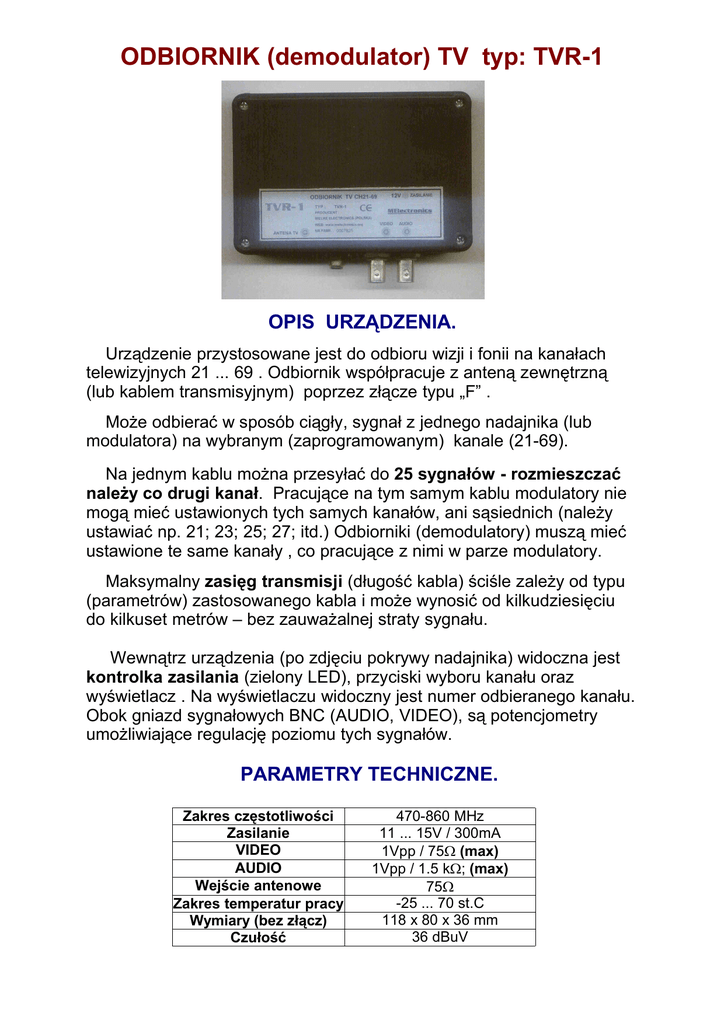 ODBIORNIK (demodulator) TV typ: TVR-1 OPIS URZĄDZENIA. Urządzenie przystosowane jest do odbioru wizji i fonii na kanałach telewizyjnych 21 ... 69 . Odbiornik współpracuje z anteną zewnętrzną (lub kablem transmisyjnym) poprzez złącze typu „F” . Może odbierać w sposób ciągły, sygnał z jednego nadajnika (lub modulatora) na wybranym (zaprogramowanym) kanale (21-69). Na jednym kablu można przesyłać do 25 sygnałów - rozmieszczać należy co drugi kanał. Pracujące na tym samym kablu modulatory nie mogą mieć ustawionych tych samych kanałów, ani sąsiednich (należy ustawiać np. 21; 23; 25; 27; itd.) Odbiorniki (demodulatory) muszą mieć ustawione te same kanały , co pracujące z nimi w parze modulatory. Maksymalny zasięg transmisji (długość kabla) ściśle zależy od typu (parametrów) zastosowanego kabla i może wynosić od kilkudziesięciu do kilkuset metrów – bez zauważalnej straty sygnału. Wewnątrz urządzenia (po zdjęciu pokrywy nadajnika) widoczna jest kontrolka zasilania (zielony LED), przyciski wyboru kanału oraz wyświetlacz . Na wyświetlaczu widoczny jest numer odbieranego kanału. Obok gniazd sygnałowych BNC (AUDIO, VIDEO), są potencjometry umożliwiające regulację poziomu tych sygnałów. PARAMETRY TECHNICZNE. Zakres częstotliwości Zasilanie VIDEO AUDIO Wejście antenowe Zakres temperatur pracy Wymiary (bez złącz) Czułość 470-860 MHz 11 ... 15V / 300mA 1Vpp / 75 (max) 1Vpp / 1.5 k; (max) 75 -25 ... 70 st.C 118 x 80 x 36 mm 36 dBuV OPIS WYPROWADZEŃ ODBIORNIKA : 1. 2. 3. 4. 5. 6. wejście antenowe typu „F”; wyjście VIDEO typu BNC; wyjście AUDIO typu BNC; kontrolka zasilania; wyświetlacz numeru kanału; gniazdo zasilania 12V PRZYCISKI: D – przycisk wyboru kanału „-” ; S – przycisk funkcyjny „wpis” ; U - przycisk wyboru kanału „+” ; WEJŚCIE W PROCEDURĘ USTAWIENIA KANAŁU : -przed podłączeniem zasilania należy przycisnąć przycisk „S”, następnie trzymając go włożyć wtyk zasilania; -przyciskami „D” i „U” wybrać kanał (aktualny stan jest pokazywany na wyświetlaczu); -po ustawieniu numeru, wcisnąć na chwilę przycisk funkcyjny, aż cyfra na wyświetlaczy mignie. Mignięcie cyfry potwierdza zapamiętanie wybranego kanału. UWAGI: - Urządzenia TVR-1 współpracują z dowolnymi modulatorami w standardowych kanałach TV; Modulatory typu 2042GP zostały na schemacie wymieniono tylko jako przykład. - Jeżeli uzyskana jakość obrazu nie jest zadawalająca (mały kontrast) – wyregulować poziom modulacji (video level) w modulatorze. - Jeżeli uzyskana jakość obrazu nie jest zadawalająca (sygnał przesterowany) – wyregulować poziom modulacji (video level) w modulatorze, lub zmniejszyć poziom sygnału (potencjometr VIDEO) w demodulatorze TVR-1. -Jeżeli uzyskana jakość fonii nie jest zadawalająca – sygnału audio w demodulatorze TVR-1. – – – – PRODUCENT: MIELKE ELECTEONICS UL.ZAWADOWSKIEGO 4 02-781 WARSZAWA tel.: 0-22 644 79 59 e-mail: [email protected] www.melectronics.org wyregulować poziom