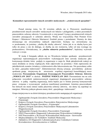 Wrocław, dnia 4 listopada 2015 roku Komunikat reprezentantów innych zawodów medycznych – „traktowanych specjalnie”. Ponad miesiąc temu, bo 28 września odbyła się w Warszawie manifestacja przedstawicieli innych zawodów medycznych niż lekarze i pielęgniarki, a także pozostałych pracowników ochrony zdrowia. Uczestniczyło w niej ponad 5 tysięcy przedstawicieli różnych zawodów pracujących w ochronie zdrowia. Wtedy tez wręczyliśmy Pani Premier Ewie Kopacz i Ministrowi Zdrowia Marianowi Zembali pisma z postulatami. Niestety do dnia dzisiejszego nie otrzymaliśmy żadnych odpowiedzi. Kolejny raz utwierdzamy się w przekonaniu, że jesteśmy „służbą dla służby zdrowia”, która jak to ze służbą bywa jest tylko do pracy a nie do dialogu, ze służbą się nie rozmawia, tylko od niej wymaga się posłuszeństwa. Oświadczamy, że „służba odmawia posłuszeństwa”, będziemy wytrwale walczyć o swoje. W środę 4 listopada odbyło się we Wrocławiu kolejne spotkanie przedstawicieli organizacji reprezentujących pracowników wykonujących inne zawody medyczne jako kontynuacja działań, które podjęły te organizacje w maju br. Brak jakiejkolwiek reakcji na nasze działania ze strony rządzących, brak odpowiedzi na postulaty i brak zaproszenia do jakichkolwiek rozmów świadczy o tchórzostwie albo lekceważeniu nas. Nie pozwalamy sobie na takie „specjalne traktowanie”. Zdeterminowani obecną sytuacją powołaliśmy podczas spotkania grupę inicjatywną do utworzenia wspólnej organizacji konsolidującej nasze środowisko Porozumienia Organizacji Zrzeszających Pracowników Ochrony Zdrowia „WROCŁAW 2015” w skrócie POZPOZ WROCŁAW 2015. Porozumienie ma na celu połączenie wszystkich zainteresowanych organizacji skupiających pracowników ochrony zdrowia w jedną wspólną organizację, która będzie już w formie prawnej kontynuowała prace związane z wysuwanymi podczas manifestacji postulatami. Jesteśmy pracownikami bez których nie może istnieć żadna placówka ochrony zdrowia, nie damy się zepchnąć na margines. Mówimy jednym głosem mamy dość „specjalnego traktowania”. Grupa inicjatywna to na dzień dzisiejszy przedstawiciele następujących organizacji: Ogólnopolski Związek Zawodowy Pracowników Diagnostyki Medycznej i Fizjoterapii Krajowy Związek Zawodowy Pracowników Ratownictwa Medycznego Ogólnopolski Związek Zawodowy „Fizjoterapia” Krajowy Związek Zawodowy Pracowników Medycznych Laboratoriów Diagnostycznych Ogólnopolski Związek Zawodowy Pracowników Fizjoterapii NSZZ Pracowników Diagnostyki Laboratoryjnej Województwa Łódzkiego SNZ Pracowników z Wyższym Wykształceniem Medycznym - Inowrocław Międzyzakładowy ZZ Techników Analityki Medycznej Zakładowy ZZ Diagnostów Laboratoryjnych przy Centralnym Centrum Krwiodawstwa i Krwiolecznictwa w Lublinie Zapraszamy inne organizacje do współpracy. Kontakt: Grażyna Musiałkiewicz - Ogólnopolski Związek Zawodowy Pracowników Diagnostyki Medycznej i Fizjoterapii e-mail: [email protected] Roman Badach-Rogowski - Krajowy Związek Zawodowy Pracowników Ratownictwa Medycznego e-mail: [email protected]