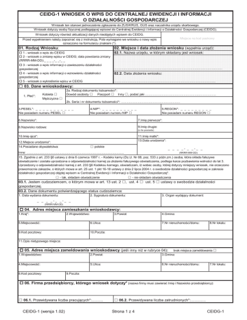 CEIDG-1 WNIOSEK O WPIS DO CENTRALNEJ EWIDENCJI I INFORMACJI O DZIAŁALNOĝCI GOSPODARCZEJ Wniosek ten stanowi jednoczeĞnie zgłoszenie do ZUS/KRUS, GUS oraz naczelnika urzĊdu skarbowego. Wniosek dotyczy osoby fizycznej podlegającej wpisowi do Centralnej Ewidencji i Informacji o DziałalnoĞci Gospodarczej (CEIDG). Wniosek dotyczy równieĪ aktualizacji danych nieobjĊtych wpisem do CEIDG. Miejsce na kod paskowy Przed wypełnieniem naleĪy zapoznaü siĊ z instrukcją. Pola wymagane we wniosku o nowy wpis oznaczono na formularzu znakiem (*). 01. Rodzaj Wniosku: 02. Miejsce i data złoĪenia wniosku (wypełnia urząd): 1 - wniosek o wpis do CEIDG 2 - wniosek o zmianĊ wpisu w CEIDG; data powstania zmiany (RRRR-MM-DD):_ _ _ _-_ _-_ _ 02.1. Nazwa urzĊdu, w którym składany jest wniosek: 3 - wniosek o wpis informacji o zawieszeniu działalnoĞci gospodarczej 4 - wniosek o wpis informacji o wznowieniu działalnoĞci gospodarczej 5 - wniosek o wykreĞlenie wpisu w CEIDG …………………………………...…………………………….……………..……. 02.2. Data złoĪenia wniosku: ………………………………………………………………………………... ܆03. Dane wnioskodawcy: Kobieta ܆ MĊĪczyzna ܆ 1. Płeü*: 2a. Rodzaj dokumentu toĪsamoĞci*: Dowód osobisty ܆Paszport ܆Inny ܆, podaü jaki ………………………………………….……………. 2b. Seria i nr dokumentu toĪsamoĞci*: ……………………………………………… 3.PESEL*: _ _ _ _ _ _ _ _ _ _ _ Nie posiadam numeru PESEL ܆ 4.NIP*: _ _ _ _ _ _ _ _ _ _ Nie posiadam numeru NIP ܆ 6.Nazwisko*: 5.REGON*: _ _ _ _ _ _ _ _ _ Nie posiadam numeru REGON ܆ 7.ImiĊ pierwsze*: 9.ImiĊ drugie: 8.Nazwisko rodowe: (o ile posiada) 10.ImiĊ ojca*: 11.ImiĊ matki*: 13.Data urodzenia*: 12.Miejsce urodzenia*: 14.Posiadane obywatelstwa: ܆polskie _ _ _ _- _ _-_ _ Inne: …………………………………………………………………………….. (RRRR-MM-DD) 15. Zgodnie z art. 233 §6 ustawy z dnia 6 czerwca 1997 r. - Kodeks karny (Dz.U. Nr 88, poz. 533 z póĨn.zm.) osoba, która składa fałszywe oĞwiadczenie i została uprzedzona o odpowiedzialnoĞci karnej za złoĪenie fałszywego oĞwiadczenia, podlega karze pozbawienia wolnoĞci do lat 3. Uprzedzony o odpowiedzialnoĞci karnej z art. 233 §6 Kodeksu karnego, oĞwiadczam, iĪ wobec osoby, której dotyczy niniejszy wniosek, nie orzeczono prawomocnie zakazów, o których mowa w art. 25 ust. 1 pkt 16-18 ustawy z dnia 2 lipca 2004 r. o swobodzie działalnoĞci gospodarczej w zakresie działalnoĞci gospodarczej objĊtej wpisem w Centralnej Ewidencji i Informacji o DziałalnoĞci Gospodarczej*. ܆- tak, składam oĞwiadczenie ܆- nie składam oĞwiadczenia 03.1. Jestem cudzoziemcem, o którym mowa w art. 13 ust. 2 ܆, ust. 4 ܆ust. 5 ܆ustawy o swobodzie działalnoĞci gospodarczej. 03.2. Dane dokumentu potwierdzającego status cudzoziemca: 1. Data wydania dokumentu: 2. Sygnatura dokumentu: 3. Organ wydający dokument: _ _ _ _-_ _-_ _ (RRRR-MM-DD) 04. Adres miejsca zamieszkania wnioskodawcy: 1.Kraj*: 2.Województwo: 3.Powiat: 5.MiejscowoĞü: 6.Ulica: 9.Kod pocztowy: 10.Poczta: 4.Gmina: 7.Nr nieruchomoĞci/domu: 8.Nr lokalu: 11.Opis nietypowego miejsca: 05. Adres miejsca zameldowania wnioskodawcy (jeĞli inny niĪ w rubryce 04): 1.Województwo: 2.Powiat: brak miejsca zameldowania ܆ 3.Gmina: 4.MiejscowoĞü: 5.Ulica: 6.Nr nieruchomoĞci/domu: 8.Kod pocztowy: 7.Nr lokalu: 9.Poczta: 06. Firma przedsiĊbiorcy, którego wniosek dotyczy* (nazwa firmy musi zawieraü ImiĊ i Nazwisko przedsiĊbiorcy): ܆06.1. Przewidywana liczba pracujących*:……… CEIDG-1 (wersja 1.02) ܆06.2. Przewidywana liczba zatrudnionych*:………… Strona 1 z 4 CEIDG-1 ܆06.3. Rodzaje działalnoci gospodarczej symbol (5-znakowy) wg PKD 2007 Przewaajcy*: ܆1. __ __ __ __ __ 2. __ __ __ __ __ Wykrelenie ܆ 3. __ __ __ __ __ Wykrelenie ܆ 4. __ __ __ __ __ Wykrelenie ܆ 5. __ __ __ __ __ Wykrelenie ܆ 6. __ __ __ __ __ Wykrelenie ܆ 7. __ __ __ __ __ Wykrelenie ܆ 8. __ __ __ __ __ Wykrelenie ܆ 9. __ __ __ __ __ Wykrelenie ܆ Kontynuacja w załczniku CEIDG-RD ܆ 07. Nazwa skrócona: 08. Data rozpoczĊcia działalnoĞci*: _ _ _ _- _ _-_ _ (RRRR-MM-DD) ܆09. Dane do kontaktu: 1. Numer telefonu: 2. Adres poczty elektronicznej*: 3. Numer faksu: 4. Strona WWW*: 10. Główne miejsce wykonywania działalnoĞci gospodarczej: ܆10.1. Adres głównego miejsca wykonywania działalnoci gospodarczej (jeli jest inny ni podany w rubryce 04.)*: 1.Województwo: 2.Powiat: 3.Gmina: 4.Miejscowo: 5.Ulica: 6.Nr nieruchomoci/domu: 8.Kod pocztowy: 7.Nr lokalu: 9.Poczta: 10. Opis nietypowego miejsca: ܆10.2. Adres do dorcze (jeli jest inny ni podany w rubryce 10.1): 1.Adresat: 2.Województwo: 3.Powiat: 4.Gmina: 5.Miejscowo: 6.Ulica: 7.Nr nieruchomoci/domu: 9.Kod pocztowy: 10.Poczta: 8.Nr lokalu: 11.Skrytka pocztowa: 11. Dodatkowe miejsce wykonywania działalnoĞci gospodarczej: 11.1. Numer identyfikacyjny REGON: _ _ _ _ _ _ _ _ _ Wykrelenie ܆ _ _ _ _ _ 11.2. Nazwa jednostki lokalnej: ܆11.3. Adres dodatkowego miejsca wykonywania działalnoci gospodarczej: 1. Kraj: 2.Województwo: 5.Miejscowo: 3.Powiat: 6.Ulica: 9.Kod pocztowy: 4.Gmina: 7.Nr nieruchomoci/domu: 8.Nr lokalu: 10.Poczta: 11.Opis nietypowego miejsca: ܆przedsibiorc ܆spółk cywiln, w której przedsibiorca uczestniczy 12. Wskazany adres dotyczy miejsca wykonywania działalnoci przez : ܆11.4. Przewidywana liczba pracujcych:……… ܆11.5. Przewidywana liczba zatrudnionych:………… ܆11.6. Data rozpoczcia działalnoci jednostki __ __ __ __ - __ __ - __ __ ܆11.7. Jednostka samodzielnie bilansujca ܆Tak ܆Nie (RRRR-MM-DD) ܆11.8. Rodzaje działalnoci gospodarczej wykonywanej w tej lokalizacji symbol (5- Przewaajcy*: ܆1. __ __ __ __ __ znakowy) wg PKD 2007 2. __ __ __ __ __ Wykrelenie ܆ 3. __ __ __ __ __ Wykrelenie ܆ 4. __ __ __ __ __ Wykrelenie ܆ 5. __ __ __ __ __ Wykrelenie ܆ 6. __ __ __ __ __ Wy