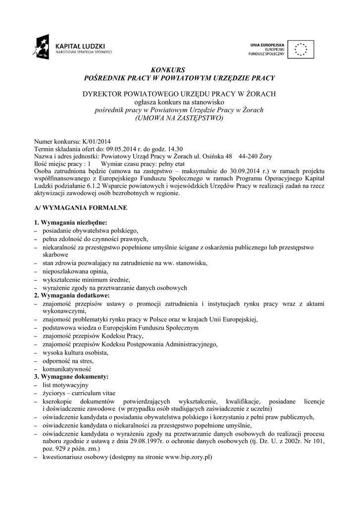 KONKURS POŚREDNIK PRACY W POWIATOWYM URZĘDZIE PRACY DYREKTOR POWIATOWEGO URZĘDU PRACY W ŻORACH ogłasza konkurs na stanowisko pośrednik pracy w Powiatowym Urzędzie Pracy w Żorach (UMOWA NA ZASTĘPSTWO) Numer konkursu: K/01/2014 Termin składania ofert do: 09.05.2014 r. do godz. 14.30 Nazwa i adres jednostki: Powiatowy Urząd Pracy w Żorach ul. Osińska 48 44-240 Żory Ilość miejsc pracy : 1 Wymiar czasu pracy: pełny etat Osoba zatrudniona będzie (umowa na zastępstwo – maksymalnie do 30.09.2014 r.) w ramach projektu współfinansowanego z Europejskiego Funduszu Społecznego w ramach Programu Operacyjnego Kapitał Ludzki podziałanie 6.1.2 Wsparcie powiatowych i wojewódzkich Urzędów Pracy w realizacji zadań na rzecz aktywizacji zawodowej osób bezrobotnych w regionie. A/ WYMAGANIA FORMALNE 1. Wymagania niezbędne: – posiadanie obywatelstwa polskiego, – pełna zdolność do czynności prawnych, – niekaralność za przestępstwo popełnione umyślnie ścigane z oskarżenia publicznego lub przestępstwo skarbowe – stan zdrowia pozwalający na zatrudnienie na ww. stanowisku, – nieposzlakowana opinia, – wykształcenie minimum średnie, – wyrażenie zgody na przetwarzanie danych osobowych 2. Wymagania dodatkowe: – znajomość przepisów ustawy o promocji zatrudnienia i instytucjach rynku pracy wraz z aktami wykonawczymi, – znajomość problematyki rynku pracy w Polsce oraz w krajach Unii Europejskiej, – podstawowa wiedza o Europejskim Funduszu Społecznym – znajomość przepisów Kodeksu Pracy, – znajomość przepisów Kodeksu Postępowania Administracyjnego, – wysoka kultura osobista, – odporność na stres, – komunikatywność 3. Wymagane dokumenty: – list motywacyjny – życiorys – curriculum vitae – kserokopie dokumentów potwierdzających wykształcenie, kwalifikacje, posiadane licencje i doświadczenie zawodowe (w przypadku osób studiujących zaświadczenie z uczelni) – oświadczenie kandydata o posiadaniu obywatelstwa polskiego i korzystaniu z pełni praw publicznych, – oświadczenie kandydata o niekaralności za przestępstwo popełnione umyślnie, – oświadczenie kandydata o wyrażeniu zgody na przetwarzanie danych osobowych do realizacji procesu naboru zgodnie z ustawą z dnia 29.08.1997r. o ochronie danych osobowych (tj. Dz. U. z 2002r. Nr 101, poz. 929 z późn. zm.) – kwestionariusz osobowy (dostępny na stronie www.bip.zory.pl) B/ ZAKRES ZADAŃ WYKONYWANYCH NA STANOWISKU Osoba zatrudniona na stanowisku pośrednika pracy odpowiedzialna będzie za: – nawiązywanie i utrzymywanie kontaktów z pracodawcami , – pozyskiwanie ofert pracy od pracodawców, – promocje usług świadczonych przez urząd pracy, – pomoc osobom bezrobotnym i poszukującym pracy w uzyskaniu odpowiedniego zatrudnienia, – pomoc pracodawcom w znalezieniu odpowiedniego pracownika, – inicjowanie i organizowanie kontaktów bezrobotnych i poszukujących pracy z pracodawcami, – świadczenie usług pośrednictwa pracy w realizowanych przez PUP projektach Europejskiego Funduszu Społecznego – podejmowanie działań na rzecz promocji i rozwoju lokalnej przedsiębiorczości. Wymagane dokumenty aplikacyjne należy składać w zamkniętych kopertach osobiście w siedzibie Powiatowego Urzędu Pracy w Żorach, ul. Osińska 48, 44-240 Żory, I piętro, pok. 17 (sekretariat) lub pocztą na adres urzędu z dopiskiem „Konkurs na stanowisko pośrednika pracy ”. Termin składania dokumentów upływa dnia 09.05.2014 r. o godzinie 14.30, liczy się data wpływu do tut. urzędu O terminie rozmowy kwalifikacyjnej osoby spełniające wymagania zostaną poinformowane telefonicznie. INNE INFORMACJE: W miesiącu poprzedzającym ogłoszenie niniejszego konkursu wskaźnik zatrudnienia osób niepełnosprawnych w Powiatowym Urzędzie Pracy w Żorach, w rozumieniu przepisów o rehabilitacji zawodowej i społecznej oraz zatrudnianiu osób niepełnosprawnych przekraczał 6%. Oferty konkursowe, które wpłyną do urzędu po terminie (urząd nie ponosi odpowiedzialności za opóźnienia pocztowe, decyduje data wpływu do sekretariatu urzędu), jak również niezawierające wymaganych dokumentów nie będą rozpatrywane i będą odsyłane lub odbierane osobiście przez zainteresowanych. Nie przyjmuje się dokumentów drogą elektroniczną. Oferty, z których wynikać będzie, że kandydat nie spełnia wymagań określonych w ogłoszeniu, zostaną odrzucone. Informacja z listą kandydatów spełniających wymogi formalne zostanie umieszczona na stronie internetowej www.bip.zory.pl i tablicy ogłoszeń urzędu pracy. Informacja o wynikach naboru zostanie upowszechniona w terminie 7 dni od dnia zakończenia procedury naboru w Biuletynie Informacji Publicznej oraz tablicy ogłoszeń Powiatowego Urzędu Pracy w Żorach. Dyrektor Powiatowego Urzędu Pracy w Żorach Irena Ficek