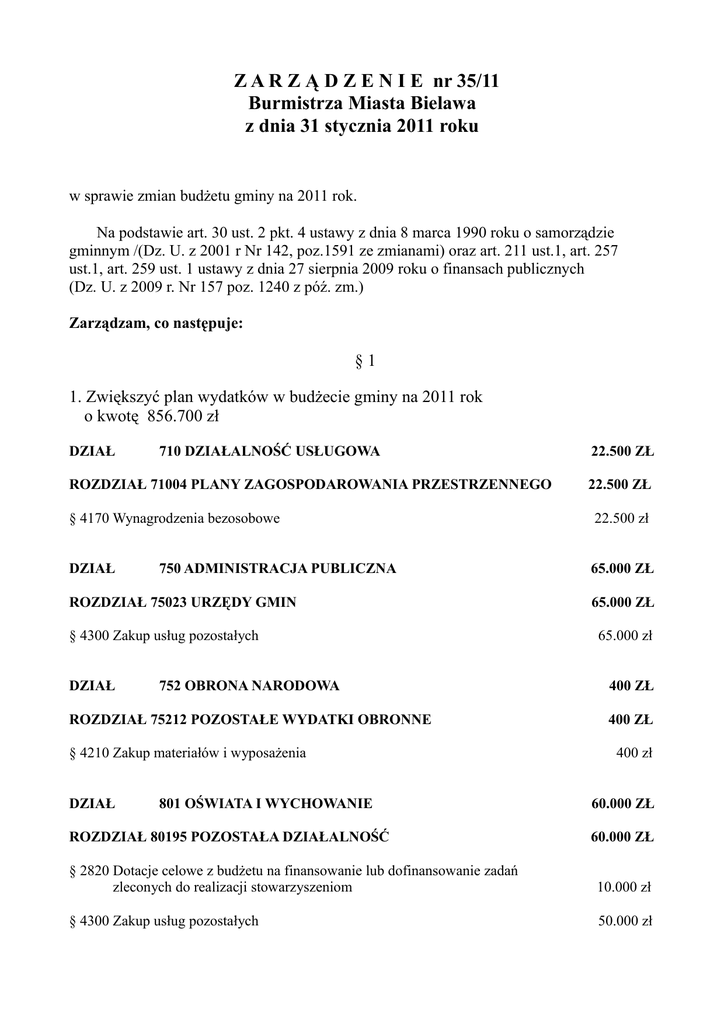 Z A R Z Ą D Z E N I E nr 35/11 Burmistrza Miasta Bielawa z dnia 31 stycznia 2011 roku w sprawie zmian budżetu gminy na 2011 rok. Na podstawie art. 30 ust. 2 pkt. 4 ustawy z dnia 8 marca 1990 roku o samorządzie gminnym /(Dz. U. z 2001 r Nr 142, poz.1591 ze zmianami) oraz art. 211 ust.1, art. 257 ust.1, art. 259 ust. 1 ustawy z dnia 27 sierpnia 2009 roku o finansach publicznych (Dz. U. z 2009 r. Nr 157 poz. 1240 z póź. zm.) Zarządzam, co następuje: §1 1. Zwiększyć plan wydatków w budżecie gminy na 2011 rok o kwotę 856.700 zł DZIAŁ 710 DZIAŁALNOŚĆ USŁUGOWA ROZDZIAŁ 71004 PLANY ZAGOSPODAROWANIA PRZESTRZENNEGO 22.500 ZŁ 22.500 ZŁ § 4170 Wynagrodzenia bezosobowe 22.500 zł DZIAŁ 65.000 ZŁ 750 ADMINISTRACJA PUBLICZNA ROZDZIAŁ 75023 URZĘDY GMIN § 4300 Zakup usług pozostałych DZIAŁ 65.000 ZŁ 65.000 zł 752 OBRONA NARODOWA 400 ZŁ ROZDZIAŁ 75212 POZOSTAŁE WYDATKI OBRONNE 400 ZŁ § 4210 Zakup materiałów i wyposażenia DZIAŁ 801 OŚWIATA I WYCHOWANIE ROZDZIAŁ 80195 POZOSTAŁA DZIAŁALNOŚĆ 400 zł 60.000 ZŁ 60.000 ZŁ § 2820 Dotacje celowe z budżetu na finansowanie lub dofinansowanie zadań zleconych do realizacji stowarzyszeniom 10.000 zł § 4300 Zakup usług pozostałych 50.000 zł DZIAŁ 851 OCHRONA ZDROWIA ROZDZIAŁ 85195 POZOSTAŁA DZIAŁALNOŚĆ § 2820 Dotacje celowe z budżetu na finansowanie lub dofinansowanie zadań zleconych do realizacji stowarzyszeniom DZIAŁ 852 POMOC SPOŁECZNA ROZDZIAŁ 85295 POZOSTAŁA DZIAŁALNOŚĆ 8.300 ZŁ 8.300 ZŁ 8.300 zł 61.500 ZŁ 61.500 ZŁ § 2810 Dotacja celowa z budżetu na finansowanie lub dofinansowanie zadań zleconych do realizacji fundacjom 1.500 zł § 2820 Dotacje celowe z budżetu na finansowanie lub dofinansowanie zadań 60.000 zł DZIAŁ 854 EDUKACYJNA OPIEKA WYCHOWAWCZA 10.000 ZŁ ROZDZIAŁ 85412 KOLONIE I OBOZY ORAZ INNE FORMY WYPOCZYNKU DZIECI I MŁODZIEŻY SZKOLNEJ, A TAKŻE SZKOLENIA MŁODZIEŻY 10.000 ZŁ § 2810 Dotacja celowa z budżetu na finansowanie lub dofinansowanie zadań zleconych do realizacji fundacjom 1.000 zł § 2820 Dotacje celowe z budżetu na finansowanie lub dofinansowanie zadań zleconych do realizacji stowarzyszeniom 9.000 zł DZIAŁ 921 KULTURA I OCHRONA DZIEDZICTWA NARODOWEGO 50.000 ZŁ ROZDZIAŁ 92105 POZOSTAŁE ZADANIA W ZAKRESIE KULTURY 50.000 ZŁ § 2820 Dotacje celowe z budżetu na finansowanie lub dofinansowanie zadań zleconych do realizacji stowarzyszeniom 50.000 zł DZIAŁ 926 KULTURA FIZYCZNA 579.000 ZŁ ROZDZIAŁ 92605 ZADANIA W ZAKRESIE KULTURY FIZYCZNEJ 579.000 ZŁ § 2820 Dotacje celowe z budżetu na finansowanie lub dofinansowanie zadań zleconych do realizacji stowarzyszeniom 579.000 zł 2. Zmniejszyć plan wydatków w budżecie gminy na 2011 rok o kwotę 856.700 zł DZIAŁ 710 DZIAŁALNOŚĆ USŁUGOWA ROZDZIAŁ 71004 PLANY ZAGOSPODAROWANIA PRZESTRZENNEGO § 4300 Zakup usług pozostałych DZIAŁ 22.500 ZŁ 22.500 ZŁ 22.500 zł 752 OBRONA NARODOWA 400 ZŁ ROZDZIAŁ 75221 PROJEKTY BADAWCZE I CELOWE W DZIEDZINIE OBRONNOŚCI 400 ZŁ § 4210 Zakup materiałów i wyposażenia DZIAŁ 400 zł 758 RÓŻNE ROZLICZENIA 833.800 ZŁ ROZDZIAŁ 75818 REZERWY OGÓLNE I CELOWE § 4810 Rezerwy 833.800 zł §2 Budżet po dokonanych zmianach wynosi: dochody wydatki 833.800 ZŁ 81.809.121 zł 93.416.609 zł §3 Wykonanie zarządzenia powierza się Skarbnikowi Gminy. §4 Zarządzenie wchodzi w życie z dniem podpisania. U ZASADN IEN IE Dokonuje się przeniesienia planu wydatków na plus / minus w kwocie 22.900 zł w sposób następujący: 1. 752 - Obrona narodowa w rozdziale 75221 zmniejsza się plan wydatków w paragrafie 4210 o kwotę 400 zł z jednoczesnym zwiększeniem planu wydatków w rozdziale 75212, w paragrafie 4210 o kwotę 400 zł. Zmiany dokonuje się w związku z mylnie zastosowanym rozdziałem klasyfikacji budżetowej. 2. 710 - Działalność usługowa w rozdziale 71004 zmniejsza się plan wydatków w paragrafie 4300 o kwotę 22.500 zł z jednoczesnym zwiększeniem planu wydatków w tym samym dziale, rozdziale, w paragrafie 4170 o tę samą kwotę. Zmiany dokonuje się w związku z faktem , że w wyniku procedury przetargowej zadanie realizowała będzie osoba fizyczna, a nie prawna. Dokonuje się rozwiązania rezerwy ogólnej w kwocie 115.000 zł zapisanej w dziale 758, w rozdziale 75818, w paragrafie 4810 i przeznacza się ją na zwiększenie planu wydatków: a) w dziale 750, w rozdziale 75023, w paragrafie 4300 na obsługę bankową w wysokości 15.000 zł oraz na obsługę Biura Prawnego w wysokości 50.000 zł, b) w dziale 801, w rozdziale 80195 w paragrafie 4300 na obsługę oraz organizację zajęć w obiekcie „Szkoły Leśnej” w wysokości 50.000 zł. Na podstawie Zarządzenia nr 30/2011 Burmistrza Miasta Bielawy z dnia 28 01.2011 roku w sprawie rozdysponowania środków finansowych zapisanych w Uchwale Budżetowej na rok 2011 jako rezerwy celowej na realizację zadań gminnych zleconych organizacjom pozarządowym oraz przewidziane na realizację zadań publicznych w zakresie upowszechniania kultury fizycznej, sztuki, ochrony dóbr kultury i tradycji , podtrzymywania tradycji narodowej, pielęgnowania polskości oraz rozwoju świadomości narodowej, obywatelskiej i kulturowej;ochrony i promocji zdrowia; nauki i edukacji, wypoczynku zimowego dzieci i młodzieży oraz pomocy społecznej po rozstrzygnięciu Otwartego Konkursu Ofert w dniu 3.01.2011 r., dokonuje się rozwiązania rezerwy celowej w kwocie 718.800 zł zapisanej w dziale 758, w rozdziale 75818, w paragrafie 4810 i przeznacza się ją na zwiększenie planu wydatków w działach: A) 801, w rozdziale 80195 w paragrafie 2820 o kwotę 10.000 zł dla: 1) Stowarzyszenia Bielawski Uniwersytet III Wieku z siedzibą przy ul. Piastowskiej 19a w Bielawie, na zadanie p.n. „Nauka i edukacja”- 10.000,00 zł B) 851, w rozdziale 85195 w paragrafie 2820 o kwotę 8.300 zł dla: 1.Stowarzyszenia Kobiet „AMAZONKI” z siedzibą przy ul. Świdnickiej 38 w Dzierżoniowie, na zadanie p.n. „Rehabilitacja fiz