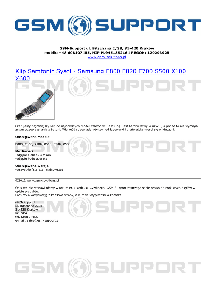 GSM-Support ul. Bitschana 2/38, 31-420 Kraków mobile +48 608107455, NIP PL9451852164 REGON: 120203925 www.gsm-solutions.pl Klip Samtonic Sysol - Samsung E800 E820 E700 S500 X100 X600 Oferujemy najmniejszy klip do najnowszych modeli telefonów Samsung. Jest bardzo łatwy w użyciu, a ponad to nie wymaga zewnętrzego zasilania z baterii. Wielkość odpowiada wtykowi od ładowarki i z łatwością mieści się w kieszeni. Obsługiwane modele: E800, E820, X100, X600, E700, X500 Możliwości: -zdjęcie blokady simlock -zdjęcie kodu aparatu Obsługiwane wersje: -wszystkie (starsze i najnowsze) ©2012 www.gsm-solutions.pl Opis ten nie stanowi oferty w rozumieniu Kodeksu Cywilnego. GSM-Support zastrzega sobie prawo do możliwych błędów w opisie produktu. Prosimy o weryfikację z Państwa strony, a w razie wątpliwości o kontakt. GSM-Support ul. Bitschana 2/38 31-420 Kraków POLSKA tel. 608107455 e-mail: [email protected] Powered by TCPDF (www.tcpdf.org)