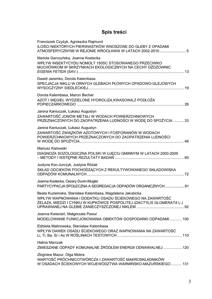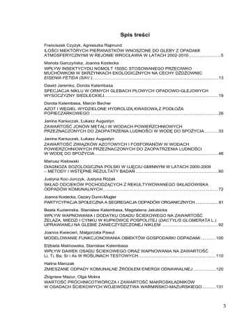 Spis treści Franciszek Czyżyk, Agnieszka Rajmund ILOŚCI NIEKTÓRYCH PIERWIASTKÓW WNOSZONE DO GLEBY Z OPADAMI ATMOSFERYCZNYMI W REJONIE WROCŁAWIA W LATACH 2002-2010..........................5 Mariola Garczyńska, Joanna Kostecka WPŁYW INSEKTYCYDU NOMOLT 150SC STOSOWANEGO PRZECIWKO MUCHÓWKOM W SKRZYNKACH EKOLOGICZNYCH NA CECHY DŻDŻOWNIC EISENIA FETIDA (SAV.) ......................................................................................................13 Dawid Jaremko, Dorota Kalembasa SPECJACJA NIKLU W ORNYCH GLEBACH PŁOWYCH OPADOWO-GLEJOWYCH WYSOCZYZNY SIEDLECKIEJ.............................................................................................19 Dorota Kalembasa, Marcin Becher AZOT I WĘGIEL WYDZIELONE HYDROLIZĄ KWASOWĄ Z PODŁOŻA POPIECZARKOWEGO ........................................................................................................26 Janina Kaniuczak, Łukasz Augustyn ZAWARTOŚĆ JONÓW METALI W WODACH POWIERZCHNIOWYCH PRZEZNACZONYCH DO ZAOPATRZENIA LUDNOŚCI W WODĘ DO SPOŻYCIA ...........33 Janina Kaniuczak, Łukasz Augustyn ZAWARTOŚĆ ZWIĄZKÓW AZOTOWYCH I FOSFORANÓW W WODACH POWIERZCHNIOWYCH PRZEZNACZONYCH DO ZAOPATRZENIA LUDNOŚCI W WODĘ DO SPOŻYCIA.....................................................................................................46 Mariusz Kistowski DIAGNOZA SOZOLOGICZNA POLSKI W UJĘCIU GMINNYM W LATACH 2000-2009 – METODY I WSTĘPNE REZULTATY BADAŃ ...................................................................60 Justyna Koc-Jurczyk, Justyna Różak SKŁAD ODCIEKÓW POCHODZĄCYCH Z REKULTYWOWANEGO SKŁADOWISKA ODPADÓW KOMUNALNYCH ..............................................................................................72 Joanna Kostecka, Cezary Dunin-Mugler PARTYCYPACJA SPOŁECZNA A SEGREGACJA ODPADÓW ORGANICZNYCH ..................... 81 Beata Kuziemska, Stanisław Kalembasa, Magdalena Jakubicka WPŁYW WAPNOWANIA I DODATKU OSADU ŚCIEKOWEGO NA ZAWARTOŚĆ ŻELAZA, MIEDZI I CYNKU W KUPKÓWCE POSPOLITEJ (DACTYLIS GLOMERATA L.) UPRAWIANEJ NA GLEBIE ZANIECZYSZCZONEJ NIKLEM ..............................................92 Joanna Kwiecień, Małgorzata Pawul MODELOWANIE FUNKCJONOWANIA OBIEKTÓW GOSPODARKI ODPADAMI ............100 Elżbieta Malinowska, Stanisław Kalembasa WPŁYW DAWEK OSADU ŚCIEKOWEGO ORAZ WAPNOWANIA NA ZAWARTOŚĆ Li, Ti, Ba, Sr i As W ROŚLINACH TESTOWYCH ...............................................................110 Halina Marczak ZMIESZANE ODPADY KOMUNALNE ŹRÓDŁEM ENERGII ODNAWIALNEJ ..................120 Zbigniew Mazur, Olga Mokra WARTOŚĆ PRÓCHNICOTWÓRCZA I ZAWARTOŚĆ MAKROSKŁADNIKÓW W OSADACH ŚCIEKOWYCH WOJEWÓDZTWA WARMIŃSKO-MAZURSKIEGO ...........131 3 Elwira Nowobilska, Aleksandra Nowobilska-Luberda, Agnieszka Ziernicka-Wojtaszek, Tadeusz Zawora MOŻLIWOŚCI WYKORZYSTANIA ZASOBÓW WÓD TERMALNYCH W REJONIE PODHALA .......................................................................................................................... 136 Marek Pająk, Marcin Pietrzykowski, Wojciech Krzaklewski, Wojciech Ochał WPŁYW WŁAŚCIWOŚCI INICJALNYCH GLEB NA WZROST SOSNY ZWYCZAJNEJ (Pinus sylvestris L.) NA ZREKULTYWOWANYCH POWIERZCHNIACH ZWAŁOWISK KWB "BEŁCHATÓW" ......................................................................................................... 144 Krzysztof Pakuła FRAKCJE OŁOWIU, CHROMU, CYNKU, MIEDZI I NIKLU W POZIOMIE PRÓCHNICZNYM GLEB POŁOŻONYCH WZDŁUŻ OBWODNICY SIEDLEC .................. 153 Tadeusz Ratajczak, Grzegorz Rzepa LOKALNE KOPALINY MINERALNE A MOŻLIWOŚCI ICH WYKORZYSTANIA W OCHRONIE ŚRODOWISKA (NA PRZYKŁADZIE MAZURSKICH RUD DARNIOWYCH) ................................................................................................................. 161 Ewa Rauba ZASADA ZWROTU KOSZTÓW ŚWIADCZENIA USŁUGI OCZYSZCZANIA ŚCIEKÓW W ŚWIETLE RAMOWEJ DYREKTYWY WODNEJ UNII EUROPEJSKIEJ ........................ 170 Leszek Rogalski, Leszek Lenart ZMIANY STĘŻENIA DWUTLENKU SIARKI W POWIETRZU ATMOSFERYCZNYM W ZALEŻNOŚCI OD TEMPERATURY .............................................................................. 177 Leszek Rogalski, Joanna Rzepka OKREŚLENIE EMISJI BIOGAZU ZE SKŁADOWISKA ODPADÓW KOMUNALNYCH...... 184 Leszek Stanek EKONOMICZNO-SPOŁECZNE ZNACZENIE PROGNOZ SKUTKÓW FINANSOWYCH UCHWALENIA MIEJSCOWYCH PLANÓW ZAGOSPODAROWANIA PRZESTRZENNEGO ......................................................................................................... 191 Aleksandra Steinhoff-Wrześniewska, Maria Strzelczyk STRUKTURA ODPADÓW OPAKOWANIOWYCH W PRODUKCJI NAPOJÓW ALKOHOLOWYCH............................................................................................................. 202 Barbara Symanowicz, Stanisław Kalembasa POBIERANIE KADMU I OŁOWIU PRZEZ BIOMASĘ RUTWICY WSCHODNIEJ (Galega orientalis Lam.) W ZALEŻNOŚCI OD OKRESU TRWANIA UPRAWY I FAZY ROZWOJOWEJ ..................................................................................................... 211 Lucyna Twerd TERENY PRZEMYSŁOWE – JAKO MIEJSCA BOGATEJ FAUNY ŻĄDŁÓWEK .............. 219 Beata Wiśniewska, Stanisław Kalembasa WPŁYW DAWEK OSADU ŚCIEKOWEGO NA ZAWARTOŚĆ I POBRANIE Zn, Cu I Cr PRZEZ BIOMASĘ ŻYCICY WIELOKWIATOWEJ ORAZ NA AKUMULACJĘ TYCH METALI W GLEBIE ................................................................................................. 229 Andrzej Wysokiński, Stanisław Kalembasa WPŁYW DODATKÓW MINERALNYCH I ORGANICZNYCH DO OSADÓW ŚCIEKOWYCH ORAZ KOMPOSTOWANIA UZYSKANYCH MIESZANIN NA ICH WYBRANE WŁAŚCIWOŚCI ................................................................................................................. 240 4
