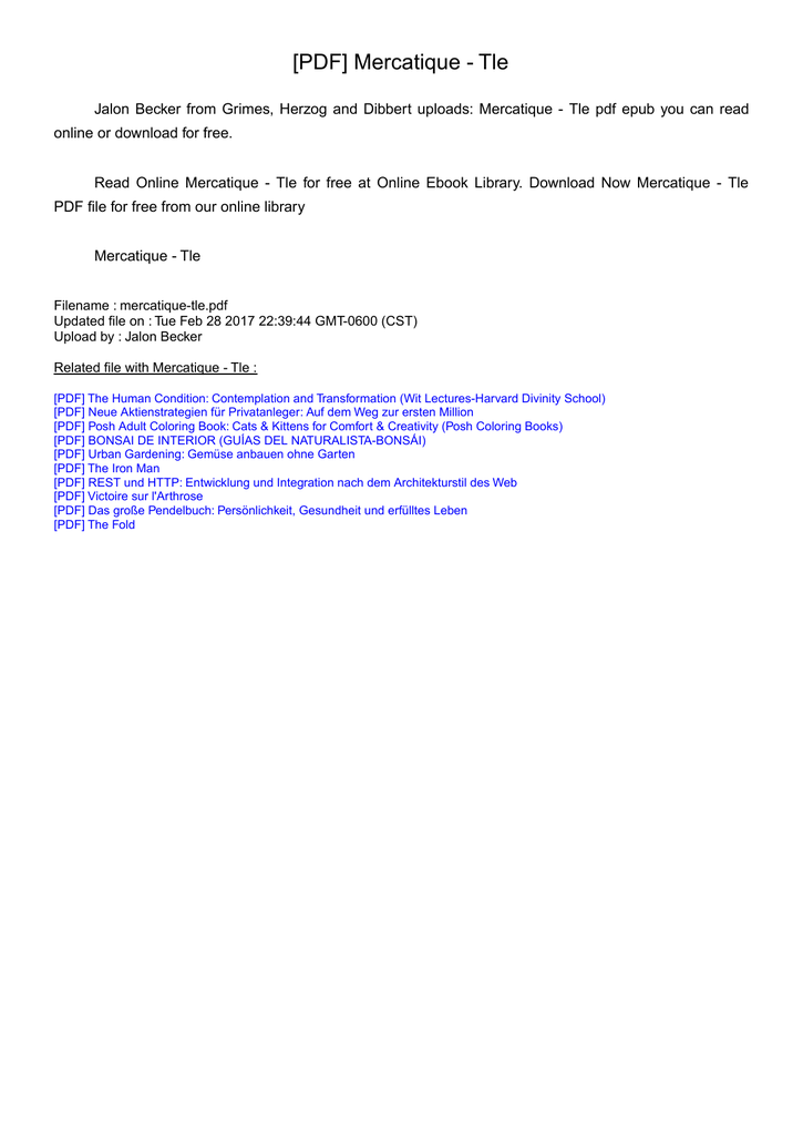 [PDF] Mercatique - Tle Jalon Becker from Grimes, Herzog and Dibbert uploads: Mercatique - Tle pdf epub you can read online or download for free. Read Online Mercatique - Tle for free at Online Ebook Library. Download Now Mercatique - Tle PDF file for free from our online library Mercatique - Tle Filename : mercatique-tle.pdf Updated file on : Tue Feb 28 2017 22:39:44 GMT-0600 (CST) Upload by : Jalon Becker Related file with Mercatique - Tle : [PDF] The Human Condition: Contemplation and Transformation (Wit Lectures-Harvard Divinity School) [PDF] Neue Aktienstrategien für Privatanleger: Auf dem Weg zur ersten Million [PDF] Posh Adult Coloring Book: Cats & Kittens for Comfort & Creativity (Posh Coloring Books) [PDF] BONSAI DE INTERIOR (GUÍAS DEL NATURALISTA-BONSÁI) [PDF] Urban Gardening: Gemüse anbauen ohne Garten [PDF] The Iron Man [PDF] REST und HTTP: Entwicklung und Integration nach dem Architekturstil des Web [PDF] Victoire sur l'Arthrose [PDF] Das große Pendelbuch: Persönlichkeit, Gesundheit und erfülltes Leben [PDF] The Fold