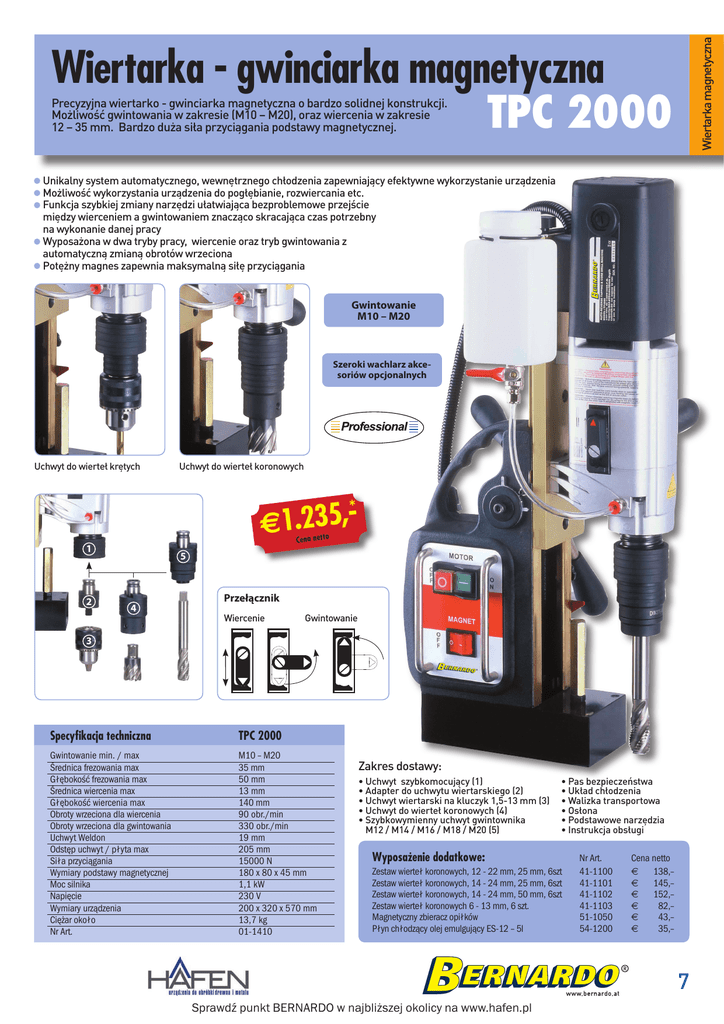 Wiertarka magnetyczna Wiertarka - gwinciarka magnetyczna TPC 2000 Precyzyjna wiertarko - gwinciarka magnetyczna o bardzo solidnej konstrukcji. 0RĦOLZRčÉJZLQWRZDQLDZ]DNUHVLH0Ǟ0RUD]ZLHUFHQLDZ]DNUHVLH ǞPP%DUG]RGXĦDVLùDSU]\FLÇJDQLDSRGVWDZ\PDJQHW\F]QHM ǩ 8QLNDOQ\V\VWHPDXWRPDW\F]QHJRZHZQÙWU]QHJRFKùRG]HQLD]DSHZQLDMÇF\HIHNW\ZQHZ\NRU]\VWDQLHXU]ÇG]HQLD ǩ Możliwość wykorzystania urządzenia do pogłębianie, rozwiercania etc. ǩ Funkcja szybkiej zmiany narzędzi ułatwiająca bezproblemowe przejście między wierceniem a gwintowaniem znacząco skracająca czas potrzebny na wykonanie danej pracy ǩ Wyposażona w dwa tryby pracy, wiercenie oraz tryb gwintowania z automatyczną zmianą obrotów wrzeciona ǩ Potężny magnes zapewnia maksymalną siłę przyciągania Gwintowanie M10 – M20 Szeroki wachlarz akcesoriów opcjonalnych Uchwyt do wierteł krętych Uchwyt do wierteł koronowych * , 5 3 2 . €1 Cena netto 1 2 5 Przełącznik 4 Wiercenie Gwintowanie 3 Specyfikacja techniczna TPC 2000 Gwintowanie min. / max Średnica frezowania max Głębokość frezowania max Średnica wiercenia max Głębokość wiercenia max Obroty wrzeciona dla wiercenia Obroty wrzeciona dla gwintowania Uchwyt Weldon Odstęp uchwyt / płyta max Siła przyciągania Wymiary podstawy magnetycznej Moc silnika Napięcie Wymiary urządzenia Ciężar około Nr Art. M10 – M20 35 mm 50 mm 13 mm 140 mm 90 obr./min 330 obr./min 19 mm 205 mm 15000 N 180 x 80 x 45 mm 1,1 kW 230 V 200 x 320 x 570 mm 13,7 kg 01-1410 Zakres dostawy: ǩ8FKZ\WV]\ENRPRFXMÇF\ ǩ$GDSWHUGRXFKZ\WXZLHUWDUVNLHJR ǩ8FKZ\WZLHUWDUVNLQDNOXF]\NPP ǩ8FKZ\WGRZLHUWHùNRURQRZ\FK ǩ6]\ENRZ\PLHQQ\XFKZ\WJZLQWRZQLND 00000 ǩ3DVEH]SLHF]HûVWZD ǩ8NùDGFKùRG]HQLD ǩ:DOL]NDWUDQVSRUWRZD ǩ2VùRQD ǩ3RGVWDZRZHQDU]ÙG]LD ǩ,QVWUXNFMDREVùXJL Wyposażenie dodatkowe: Zestaw wierteł koronowych, 12 - 22 mm, 25 mm, 6szt Zestaw wierteł koronowych, 14 - 24 mm, 25 mm, 6szt Zestaw wierteł koronowych, 14 - 24 mm, 50 mm, 6szt Zestaw wierteł koronowych 6 - 13 mm, 6 szt. Magnetyczny zbieracz opiłków Płyn chłodzący olej emulgujący ES-12 – 5l Nr Art. 41-1100 41-1101 41-1102 41-1103 51-1050 54-1200 Cena netto € 138,– € 145,– € 152,– € 82,– € 43,– € 35,– 7 Sprawdź punkt BERNARDO w najbliższej okolicy na www.hafen.pl