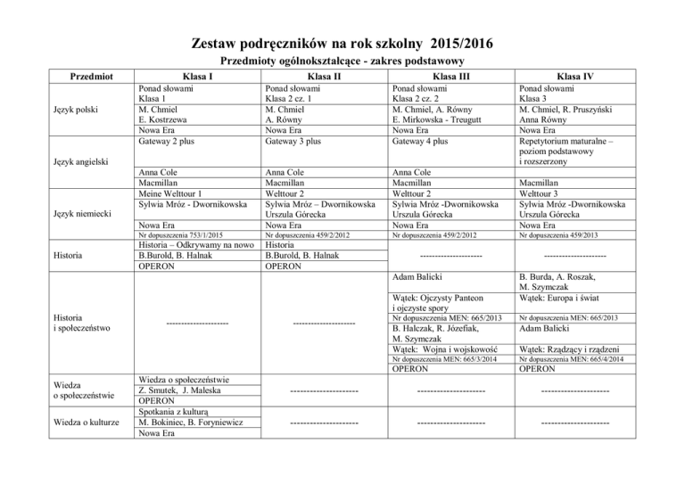 Zestaw podręczników na rok szkolny 2015/2016 Przedmioty ogólnokształcące - zakres podstawowy Przedmiot Język polski Klasa I Klasa II Klasa III Ponad słowami Klasa 1 M. Chmiel E. Kostrzewa Nowa Era Gateway 2 plus Ponad słowami Klasa 2 cz. 1 M. Chmiel A. Równy Nowa Era Gateway 3 plus Ponad słowami Klasa 2 cz. 2 M. Chmiel, A. Równy E. Mirkowska - Treugutt Nowa Era Gateway 4 plus Anna Cole Macmillan Meine Welttour 1 Sylwia Mróz - Dwornikowska Nowa Era Anna Cole Macmillan Welttour 2 Sylwia Mróz – Dwornikowska Urszula Górecka Nowa Era Anna Cole Macmillan Welttour 2 Sylwia Mróz -Dwornikowska Urszula Górecka Nowa Era Macmillan Welttour 3 Sylwia Mróz -Dwornikowska Urszula Górecka Nowa Era Nr dopuszczenia 753/1/2015 Nr dopuszczenia 459/2/2012 Nr dopuszczenia 459/2/2012 Nr dopuszczenia 459/2013 Historia – Odkrywamy na nowo B.Burold, B. Halnak OPERON Historia B.Burold, B. Halnak OPERON Język angielski Język niemiecki Historia --------------------Adam Balicki Wątek: Ojczysty Panteon i ojczyste spory Historia i społeczeństwo Wiedza o społeczeństwie Wiedza o kulturze Klasa IV --------------------- Wiedza o społeczeństwie Z. Smutek, J. Maleska OPERON Spotkania z kulturą M. Bokiniec, B. Foryniewicz Nowa Era --------------------- Ponad słowami Klasa 3 M. Chmiel, R. Pruszyński Anna Równy Nowa Era Repetytorium maturalne – poziom podstawowy i rozszerzony --------------------B. Burda, A. Roszak, M. Szymczak Wątek: Europa i świat Nr dopuszczenia MEN: 665/2013 Nr dopuszczenia MEN: 665/2013 B. Halczak, R. Józefiak, M. Szymczak Wątek: Wojna i wojskowość Adam Balicki Nr dopuszczenia MEN: 665/3/2014 Nr dopuszczenia MEN: 665/4/2014 OPERON OPERON Wątek: Rządzący i rządzeni --------------------- --------------------- --------------------- --------------------- --------------------- --------------------- Podstawy przedsiębiorczości Geografia Biologia Chemia Fizyka Krok w przedsiębiorczość Z. Makieła, T. Rachwał Nowa Era Geografia - Odkrywamy na nowo S. Kurek OPERON Biologia na czasie E. Bonar W. Krzeszowiec - Jeleń S. Czachorowski Nowa Era To jest chemia R. Hassa, A. Mrzigod J. Mrzigod Nowa Era Odkryć fizykę M. Braun, W. Śliwa Nowa Era Matematyka 1 – zakres podstawowy Krok w przedsiębiorczość Z. Makieła, T. Rachwał Nowa Era --------------------- --------------------- --------------------- --------------------- --------------------- --------------------- --------------------- --------------------- --------------------- --------------------- --------------------- --------------------- --------------------- --------------------- W. Babiński, L. Chańko, D. Ponczek Nowa Era Informatyka dla szkół ponadgimnazjalnych – zakres podstawowy Grażyna Koba MIGRA Bez paniki M. Borowicki, Z. Pytasz, E. Rygała PWN Moje miejsce w Kościele Ks. J. Szpet Św. Wojciech W. Babiński, L. Chańko, D. Ponczek Nowa Era Matematyka 2 – zakres podstawowy i rozszerzony Matematyka Informatyka Edukacja dla bezpieczeństwa Religia Matematyka 2 – zakres podstawowy i rozszerzony Matematyka 3 – zakres podstawowy i rozszerzony W. Babiński, L. Chańko, D. Ponczek Nowa Era Matematyka 3 – zakres podstawowy i rozszerzony W. Babiński, L. Chańko, D. Ponczek Nowa Era --------------------- --------------------- --------------------- --------------------- --------------------- --------------------- Moje miejsce w Kościele Ks. J. Szpet Św. Wojciech Moje miejsce w Kościele Ks. J. Szpet Św. Wojciech --------------------- Przedmioty ogólnokształcące - zakres rozszerzony Przedmiot Język angielski II, II, IV TŻiUG II, III, IV TUF Biologia II, II, IV TŻiUG II, III, IV TUF III TMR, IV TMR Fizyka IV TB Matematyka II, III, IV TMR III, IV TB Klasa I --------------------- --------------------- --------------------- --------------------- Geografia III TB II TMR Klasa II Klasa III Klasa IV Podręcznik podany wyżej zawiera poziom podstawowy i rozszerzony Biologia na czasie 1 Podręcznik podany wyżej zawiera poziom podstawowy i rozszerzony Biologia na czasie 2 Podręcznik podany wyżej zawiera poziom podstawowy i rozszerzony Biologia na czasie 3 M. Guzik, E.Jastrzębska, R. Kozik F. Dubert, R. Kozik, S. Krawczyk Nowa Era Nowa Era F. Dubert, M. Jurgowiak, M. Marko – Worłowska, W. Zamachowski Nowa Era Podręcznik podany wyżej zawiera poziom podstawowy i rozszerzony Podręcznik podany wyżej zawiera poziom podstawowy i rozszerzony Zrozumieć fizykę M. Braun Nowa Era Podręcznik podany wyżej zawiera poziom podstawowy i rozszerzony Maria Zawadzka-Kuc, Radosław Wróblewski Geografia 1 Janusz Stasiak Zbigniew Zaniewicz Geografia 2 Geografia 3 cz.1. Geografia 3 cz.2. Nr dopuszczenia MEN: 502/1/2012/2015 Nr dopuszczenia MEN: 502/2/2013 Nr dopuszczenia MEN: 502/3/2015 502/4/2015 --------------------- --------------------- ---------------------