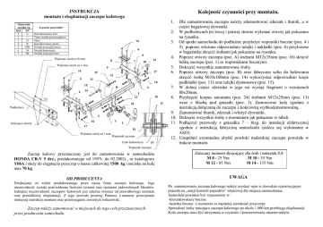 INSTRUKCJA montaŜu i eksploatacji zaczepu kulowego Oznaczenie zacisku wg ISO PN 1 L 2 + 3 31 4 R 5 58R 6 54 7 58L Kolejność czynności przy montaŜu. 1. Łączenie przewodów Kierunkowskazy lewe Tylne światła przeciwmgłowe Masa Kierunkowskazy prawe Światła pozycyjne prawe Światła hamowania Światła pozycyjne lewe 14 6 9 Wykonać otwór ø18 mm 8 Wykonać otwór ø11 mm 7 12 10 5 14 17 15 12 6 11 16 15 4 B A 14 1 15 13 11 24 PodłuŜnica A 16 Istniejące otwory 3 2 17 14 Wykonać otwór ø11 mm Wspornik zaczepu Ucho holownicze 15 Dla zamontowania zaczepu naleŜy zdemontować zderzak i tłumik, a w części bagaŜowej dywaniki. 2. W podłuŜnicach po lewej i prawej stronie wykonać otwory jak pokazano na rysunku. 3. Od spodu samochodu do podłuŜnic przyłoŜyć wsporniki boczne (poz. 4 i 5) poprzez włoŜone odpowiednio tulejki i nakładki (poz. 6) przyłoŜone w bagaŜniku skręcić śrubami jak pokazano na rysunku. 4. Poprzez otwory zaczepu (poz. A) śrubami M12x35mm (poz. 16) skręcić belkę zaczepu (poz. 1) ze wspornikami bocznymi. 5. Dokręcić wszystkie zamontowane śruby. 6. Poprzez otwory zaczepu (poz. B) oraz fabryczne ucho do holowania skręcić śrubą M10x100mm (poz. 14) wykorzystać odpowiednio ścięte podkładki (poz. 11) oraz tulejki dystansowe (poz. 15). 7. W dolnej części zderzaka w jego osi wyciąć fragment o wymiarach 80x20mm. 8. Przykręcić korpus automatu (poz. 24) śrubami M12x25mm (poz. 13) wraz z blachą pod gniazdo (poz. 3). Zamocować kulę zgodnie z instrukcją dołączaną do zaczepu z końcówką szybkodemontowalną. 9. Zamontować tłumik, zderzak i włoŜyć dywaniki. 10. Dokręcić wszystkie śruby z momentem jak pokazano w tabeli. 11. Podłączyć przewody z gniazdka 7 – bieg. do instalacji elektrycznej zgodnie z instrukcją fabryczną samochodu (zaleca się wykonanie w ASO). 12. Uzupełnić ewentualne ubytki powłoki malarskiej zaczepu powstałe w trakcie montaŜu. Wspornik zaczepu Zaczep kulowy przeznaczony jest do zamontowania w samochodzie HONDA CR-V 5 drz., produkowanego od 1997r. do 02.2002r., nr katalogowy Y06A i słuŜy do ciągnięcia przyczep o masie całkowitej 1500 kg i nacisku na kulę max 70 kg. Zalecany moment skręcający dla śrub i nakrętek 8,8: M 8 - 25 Nm M 10 - 55 Nm M 12 - 85 Nm M 14 - 135 Nm OD PRODUCENTA UWAGA Dziękujemy za wybór produkowanego przez naszą firmę zaczepu kulowego. Jego niezawodność została potwierdzona licznymi testami oraz opiniami zadowolonych klientów. JednakŜe niezawodność zaczepów kulowych jest zaleŜna równieŜ od prawidłowego montaŜu oraz prawidłowej eksploatacji. Z tego powodu prosimy Państwa o staranne przeczytanie niniejszej instrukcji montaŜu oraz przestrzeganie zawartych wskazówek. Zaczep naleŜy zamontować w miejscach do tego celu przeznaczonych przez producenta samochodu. Po zamontowaniu zaczepu kulowego naleŜy uzyskać wpis w dowodzie rejestracyjnym pojazdu na „stacji kontroli pojazdów” właściwej dla miejsca zamieszkania. Samochód powinien być wyposaŜony w : -kierunkowskazy boczne -lusterka boczne o rozstawie co najmniej szerokości przyczepy Sprawdzać śruby mocujące zaczepu kulowego po około 1 000 km przebiegu eksploatacji. Kula zaczepu musi być utrzymana w czystości i konserwowana smarem stałym. WyposaŜenie zaczepu: PPUH AUTO-HAK S.J. Produkcja Haków Holowniczych Henryk & Zbigniew Nejman 76-200 SŁUPSK ul. Słoneczna 16K tel/fax (059) 8-414-414; 8-414-413 e-mail: [email protected] www. autohak.com.pl Zaczep kulowy bez wyposaŜenia elektrycznego Klasa: A50-X Nr kat. Y06A Przeznaczony do zamontowania w samochodzie: Producent: HONDA Model: CR-V Typ: 5drz. produkowanego od 1997r. do 02.2002r. Dane techniczne: Wartość siły D : 8,5 kN maksymalna masa przyczepy: 1500 kg maksymalny nacisk na kulę: 70 kg Numer homologacji zgodnie z dyrektywą 94/20/WE: e20*94/20*0333*00 KARTA GWARANCYJNA Producent udziela gwarancji niniejszą kartą gwarancyjną na okres 24 miesięcy licząc od dnia zakupu zaczepu kulowego do samochodu: HONDA CR-V 5 drz. produkowanego od 1997r. do 02.2002r. Data produkcji .............................. Data zakupu....................................... Zakres gwarancji obejmuje wyłącznie wady jakościowe wynikające z winy producenta. Gwarancja nie obejmuje natomiast uszkodzeń zawinionych przez nabywcę, wynikających z niewłaściwego montaŜu, uŜytkowania lub konserwacji, uszkodzeń mechanicznych, normalnego zuŜycia podczas eksploatacji itp. Gwarancja udzielona na zakupiony towar nie wyłącza, nie ogranicza ani nie zawiesza uprawnień kupującego wynikających z niezgodności towaru z umową. Reklamacje naleŜy zgłaszać w punkcie sprzedaŜy, składając jednocześnie kartę gwarancyjną. Usunięcie "wady" następuje po stwierdzeniu przez punkt sprzedaŜy wspólnie z producentem słuszności złoŜonej reklamacji. Reklamacja powinna być załatwiona w ciągu czternastu dni od dnia uznania reklamacji. Karta gwarancyjna jest niewaŜna jeŜeli nie jest wypełniona i podpisana. Data zgłoszenia reklamacji: ................................................................... INFORMACJA WSTĘPNA Zaczep kulowy jest skonstruowany zgodnie z zasadami bezpieczeństwa ruchu drogowego. Zaczep kulowy jest elementem wpływającym na bezpieczeństwo jazdy i moŜe zostać zainstalowany wyłącznie przez personel wyspecjalizowany. Niedopuszczalne jest dokonywanie jakichkolwiek zmian w konstrukcji zaczepu. Powoduje to wygaśniecie dopuszczenia do stosowania. W przypadku obecności masy izolacyjnej lub osłony podwozia w miejscu przylegania zaczepu, naleŜy ją usunąć. Nieosłonięte miejsca karoserii oraz wywiercone otwory naleŜy pomalować farbą antykorozyjną. Informacjami wiąŜącymi odnośnie wartości obciąŜeń są dane podawane przez producenta samochodu, względnie wartości maksymalnej masy przyczepy oraz maksymalnego nacisku na kulę, przy czym wartości parametrów zaczepu kulowego nie mogą być przekroczone. Wzór do oblic