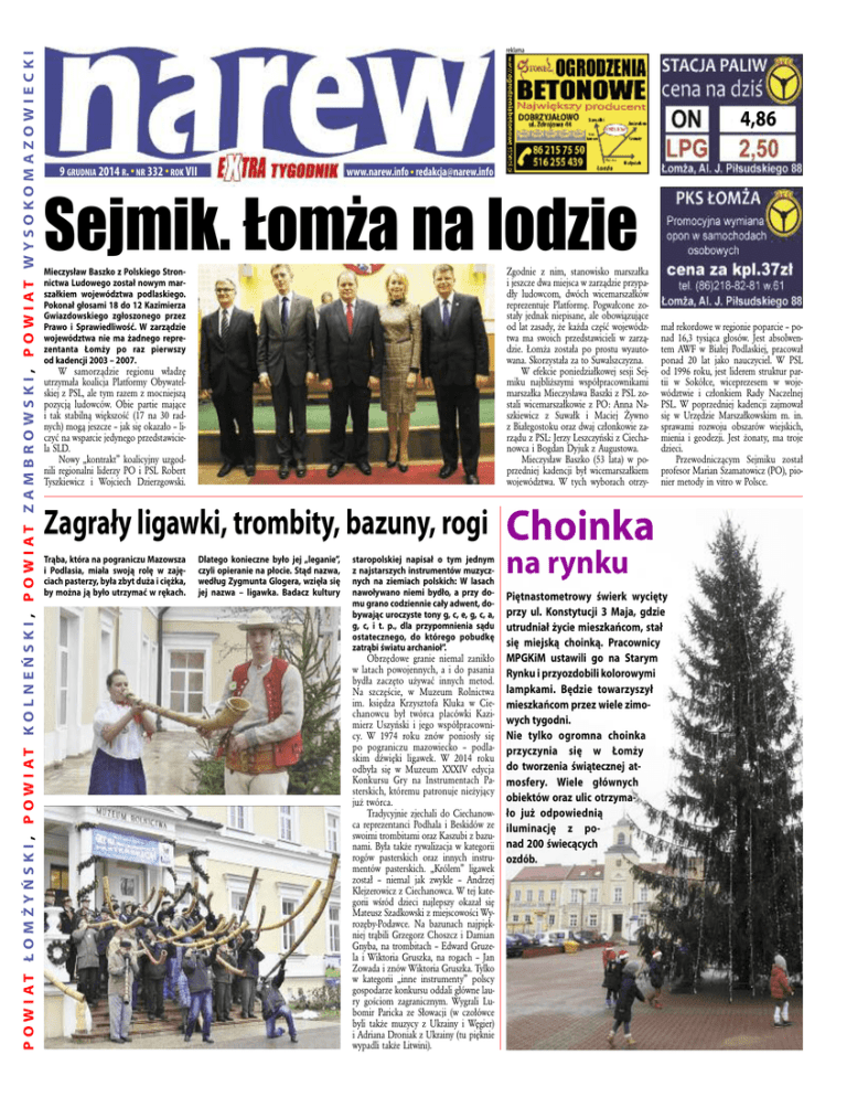 P O W I AT Ł O M Ż Y Ń S K I , P O W I AT KO L N E Ń S K I , P O W I AT Z A M B R O W S K I , P O W I AT W YS O KO M A Z O W I E C K I reklama 4,86 9 grudnia 2014 r. l nr 332 l rok Vii www.narew.info [email protected] l Sejmik. Łomża na lodzie Zgodnie z nim, stanowisko marszałka i jeszcze dwa miejsca w zarządzie przypadły ludowcom, dwóch wicemarszałków reprezentuje Platformę. Pogwałcone zostały jednak niepisane, ale obowiązujące od lat zasady, że każda część województwa ma swoich przedstawicieli w zarządzie. Łomża została po prostu wyautowana. Skorzystała za to Suwalszczyzna. W efekcie poniedziałkowej sesji Sejmiku najbliższymi współpracownikami marszałka Mieczysława Baszki z PSL zostali wicemarszałkowie z PO: Anna Naszkiewicz z Suwałk i Maciej Żywno z Białegostoku oraz dwaj członkowie zarządu z PSL: Jerzy Leszczyński z Ciechanowca i Bogdan Dyjuk z Augustowa. Mieczysław Baszko (53 lata) w poprzedniej kadencji był wicemarszałkiem województwa. W tych wyborach otrzy- Mieczysław Baszko z Polskiego Stronnictwa Ludowego został nowym marszałkiem województwa podlaskiego. Pokonał głosami 18 do 12 Kazimierza Gwiazdowskiego zgłoszonego przez Prawo i Sprawiedliwość. W zarządzie województwa nie ma żadnego reprezentanta Łomży po raz pierwszy od kadencji 2003 – 2007. W samorządzie regionu władzę utrzymała koalicja Platformy Obywatelskiej z PSL, ale tym razem z mocniejszą pozycją ludowców. Obie partie mające i tak stabilną większość (17 na 30 radnych) mogą jeszcze – jak się okazało – liczyć na wsparcie jedynego przedstawiciela SLD. Nowy „kontrakt” koalicyjny uzgodnili regionalni liderzy PO i PSL Robert Tyszkiewicz i Wojciech Dzierzgowski. Zagrały ligawki, trombity, bazuny, rogi Trąba, która na pograniczu Mazowsza i Podlasia, miała swoją rolę w zajęciach pasterzy, była zbyt duża i ciężka, by można ją było utrzymać w rękach. Dlatego konieczne było jej „leganie”, czyli opieranie na płocie. Stąd nazwa, według Zygmunta Glogera, wzięła się jej nazwa – ligawka. Badacz kultury staropolskiej napisał o tym jednym z najstarszych instrumentów muzycznych na ziemiach polskich: W lasach nawoływano niemi bydło, a przy domu grano codziennie cały adwent, dobywając uroczyste tony g, c, e, g, c, a, g, c, i t. p., dla przypomnienia sądu ostatecznego, do którego pobudkę zatrąbi światu archanioł”. Obrzędowe granie niemal zanikło w latach powojennych, a i do pasania bydła zaczęto używać innych metod. Na szczęście, w Muzeum Rolnictwa im. księdza Krzysztofa Kluka w Ciechanowcu był twórca placówki Kazimierz Uszyński i jego współpracownicy. W 1974 roku znów poniosły się po pograniczu mazowiecko – podlaskim dźwięki ligawek. W 2014 roku odbyła się w Muzeum XXXIV edycja Konkursu Gry na Instrumentach Pasterskich, któremu patronuje nieży jący już twórca. Tradycyjnie zjechali do Ciechanowca reprezentanci Podhala i Beskidów ze swoimi trombitami oraz Kaszubi z bazunami. Była także rywalizacja w kategorii rogów pasterskich oraz innych instrumentów pasterskich. „Królem” ligawek został – niemal jak zwykle – Andrzej Klejzerowicz z Ciechanowca. W tej kategorii wśród dzieci najlepszy okazał się Mateusz Szadkowski z miejscowości Wyrozęby-Podawce. Na bazunach najpiękniej trąbili Grzegorz Choszcz i Damian Gnyba, na trombitach – Edward Gruzela i Wiktoria Gruszka, na rogach – Jan Zowada i znów Wiktoria Gruszka. Tylko w kategorii „inne instrumenty” polscy gospodarze konkursu oddali główne laury gościom zagranicznym. Wygrali Lubomir Paricka ze Słowacji (w czołówce byli także muzycy z Ukrainy i Węgier) i Adriana Droniak z Ukrainy (tu pięknie wypadli także Litwini). mał rekordowe w regionie poparcie – ponad 16,3 tysiąca głosów. Jest absolwentem AWF w Białej Podlaskiej, pracował ponad 20 lat jako nauczyciel. W PSL od 1996 roku, jest liderem struktur partii w Sokółce, wiceprezesem w województwie i członkiem Rady Naczelnej PSL. W poprzedniej kadencji zajmował się w Urzędzie Marszałkowskim m. in. sprawami rozwoju obszarów wiejskich, mienia i geodezji. Jest żonaty, ma troje dzieci. Przewodniczącym Sejmiku został profesor Marian Szamatowicz (PO), pionier metody in vitro w Polsce. Choinka na rynku Piętnastometrowy świerk wycięty przy ul. Konstytucji 3 Maja, gdzie utrudniał życie mieszkańcom, stał się miejską choinką. Pracownicy MPGKiM ustawili go na Starym Rynku i przyozdobili kolorowymi lampkami. Będzie towarzyszył mieszkańcom przez wiele zimowych tygodni. Nie tylko ogromna choinka przyczynia się w Łomży do tworzenia świątecznej atmosfery. Wiele głównych obiektów oraz ulic otrzymało już odpowiednią iluminację z ponad 200 świecących ozdób. 2 / wydarzenia www.narew.info n n n wtorek 9 grudnia 2014 Feminizacja postępująca Nawet bez odgórnego narzucania parytetów regulujących relacje kobiet i mężczyzn we władzach dokonały się w Łomży i powiecie łomżyńskim istotne zmiany w tym zakresie. Stanowisko starosty objęła Elżbieta Parzych ze Zbójnej reprezentująca listę PSL. Nieco wcześniej całe szefostwo Rady Miejskiej Łomży utworzyły panie: przewodnicząca Bernadeta Krynicka i jej zastępczynie Alicja Konopka i Bogumiła Olbryś. Rozstrzygnięcie w powiecie łomżyńskim było jednak bardziej zaskakujące niż w samorządzie miasta, choć tu i tu podziały poszły nie wyłącznie w związku z przynależnością par tyjną. Poważnym kandydatem PSL na starostę miał być bowiem były poseł Józef Mioduszewski, a jego par tia, która zdobyła 7 z 17 miejsc w radzie, miała utworzyć większość z trójką przedstawicieli lokalnych komitetów Samorządy Łomżyńskie Razem i Łomżyńska Wspólnota Samorządowa. W opozycji mieli pozostać radni Prawa i Sprawiedliwości. Po serii konsultacji okazało się, że kandydatem PSL nie będzie jednak Józef Mioduszewski, bo samorząd nie chciał na stanowisko s