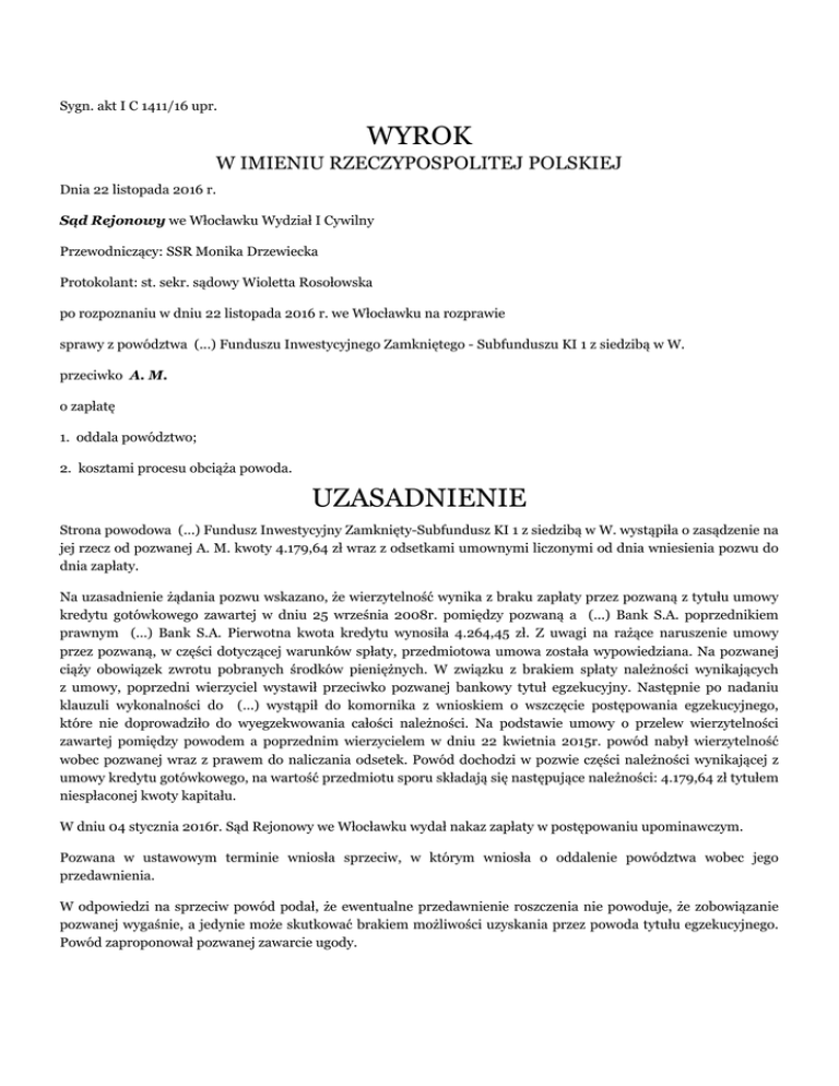 Sygn. akt I C 1411/16 upr. WYROK W IMIENIU RZECZYPOSPOLITEJ POLSKIEJ Dnia 22 listopada 2016 r. Sąd Rejonowy we Włocławku Wydział I Cywilny Przewodniczący: SSR Monika Drzewiecka Protokolant: st. sekr. sądowy Wioletta Rosołowska po rozpoznaniu w dniu 22 listopada 2016 r. we Włocławku na rozprawie sprawy z powództwa (...) Funduszu Inwestycyjnego Zamkniętego - Subfunduszu KI 1 z siedzibą w W. przeciwko A. M. o zapłatę 1. oddala powództwo; 2. kosztami procesu obciąża powoda. UZASADNIENIE Strona powodowa (...) Fundusz Inwestycyjny Zamknięty-Subfundusz KI 1 z siedzibą w W. wystąpiła o zasądzenie na jej rzecz od pozwanej A. M. kwoty 4.179,64 zł wraz z odsetkami umownymi liczonymi od dnia wniesienia pozwu do dnia zapłaty. Na uzasadnienie żądania pozwu wskazano, że wierzytelność wynika z braku zapłaty przez pozwaną z tytułu umowy kredytu gotówkowego zawartej w dniu 25 września 2008r. pomiędzy pozwaną a (...) Bank S.A. poprzednikiem prawnym (...) Bank S.A. Pierwotna kwota kredytu wynosiła 4.264,45 zł. Z uwagi na rażące naruszenie umowy przez pozwaną, w części dotyczącej warunków spłaty, przedmiotowa umowa została wypowiedziana. Na pozwanej ciąży obowiązek zwrotu pobranych środków pieniężnych. W związku z brakiem spłaty należności wynikających z umowy, poprzedni wierzyciel wystawił przeciwko pozwanej bankowy tytuł egzekucyjny. Następnie po nadaniu klauzuli wykonalności do (...) wystąpił do komornika z wnioskiem o wszczęcie postępowania egzekucyjnego, które nie doprowadziło do wyegzekwowania całości należności. Na podstawie umowy o przelew wierzytelności zawartej pomiędzy powodem a poprzednim wierzycielem w dniu 22 kwietnia 2015r. powód nabył wierzytelność wobec pozwanej wraz z prawem do naliczania odsetek. Powód dochodzi w pozwie części należności wynikającej z umowy kredytu gotówkowego, na wartość przedmiotu sporu składają się następujące należności: 4.179,64 zł tytułem niespłaconej kwoty kapitału. W dniu 04 stycznia 2016r. Sąd Rejonowy we Włocławku wydał nakaz zapłaty w postępowaniu upominawczym. Pozwana w ustawowym terminie wniosła sprzeciw, w którym wniosła o oddalenie powództwa wobec jego przedawnienia. W odpowiedzi na sprzeciw powód podał, że ewentualne przedawnienie roszczenia nie powoduje, że zobowiązanie pozwanej wygaśnie, a jedynie może skutkować brakiem możliwości uzyskania przez powoda tytułu egzekucyjnego. Powód zaproponował pozwanej zawarcie ugody. Pozwana nie odpowiedziała na propozycję powoda, tym samym należy uznać, że podtrzymała swoje dotychczasowe stanowisko. Sąd ustalił następujący stan faktyczny: W dniu 25 września 2008 roku, pozwana A. M. zawarła z (...) Bank S.A. umowę prostej pożyczki gotówkowej nr (...). Dowód: okoliczność bezsporna Z dniem 04 stycznia 2010r. nastąpiło połączenie (...) Bank S.A. z (...) Bank S.A. (...) Bank S.A. wstąpiła z dniem połączenia we wszystkie prawa i obowiązki (...) Bank S.A. Z dniem 01 czerwca 2012r. nastąpiło przeniesienie całego majątku (...) Bank S.A. z siedzibą w W. na (...) Bank S.A. z siedzibą w W.. (...) Bank S.A. wstąpił z dniem połączenia we wszystkie prawa i obowiązki (...) Bank S.A. Z dniem 01 czerwca 2012r. (...) Bank S.A. zmieniła nazwę na (...) Bank S.A. Dowód: okoliczności bezsporne W dniu 22 kwietnia 2015r. (...) Bank S.A. z siedzibą w W. zawarła ze stroną powodową (...) Funduszem Inwestycyjny Zamkniętym-Subfunduszem KI 1 z siedzibą w W. umowę sprzedaży wierzytelności, w ramach której przelano m.in. wierzytelność, wynikającą z opisanej powyżej umowy pożyczki przeciwko pozwanej. Dowód: okoliczności bezsporne; umowa sprzedaży wierzytelności wraz z załącznikami – k. 16-18, 30; odpis z KRS – k. 12-18, 19-28; wyciąg z rejestru funduszy inwestycyjnych – k. 11-11v Pismem z dnia 22 kwietnia 2015r. powód zawiadomił pozwaną o zakupie wierzytelności i pismem z dnia 08 maja 2015r. wezwał pozwaną do zapłaty kwoty 10.047,87 zł do dnia 15 maja 2015r. Dowód: zawiadomienie - pismo z dnia 22.04.2015r. – k. 31; pismo z dnia 08.05.2015r. – k. 32 Sąd zważył, co następuje: W ocenie Sądu powództwo nie jest zasadne i tym samym nie zasługuje na uwzględnienie. Roszczenia majątkowe (...) Bank S.A. z siedzibą w W. w stosunku do pozwanej, wynikające z opisanej powyżej umowy pożyczki gotówkowej są roszczeniami związanymi z jej działalnością gospodarczą, a tym samym przedawniają się w terminie trzech lat. Zgodnie bowiem z przepisem art. 118 k.c., jeżeli przepis szczególny nie stanowi inaczej, termin przedawnienia wynosi lat dziesięć, a dla roszczeń o świadczenia okresowe oraz roszczeń związanych z prowadzeniem działalności gospodarczej - trzy lata. Zgodnie z przepisem art. 123 § 1 pkt 1 k.c., bieg przedawnienia przerywa się przez każdą czynność przed sądem lub innym organem powołanym do rozpoznawania spraw lub egzekwowania roszczeń danego rodzaju albo przed sądem polubownym, przedsięwziętą bezpośrednio w celu dochodzenia lub ustalenia albo zaspokojenia lub zabezpieczenia roszczenia. W przedmiotowej sprawie, powód, któremu doręczono odpis sprzeciwu, nie wykazał żadnej czynności, która spowodowała przerwanie biegu terminu przedawnienia. Powód nie przedłożył również umowy pożyczki gotówkowej, nie wskazał również terminu wymagalności roszczenia. Powód przede wszystkim nie zaprzeczył zarzutowi przedawnienia roszczenia zgłoszonemu przez pozwaną, jedynie wystąpił z propozycją zawarcia ugody. Biorąc powyższe pod uwagę, Sąd uznał, że powód nie udowodnił roszczenia, nadto termin przedawnienia dochodzonego w niniejszej sprawie roszczenia upłynął najwcześniej w dniu 26 września 2011r., a więc powód nabył wierzytelność przedawnioną. Zgodnie natomiast z przepisem art. 117 § 2 zd. 1 k.c., po upływie terminu przedawnienia ten, przeciwko komu przysługuje roszczenie, może uchylić s