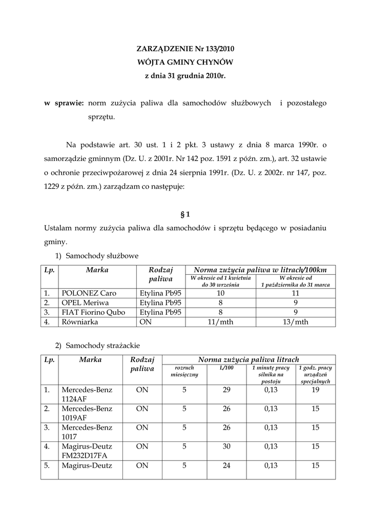 ZARZĄDZENIE Nr 133/2010 WÓJTA GMINY CHYNÓW z dnia 31 grudnia 2010r. w sprawie: norm zużycia paliwa dla samochodów służbowych i pozostałego sprzętu. Na podstawie art. 30 ust. 1 i 2 pkt. 3 ustawy z dnia 8 marca 1990r. o samorządzie gminnym (Dz. U. z 2001r. Nr 142 poz. 1591 z późn. zm.), art. 32 ustawie o ochronie przeciwpożarowej z dnia 24 sierpnia 1991r. (Dz. U. z 2002r. nr 147, poz. 1229 z późn. zm.) zarządzam co następuje: §1 Ustalam normy zużycia paliwa dla samochodów i sprzętu będącego w posiadaniu gminy. 1) Samochody służbowe Lp. 1. 2. 3. 4. Marka POLONEZ Caro OPEL Meriwa FIAT Fiorino Qubo Równiarka Norma zużycia paliwa w litrach/100km Rodzaj paliwa W okresie od 1 kwietnia do 30 września W okresie od 1 października do 31 marca 10 8 8 11/mth 11 9 9 13/mth Etylina Pb95 Etylina Pb95 Etylina Pb95 ON 2) Samochody strażackie Lp. 1. 2. 3. 4. 5. Marka Mercedes-Benz 1124AF Mercedes-Benz 1019AF Mercedes-Benz 1017 Magirus-Deutz FM232D17FA Magirus-Deutz Rodzaj paliwa Norma zużycia paliwa litrach rozruch miesięczny L/100 1 minutę pracy silnika na postoju 1 godz. pracy urządzeń specjalnych ON 5 29 0,13 19 ON 5 26 0,13 15 ON 5 26 0,13 15 ON 5 30 0,13 15 ON 5 24 0,13 15 6. Jelcz 315 ON 5 31,50 0,13 15 7. Star 244 ON 5 26 0,13 15 8. Lublin III ON 2,5 13 0,07 brak 9. Volkswagen Transporter T-4 Ford Transit 100S Pb95 2,5 13 0,07 brak Pb95 2,5 13 0,07 brak 10. 3) Pozostały sprzęt Lp. 1. 2. 3. 4. 5. 6. 7. 8. 9. 10. Marka i typ sprzętu Motopompa Honda WT40X Motopompa Honda WT30X Motopompa Honda SEH-50T Motopompa KTH-80X Motopompa pływająca LEDA M8/3 Motopompa Honda 402S Motopompa pływająca NIAGARA Motopompa PO-5 Agregat gaśniczy AW40/40 Agregat prądotwórczy BENZA TR-4300 Rodzaj paliwa Pb95 Pb95 Pb95 Pb95 Pb95 Pb95 Pb95 Pb95 Pb95 Pb95 Norma zużycia paliwa L/h 4 2,6 1 2,6 3,6 1,8 1 12 5 3 §2 Kierowca obowiązany jest na bieżącą wpisywać w karcie drogowej ilość paliwa pobranego i zużytego. Rozliczenie zużycia paliwa następować będzie w okresach miesięcznych na podstawie karty drogowej. §3 Traci moc Zarządzenie Nr 52/2009 Wójta Gminy Chynów z dnia 7 lipca 2009r. §4 Zarządzenie wchodzi w życie z dniem 1 stycznia 2011r.