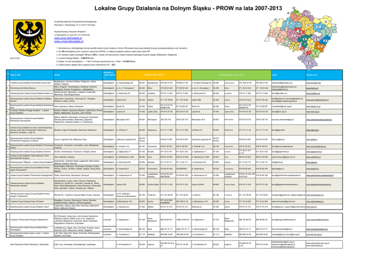 Lokalne Grupy Działania na Dolnym Śląsku - PROW na lata 2007-2013 Urząd Marszałkowski Województwa Dolnośląskiego Wybrzeże J. Słowackiego 12-14, 50-411 Wrocław Wydział Rozwoju Obszarów Wiejskich ul. Mazowiecka 15, pok.341 (71) 776-93-50 www.prow.dolnyslask.pl www.umwd.dolnyslask.pl 1. Na terenie woj. dolnośląskiego funkcjonują 22 Lokalne Grupy Działania z których 19 posiada tutaj swoją siedzibę (3 grupy posiadają siedzibę w woj. lubuskim). 2. Na 169 dolnośląskich gmin, zgodnie z wytycznymi PROW, w realizacji działania Leadera mogło wziąć udział 137 3. Do realizacji Leader przystąpiło 135 gmin (80%). Udziału nie biorą 2 gminy miejsko-wiejskie spełniające kryteria dostępu (Międzybórz i Bogatynia). 2010.10.29 4. Ludność Dolnego Śląska - 2 880 078 osób 5. Budżet 19 LGD dolnośląskich = 1 188 519 (liczba mieszkańców lsr) x 148zł = 175 900 812 zł, 6. Udział ludności objętej LSR w ogólnej liczbie mieszkańców DŚ - 42% L.p Nazwa LGD . Gminy Siedziba w województwi e Siedziba: adres, tel/fax Korespondencja: adres, tel.fax email Strona www 1 "Lokalna Grupa Działania Partnerstwo Ducha Gór" Mysłakowice, Janowice Wielkie, Podgórzyn, Jeżów Sudecki, Karpacz Dolnośląskim ul. Daszyńskiego 29 58-533 Mysłakowice 075 644 21 65 075/644 21 65 ul. Wojska Polskiego 40 58-500 Jelenia Góra 075 644 21 65 075 644 21 65 [email protected] www.duchgor.org 2 Partnerstwo dla Doliny Baryczy Milicz, Żmigród, Twardodogóra, Cieszków, Krośnice, (Odolanów, Sośnie, Przygodzice - wielkopolska) Dolnośląskim pl. ks. E. Waresiaka 7 56-300 Milicz 071/38 30 432 071/38 30 432 pl. ks. E. Waresiaka 7 56-300 Milicz 071 38 30 432 071 38 30 432 [email protected]; [email protected] www.barycz.pl 3 "Stowarzyszenie Lokalna Grupa Działania Kwiat Lnu" Kamienna Góra, Marciszów, Lubawka, Czarny Bór, Mieroszów, Stare Bogaczowice Dolnośląskim ul. Dworcowa 33 58-420 Lubawka 075 74 11 804 075/74 11 804 ul. Dworcowa 33 58-420 Lubawka 075 74 11 804 075 74 11 804 [email protected] www.kwiatlnu.eu 4 Stowarzyszenie Lokalna Grupa Działania "Szlakiem Granitu" Dobromierz, Kostomłoty, Jaworzyna Śl., Strzegom, Świdnica, Udanin, Żarów Dolnośląskim Udanin 86 b 55-340 Udanin 071 733 78 88 071 733 78 80 Udanin 86b 55-340 Udanin 076 87 09 222 076 87 09 242 [email protected]; [email protected]; [email protected] www.lgd-szlakiemgranitu.pl 5 Stowarzyszenie Lokalna Grupa Działania Starorzecze Jelcz Laskowice, Oława, Domaniów Odry Dolnośląskim Rynek 25 55-200 Oława 071 313 41 57; 606903184 071 30 28 027 Rynek 25 55-200 Oława 071 313 41 57; 606903184 071 30 28 027 [email protected] www.leader-so.pl 6 Fundacja "Kłodzka Wstęga Sudetów" - Lokalna Grupa Działania Kłodzko, Radków, Bystrzyca Kłodzka, Lądek Zdrój, Stronie Dolnośląskim Śląskie, Międzylesie, Szczytna, Lewin Kłodzki Lutynia 24 57-540 Lądek-Zdrój 074 814 81 59 074 814 81 59 Lutynia 24 57-540 Lądek-Zdrój 074 814 81 59 074 814 81 59 [email protected] www.kws.org.pl 7 Stowarzyszenie "Lokalna Grupa Działania Partnerstwo Kaczawskie" Bolków, Męcinka, Mściwojów, Krotoszyce, Paszowice, Złotoryja-gmina wiejska, Świerzawa, Zagrodno, Pielgrzymka, Wądroże Wielkie, m. Wojcieszów Dolnośląskim Mściwojów 45 A 59-407 Mściwojów 768 728 718 076 87 28 718 Mściwojów 45 A 59-407 Mściwojów 076 87 28 718 076 87 28 718 [email protected] www.partnerstwokaczawskie.pl 8 Lokalna Grupa Działania na rzecz zrównoważonego rozwoju gmin Kąty Wrocławskie, Kobierzyce, Siechnice, Żórawina - Lider A4 Żórawina, Kąty Wrocławskie, Siechnice, Kobierzyce Dolnośląskim ul. Witosa 15 55-040 Kobierzyce 071 31 17 358 071 31 17 358 ul.Witosa 15 55-040 Kobierzyce 071 31 111 35 071 31 111 35 [email protected] www.lider-a4.pl 9 Stowarzyszenie Lokalna Grupa Działania "Partnerstwo Integracja Turystyka" Kunice, Legnickie Pole, Miłkowice, Ruja Dolnośląskim Jaśkowice Legnickie 49 59-216 Kunice - 076 85 75 097 076 85 75 097 Jaśkowice Legnickie 49 59-216 Kunice - 076 85 75 097 076 85 75 097 [email protected] www.lgdpit.pl 10 Stowarzyszenie Lokalna Grupa Działania "Wrzosowa Przemków, Chocianów, Gromadka, Lubin, Bolesławiec, Kraina" Chojnów Dolnośląskim ul. Wesoła 12 b 59-140 Chocianów 076 81 84 541 076 81 84 541 ul. Wesoła 12 b 59-140 Chocianów 076 81 84 541 076 81 84 541 [email protected] www.wrzosowakraina.pl Strzelin, Kondratowice, Przeworno, Wiązów, Borów Dolnośląskim ul. Ząbkowicka 11 57-100 Strzelin 071 39 21 971 071 39 21 303 ul. Ząbkowicka 11 57-100 Strzelin 071 39 21 971 w.117 071 39 21 303 [email protected] www.lgdgromnik.pl Góra, Niechlów, Wąsosz Dolnośląskim ul. Mickiewicza 1/200 56-200 Góra 065 54 43 640 O65 54 32 658 ul. Mickiewicza 1/200 56-200 Góra 065 54 43 640 065 54 32 658 [email protected] www.szlakodry.pl Dzierżoniów, Jordanów Śląski, Łagiewniki, Marcinowice, Mietków, Sobótka, Niemcza Dolnośląskim ul. Kościuszki 2/4 55-050 Sobótka 071 31 62 171 071 31 62 171 ul. Kościuszki 2/4 55-050 Sobótka 071 31 62 171 071 31 62 171 [email protected] www.sleza.pl Środa Śląska, Malczyce, Prochowice, Ścinawa, Wołów, Wińsko, Rudna, Jemielno, Pęcław, Głogów, Brzeg Dolny, Miękinia Dolnośląskim pl. Kopernika 6 59-230 Prochowice 076 85 84 545 076/8585454 pl. Kopernika 6 59-230 Prochowice 076 85 84 545 076 85 85 454 [email protected] www.lgdodra.pl Dolnośląskim ul. Kasprowicza 47 57-450 Ludwikowice Kłodzkie 074 84 94 343; 666038466 074 84 94 355 ul. Kasprowicza 47 57-450 Ludwikowice Kłodzkie 074 87 16 150; 074 074 84 94 355 84 94 343 [email protected] www.partnerstwo.sowiogorskie.pl Nowogrodziec, Lubań, Leśna, Olszyna, Platerówka, Siekierczyn, Gryfów Śl., Lubomierz, Lwówek Śl., Mirsk, Wleń, Warta Bolesławiecka, Stara Kamienica, Świeradów Zdrój, Zgorzelec, Sulików, Zawidów-gm. Miejska Dolnośląskim Ubocze 300 59-620 Gryfów Śląski 075 78 13 163 075 78 13 163 Ubocze 300/54 59-620 Gryfów Śląski 075 78 13 163 075 78 13 163 [email protected] www.lgdpar