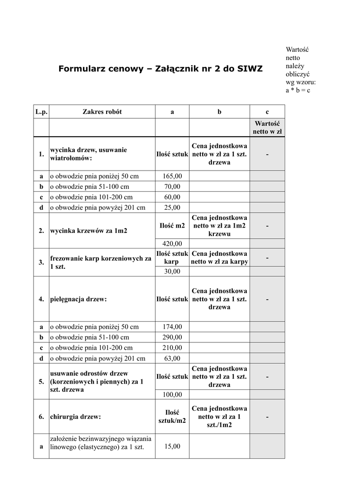 Wartość netto należy obliczyć wg wzoru: a*b=c Formularz cenowy – Załącznik nr 2 do SIWZ L.p. Zakres robót a b c Wartość netto w zł wycinka drzew, usuwanie 1. wiatrołomów: a b c d o obwodzie pnia poniżej 50 cm o obwodzie pnia 51-100 cm o obwodzie pnia 101-200 cm o obwodzie pnia powyżej 201 cm Cena jednostkowa Ilość sztuk netto w zł za 1 szt. drzewa - 165,00 70,00 60,00 25,00 Cena jednostkowa netto w zł za 1m2 krzewu - 420,00 Ilość sztuk Cena jednostkowa frezowanie karp korzeniowych za karp netto w zł za karpy 3. 1 szt. 30,00 - Cena jednostkowa Ilość sztuk netto w zł za 1 szt. drzewa - 2. wycinka krzewów za 1m2 4. pielęgnacja drzew: a b c d o obwodzie pnia poniżej 50 cm o obwodzie pnia 51-100 cm o obwodzie pnia 101-200 cm o obwodzie pnia powyżej 201 cm usuwanie odrostów drzew 5. (korzeniowych i piennych) za 1 szt. drzewa 6. chirurgia drzew: założenie bezinwazyjnego wiązania a linowego (elastycznego) za 1 szt. Ilość m2 174,00 290,00 210,00 63,00 Cena jednostkowa Ilość sztuk netto w zł za 1 szt. drzewa 100,00 Ilość sztuk/m2 15,00 Cena jednostkowa netto w zł za 1 szt./1m2 - - zabezpieczenie ubytku poprzez uformowanie krawędzi rany, wygładzenie jej powierzchni, wykonanie drenażu w b uzasadnionych przypadkach, chemiczne zabezpieczenie krawędzi rany środkiem impregnacyjnym za 1m2 ubytku c założenie odciągu linowego za 1 szt. d założenie podpory za 1 szt. 20,00 5,00 2,00 Cena jednostkowa wymiana/naprawa/założenie Ilość sztuk netto w zł za 1 szt. 7. nowych stelaży przy drzewach za 1 stelaża szt. 40,00 Cena jednostkowa wykonanie oprysków ochronnych za Ilość m2 netto w zł za 1m2 8. 1m2 500,00 nawożenie roślin nawozami 9. mineralnymi wieloskładnikowymi: Ilość sztuk/m2 a krzewów za 1 m2 b drzew za 1 szt. c trawników za 1 m2 3 000,00 100,00 3 000,00 10. podlewanie roślin: Ilość sztuk/m2 a kwiaty i krzewy za 1 m2 b trawniki za 1 m2 c drzewa za 1 szt. (minimum 50 l wody na jednokrotne podlewanie) Walka ze szkodnikiem 11. szrotówkiem kasztanowcowiaczkiem: zawieszenie w koronie drzewa 1 szt. pułapki kominowej (znajdującej się w posiadaniu Zamawiającego), wraz a z zakupem dyspensera feromonowego oraz środka owadobójczego. zawieszenie w koronie drzewa 1 szt. pułapki kominowej wraz z kosztem b zakupu kompletu zawierającego pułapkę, dyspenser feromonowy i środek owadobójczy. - - Cena jednostkowa netto w zł za 1 szt./1m2 - Cena jednostkowa netto w zł za 1 szt./1m2 - Cena jednostkowa netto w zł za 1 szt. - 5 000,00 5 000,00 317,00 Ilość sztuk 224,00 15,00 wyczyszczenie i dezynfekcja pułapki zawieszonej na drzewie, uzupełnienie dyspensera c feromonowego i środka owadobójczego w 1 szt. pułapki wraz z jej ponownym zawieszeniem. zdjęcie 1 szt. pułapki po zakończeniu sezonu wegetacyjnego d wraz z jej wyczyszczeniem i dezynfekcją. jednorazowe wyczyszczenie 1 szt. e zawieszonej na drzewie budki lęgowej dla sikorek f montaż 1 szt. budki lęgowej dla sikorek, wraz z zakupem budki lęgowej typu A (wg Sokołowskiego) zbudowanej z drewna oraz w razie potrzeby kosztem usunięcia starej budki lęgowej 239,00 239,00 107,00 5,00 Łączna wartość netto: Podatek VAT 8% Łączna wartość brutto: 1. Powyższe ceny netto obejmują wszelkie narzuty, robociznę, prace sprzętu, koszty jednorazowe, dodatki za utrudnienia, koszty ogólne oraz zysk i zostanie powiększone o podatek VAT w wysokości obowiązującej w dniu wykonania robót. 2. Założone w szacunku ilości sztuk/m2 są orientacyjne i w ciągu realizacji przedmiotu zamówienia mogą ulec zmianom w zależności od potrzeb jakie wystąpią. \ Data: ......................... ............................................................... ( podpis i pieczęć osoby uprawnionej)