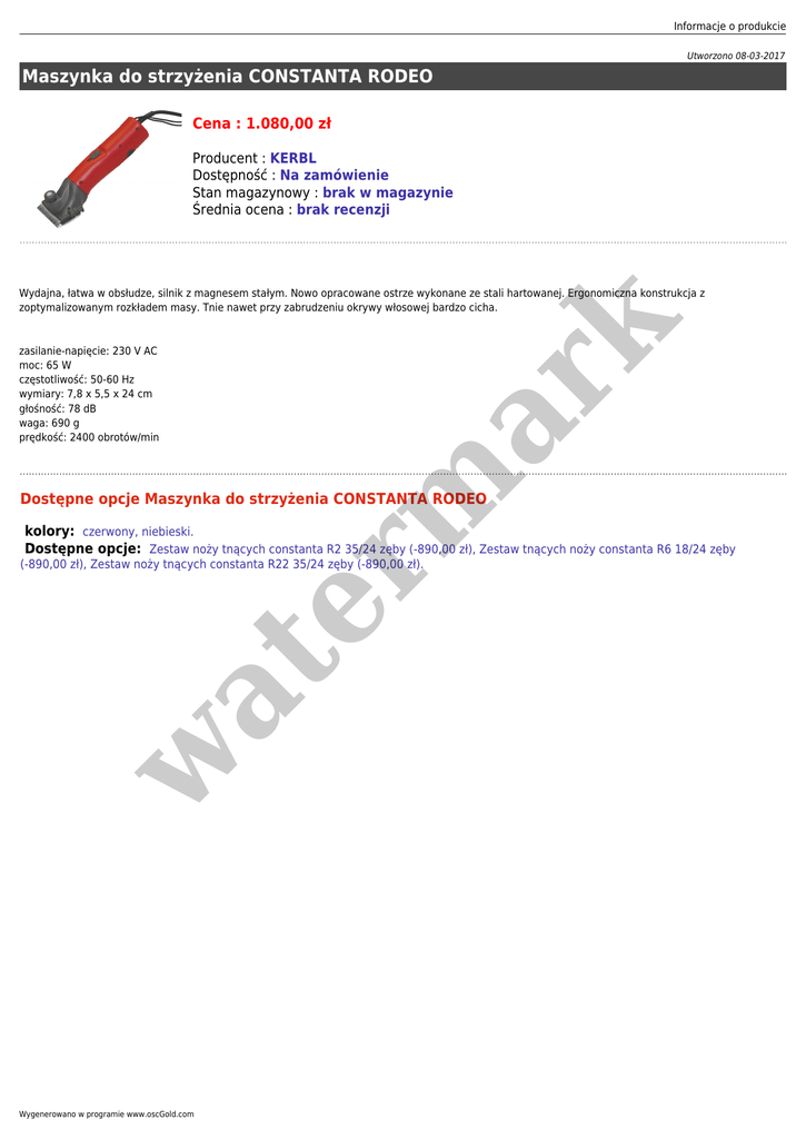 Informacje o produkcie Utworzono 08-03-2017 Maszynka do strzyżenia CONSTANTA RODEO Cena : 1.080,00 zł Producent : KERBL Dostępność : Na zamówienie Stan magazynowy : brak w magazynie Średnia ocena : brak recenzji zasilanie-napięcie: 230 V AC moc: 65 W częstotliwość: 50-60 Hz wymiary: 7,8 x 5,5 x 24 cm głośność: 78 dB waga: 690 g prędkość: 2400 obrotów/min er m ar k Wydajna, łatwa w obsłudze, silnik z magnesem stałym. Nowo opracowane ostrze wykonane ze stali hartowanej. Ergonomiczna konstrukcja z zoptymalizowanym rozkładem masy. Tnie nawet przy zabrudzeniu okrywy włosowej bardzo cicha. Dostępne opcje Maszynka do strzyżenia CONSTANTA RODEO kolory: czerwony, niebieski. Dostępne opcje: Zestaw noży tnących constanta R2 35/24 zęby (-890,00 zł), Zestaw tnących noży constanta R6 18/24 zęby w at (-890,00 zł), Zestaw noży tnących constanta R22 35/24 zęby (-890,00 zł). Wygenerowano w programie www.oscGold.com