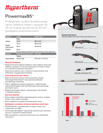 Powermax85® Profesjonalny system do plazmowego cięcia i żłobienia metalu o grubości do 25 mm (cięcie ręczne) lub do 20 mm (przebijanie zmechanizowane). Wydajność Grubość Szybkość cięcia Zalecana Cięcie 25 mm 32 mm 500 mm/min 250 mm/min 38 mm 125 mm/min Odcięcie (cięcie ręczne) Przebicie* Standardowe palniki Duramax (więcej opcji palników można znaleźć w witrynie www.hypertherm.com) Palnik ręczny 75° 20 mm * Wydajność przebijania dotyczy zastosowania ręcznego lub z automatycznym sterowaniem wysokością palnika Wydajność Współczynnik usuwania metalu Profil rowka Żłobienie Typowe żłobienie 8,8 kg na godz. 5,8 mm dł. x 7,1 mm szer. Palnik ręczny 15° Maksymalna produktywność • Dzięki 2,5-krotnie większej szybkości cięcia zadania cięcia stali miękkiej o grubości 12 mm są realizowane w krótszym czasie niż w systemach paliwowo-tlenowych. • Niezrównana jakość cięcia i żłobienia oznacza krótszy czas szlifowania i przygotowania krawędzi. Mały palnik zmechanizowany 180° Łatwość obsługi podczas cięcia i żłobienia • Brak konieczności zmiany ciśnienia powietrza. Dzięki technologii Smart Sense™ masz pewność dobrania prawidłowego ustawienia. • Cięcie ciągnięte przy pełnej wydajności z opatentowaną osłoną ograniczającą ilość gromadzonego żużlu gwarantuje płynniejsze cięcie. • Realizuj różnorodne zadania, wykorzystując wiele łatwych w obsłudze palników. Palnik zmechanizowany 180° o pełnej długości Względna wydajność cięcia stali miękkiej Niskie koszty eksploatacji • Duża trwałość materiałów eksploatacyjnych oznacza mniejsze koszty i mniej czasów przestoju. • Duża wydajność energetyczna obniża pobór mocy. 250% szybciej przy 12 mm Powermax85 System paliwowotlenowy • Palniki Duramax™ zaprojektowano z myślą o dużej mocy i odporności na ciepło. • Technologia SpringStart™ gwarantuje niezmienność warunków rozruchu i poprawia trwałość palnika. • Małe wymagania w zakresie konserwacji oraz maksymalny czas pracy. Szybkość cięcia Wyprodukowane i przetestowane, aby wytrzymać najtrudniejsze warunki robocze 12 mm Grubość 20 mm 25 mm Specyfikacje Napięcia wejścia 400 V, 3 fazy, 50/60 Hz Moc wyjściowa (kW) 12,2 kW Prąd wejściowy przy 12,2 kW 380/400 V, 3 fazy, 20,5/19,5 A Prąd wyjściowy 25–85 A Znamionowe napięcie wyjściowe 143 V DC Cykl pracy przy 40 °C 60% przy 85 A, 380/400 V, 3 fazy 100% przy 66 A, 380/400 V, 3 fazy Napięcie obwodu otwartego (OCV) 270 V DC Wymiary z rękojeściami 500 mm gł. x 234 mm szer. x 455 mm wys. Masa z palnikiem 7,6 m 28 kg Zasilanie gazem Czyste, suche powietrze bezolejowe lub azot Zalecana szybkość przepływu gazu wlotowego / ciśnienie Cięcie: 189 l/min przy 5,6 bara Żłobienie: 212 l/min przy 4,8 bara Długość wejściowego kabla zasilającego 3 m Typ zasilacza Inwertor — IGBT (tranzystor bipolarny z izolowaną bramką) Wymagana moc znamionowa napędu 20 kW przy pełnym natężeniu prądu wyjściowego 85 A Zgodność z normami CE, C-Tick, CU/GOST, Ukr. i Serbska — do użytku w Europie, Australii, Białorusi, Kazachstanie, Rosji, Serbii i Ukrainie oraz w innych dopuszczonych krajach. Gwarancja Zasilacze są objęte gwarancją trzyletnią, a palniki — roczną. Informacje dotyczące zamówień Poniżej pokazano standardowe konfiguracje systemu, obejmujące zasilacz, palnik i przewód roboczy. Palnik ręczny 75° 7,6 m z filtrem Eliminizer i pokrywą Zasilacze Standardowy zasilacz 087117 Zasilacz z portem CPC i dzielnikiem napięcia 087122 Zasilacz z portem CPC, dzielnikiem napięcia i portem szeregowym 15,2 m 087120 Palniki ręczne 75° i 15° 7,6 m Palnik zmechanizowany 180° o pełnej długości 15,2 m bez zdalnego włącznika Palnik zmechanizowany 180° o pełnej długości i palnik ręczny 75° 7,6 m 15,2 m ze bez z kablami ze bez zdalnym zdalnego we/wy (bez zdalnym zdalnego włącznikiem włącznika włącznika) włącznikiem włącznika 7,6 m z kablami we/wy (bez włącznika) ze zdalnym włącznikiem 087118 087123 087146 087147 087124 087131 087125 087139 087136 087141 Konfiguracje niestandardowe (możliwość dobrania zasilacza, zestawu materiałów eksploatacyjnych do palnika, przewodu roboczego i innych komponentów) Opcje zasilaczy Zasilacz standardowy Zasilacz z portem CPC i dzielnikiem napięcia Zasilacz z portem CPC, dzielnikiem napięcia i portem szeregowym 087068 087106 087107 Cięcie ręczne Cięcie zmechanizowane Cięcie zmechanizowane z nasadką omową 228966 228967 228968 400 V CE Opcje startowych zestawów materiałów eksploatacyjnych Zestaw Opcje palników Palniki ręczne Długość kabla 75° Palniki zmechanizowane 15° 4,5 m 7,6 m 059473 059470 10,7 m 180° Mały 180° 059476 059481 059477 059482 059478 059483 059484 15,2 m 059474 059471 059479 22,8 m 059475 059472 059480 Palniki zrobotyzowane 45° 90° 180° 059464 059465 059466 Opcje kabli i przewodów Przewody robocze Kable sterujące CNC, złącze CNC, złącze CNC, Komunikacja Komunikacja widełkowe, widełkowe, bez złącze Dsub, szeregowa RS-485, szeregowa RS-485, dzielone napięcie dzielonego napięcia dzielone napięcie niezakończony D-sub Zacisk ręczny Zacisk typu C Zacisk pierścieniowy 7,6 m 223035 223203 223209 128650 228350 023206 223048 223236 223239 15,2 m 223034 223204 223210 128651 228351 023279 123896 223237 223240 22,8 m 223033 223205 223211 128652 Długość kabla Zdalny włącznik Materiały eksploatacyjne do palnika Dysze i elektrody są dostępne w różnych ilościach. W celu uzyskania dalszych informacji należy się skontaktować z dystrybutorem. Typ materiału eksploatacyjnego Cięcie ciągnięte Cięcie zmechanizowane FineCut® Żłobienie 1 2 Typ palnika Ręczny Zmechanizowany Ręczny Zmechanizowany Ręczny Zmechanizowany Deflektor do cięcia nieosłoniętego Nasadka omowa Natężenie prądu Dysza 45 220941 65 220819 85 220816 45 220941 65 220819 85 220816 45 220930 25–85 220797 Osłona/ Deflektor Nasad