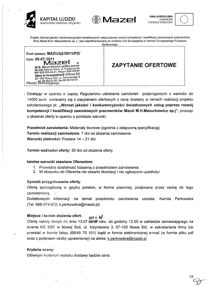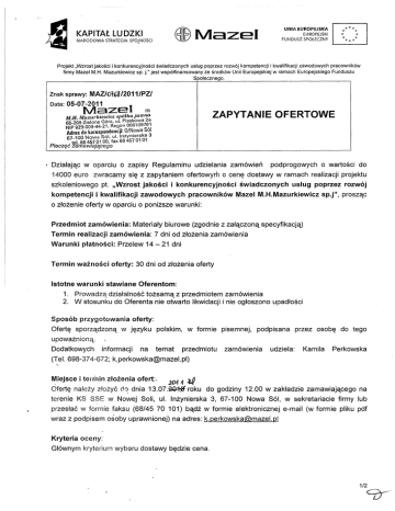 KAPITAŁ ~MazeI lU DZKI NARODOWA STRATEGIA SPÓJ,NOŚCI * *** * * *** * UNIA EUROPEJSKA EUROPEJSKI FUNDUSZ SPOŁECZNY ** Projekt "Wzrost jakości i konkurencyjności świadczonych usług poprzez rozwój kompetencji i kwalifikacji zawodowych pracowników firmy Mazel M.H. Mazurkiewicz sp. j." jest współfinansowanyze środków Unii Europejskiej w ramach Europejskiego Funduszu Społecznego. Znak sprawy: Data: MAZ/Ot6812011/PZ/ I 05-07-2011 Maze. (9) ZAPYTANIE OFERTOWE M.H. Mazurkiewicz spó~kajawna 65-209 Zielona Góra, ul. Piaskowa 2a NIP 929-009-44-21, Rego n 00610976} Adres dokorespondencji: OIN.owa Sol 67-100 Nowa sól, ul. Inzynterska 3 • tel. 68 4!ł7 pl 00, fax 68 457 01 01 . Pieczęć zamawiającego Działając W oparciu o zapisy Regulaminu udzielania zamówień podprogowych o wartości do 14000 euro zwracamy się z zapytaniem ofertowym o cenę dostawy w ramach realizacji projektu szkoleniowego pt. "Wzrost jakości i konkurencyjności świadczonych usług poprzez rozwój kompetencji i kwalifikacji zawodowych pracowników Mazel M.H.Mazurkiewicz sp.j", o złożenie oferty w oparciu o poniższe prosząc warunki: Przedmiot zamówienia: Materiały biurowe (zgodnie z załączoną specyfikacją) Termin realizacji zamówienia: 7 dni od złożenia zamówienia Warunki Termin płatności: Przelew 14 - 21 dni ważności oferty: 30 dni od złożenia oferty Istotne warunki stawiane Oferentom: 1. Prowadzą działalność tożsamą z przedmiotem zamówienia 2. W stosunku do Oferenta nie otwarto likwidacji i nie ogłoszono upadłości Sposób przygotowania oferty: Ofertę sporządzoną w języku polskim, w formie pisemnej, podpisana przez osobę do tego upoważnioną. Dodatkowych informacji na temat przedmiotu zamówienia udziela: Kamila Perkowska (Tel. 698-374-672; [email protected]) . ~ ~iejsce i termln złożenia ofert.. ;'04 Ą ~ Ofertę należy złożyć do dnia 13.07.~ roku do godziny 12.00 w zakładzie zamawiającego na terenie KS SSE w Nowej Soli, ul. Inżynierska 3, 67-100 Nowa Sól, w sekretariacie firmy lub przesłać w formie faksu (68/45 70 101) bądź w formie elektronicznej e-mail (w formie pliku pdf wraz z podpisem osoby uprawnionej) na adres:[email protected] Kryteria oceny: Głównym kryterium wyboru dostawy będzie cena. 1/2 CO-" KAPITAŁ LU DZKI NARODOWA STRATEGIA SPÓJNOŚCI ~MazeI UNIA EUROPEJSKA EUROPEJSKI FUNDUSZ SPOŁECZNY **** * * *** * ** Projekt "Wzrost jakości i konkurencyjności świadczonych usług poprzez rozwój kompetencji i kwalifikacji zawodowych pracowników firmy MazeLM.H. Mazurkiewicz sp. j." jest współfinansowanyze środków Unii Europejskiej w ramach Europejskiego Funduszu Społecznego. Miejsce dostawy: Zakład zamawiającego na Zakup dostawy Funduszu terenie KS SSE w Nowej Soli, ul. współfinansowany jest Cenę Unię Europejską 3,67-100 Nowa SÓl. w ramach Europejskiego Społecznego. Oferta pod rygorem jej odrzucenia winna 1. przez Inżynierska netto, VAT, wartość brutto za zawierać: całe zadanie oraz za poszczególne elementy wraz z dostawą. 2. Wypis z Krajowego Rejestru Sądowego lub wpis do ewidencji działalności gospodarczej (dokument może być dostarczony w formie potwierdzonej kopii). 3. W przypadku gdy ofertę podpisuje inna osoba niż to wynika z dokumentu rejestrowego pełnomocnictwo do reprezentowania Oferenta (w tym do podpisywania ofert). 4. Oświadczenia następującej treści: Oświadczam, iż : przedmiot prowadzonej przeze mnie działalności jest tożsamy z przedmiotem zamówienia b. posiadam niezbędną wiedzę i doświadczenie oraz dysponuję potencjałem finansowym; technicznym i kadrowym zapewniającym wykonanie zamówienia c. w stosunku do firmy nie otwarto likwidacji i nie ogłoszono upadłości d. jestem związany ofertą do dnia podpisania umowy a. PRO~T Katarzyna Chrzanowska (podpis pracownika prowadzącego sprawę) 2/2 KAPITAŁ LU DZKI NARODOWA STRATEGIA SPÓJNOŚCI ~Mazel UNIAEUROPEJSKA EUROPEJSKI FUNDlJSZ SPOŁECZNY **** * ** * *** * Projekt "Wzrost jakości i konkurencyjności świadczonych usług poprzez rozwój kompetencji i kwalifikacji zawodowych pracowników firmy Mazel M.H. Mazurkiewicz sp. j." jest współfinansowanyze środków Unii Europejskiej w ramach Europejskiego Funduszu Społecznego. Znak sprawy: MAZ()ł6~ /2011/PZ/ Data: 05-07-2lł\h MazurkĘ3.;;ze I M.H. (9) 65-209 Zielona·e~zcz Spó~kajawna SPECYFIKACJA DO ZAPYTANIA OFERTOWEGO NIP 929-009_44_~fr~, ul. Piaskowa 2a " Adres d k • egon 006109761 67-100 ~ orespo!!dencji: O/Nowa Sól . owa Sol,ul. Inz'ymerska . 3 """""""'t1OV, fax 68 457 01 01 Pieczęć zamlaM:<lIQ1'~ Lp. Nazwa Ilość Uwagi (minimalne wymagania) Zewnętrzna 1. Segregator A4 75mm 20szt. - okleina PP - kolor niebieski 2. Papier do ksera 20ryz - Pol Lux, niebieski, 80g, A4 - Zakładki w min. 4 różnych kolorach (Ilość 3. Indeksy samoprzylepne 30p. fiszek w danym kolorze min. 20) - typu: np. Donau 4. Toner do HP P1505n 1szt. - zamiennik; 5. Toner do HP Laser Jet M2727NFS 2szt. - zamiennik; 6. Etykiety samoprzylepne 1op. - Format A4 (niedzielone) 7. - Ilość niszczonych kartek - 13; - Poziom bezpieczeństwa - 3 DIN; - Niszczy: zszywki, spinacze, karty Niszczarka 1szt. plastikowe, płyty CD; - Pojemność kosza - 181; - Funkcja cofania; - Automatyczny start/stop; (np. typu Wallner PPS 712C) 8. Dziurkacz 1szt.' - Dziurkowanie do 60 kartek (Typu Esselte D60); PR~..ELĘ:NT ~~:~'.?:?::~r. q:r:~q!l:9.l.p.fik.cl... (podpis pracownika prowadzącego sprawę)