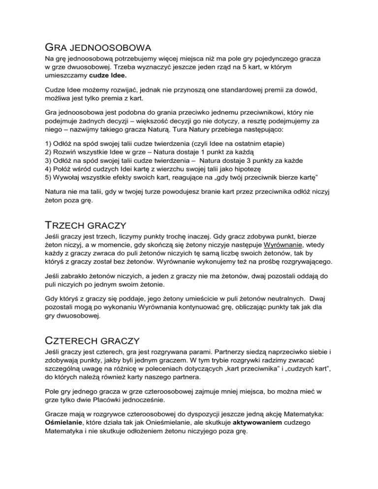 GRA JEDNOOSOBOWA Na grę jednoosobową potrzebujemy więcej miejsca niż ma pole gry pojedynczego gracza w grze dwuosobowej. Trzeba wyznaczyć jeszcze jeden rząd na 5 kart, w którym umieszczamy cudze Idee. Cudze Idee możemy rozwijać, jednak nie przynoszą one standardowej premii za dowód, możliwa jest tylko premia z kart. Gra jednoosobowa jest podobna do grania przeciwko jednemu przeciwnikowi, który nie podejmuje żadnych decyzji – większość decyzji go nie dotyczy, a resztę podejmujemy za niego – nazwijmy takiego gracza Naturą. Tura Natury przebiega następująco: 1) Odłóż na spód swojej talii cudze twierdzenia (czyli Idee na ostatnim etapie) 2) Rozwiń wszystkie Idee w grze – Natura dostaje 1 punkt za każdą 3) Odłóż na spód swojej talii cudze twierdzenia – Natura dostaje 3 punkty za każde 4) Połóż wśród cudzych Idei kartę z wierzchu swojej talii jako hipotezę 5) Wywołaj wszystkie efekty swoich kart, reagujące na „gdy twój przeciwnik bierze kartę” Natura nie ma talii, gdy w twojej turze powodujesz branie kart przez przeciwnika odłóż niczyj żeton poza grę. TRZECH GRACZY Jeśli graczy jest trzech, liczymy punkty trochę inaczej. Gdy gracz zdobywa punkt, bierze żeton niczyj, a w momencie, gdy skończą się żetony niczyje następuje Wyrównanie, wtedy każdy z graczy zwraca do puli żetonów niczyich tę samą liczbę swoich żetonów, tak by któryś z graczy został bez żetonów. Wyrównanie wykonujemy też na prośbę rozgrywającego. Jeśli zabrakło żetonów niczyich, a jeden z graczy nie ma żetonów, dwaj pozostali oddają do puli niczyich po jednym swoim żetonie. Gdy któryś z graczy się poddaje, jego żetony umieścicie w puli żetonów neutralnych. Dwaj pozostali mogą po wykonaniu Wyrównania kontynuować grę, obliczając punkty tak jak dla gry dwuosobowej. CZTERECH GRACZY Jeśli graczy jest czterech, gra jest rozgrywana parami. Partnerzy siedzą naprzeciwko siebie i zdobywają punkty, jakby byli jednym graczem. W tym trybie rozgrywki radzimy zwracać szczególną uwagę na różnicę w poleceniach dotyczących „kart przeciwnika” i „cudzych kart”, do których należą również karty naszego partnera. Pole gry jednego gracza w grze czteroosobowej zajmuje mniej miejsca, bo można mieć w grze tylko dwie Placówki jednocześnie. Gracze mają w rozgrywce czteroosobowej do dyspozycji jeszcze jedną akcję Matematyka: Ośmielanie, które działa tak jak Onieśmielanie, ale skutkuje aktywowaniem cudzego Matematyka i nie skutkuje odłożeniem żetonu niczyjego poza grę.