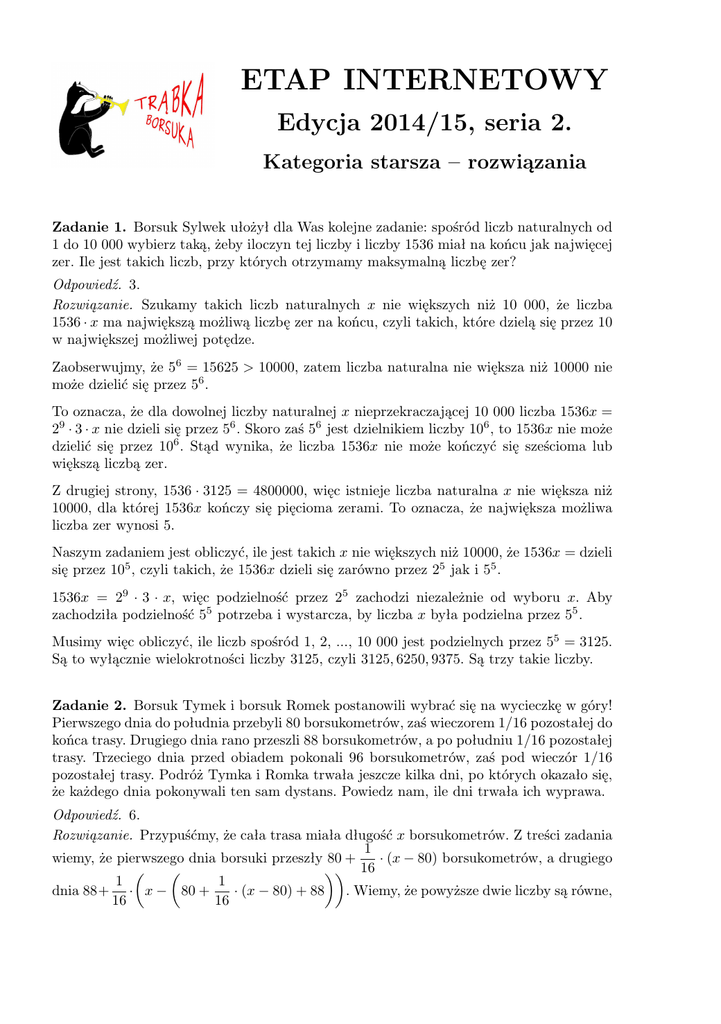ETAP INTERNETOWY Edycja 2014/15, seria 2. Kategoria starsza – rozwiązania Zadanie 1. Borsuk Sylwek ułożył dla Was kolejne zadanie: spośród liczb naturalnych od 1 do 10 000 wybierz taką, żeby iloczyn tej liczby i liczby 1536 miał na końcu jak najwięcej zer. Ile jest takich liczb, przy których otrzymamy maksymalną liczbę zer? Odpowiedź. 3. Rozwiązanie. Szukamy takich liczb naturalnych x nie większych niż 10 000, że liczba 1536 · x ma największą możliwą liczbę zer na końcu, czyli takich, które dzielą się przez 10 w największej możliwej potędze. Zaobserwujmy, że 56 = 15625 > 10000, zatem liczba naturalna nie większa niż 10000 nie może dzielić się przez 56 . To oznacza, że dla dowolnej liczby naturalnej x nieprzekraczającej 10 000 liczba 1536x = 29 · 3 · x nie dzieli się przez 56 . Skoro zaś 56 jest dzielnikiem liczby 106 , to 1536x nie może dzielić się przez 106 . Stąd wynika, że liczba 1536x nie może kończyć się sześcioma lub większą liczbą zer. Z drugiej strony, 1536 · 3125 = 4800000, więc istnieje liczba naturalna x nie większa niż 10000, dla której 1536x kończy się pięcioma zerami. To oznacza, że największa możliwa liczba zer wynosi 5. Naszym zadaniem jest obliczyć, ile jest takich x nie większych niż 10000, że 1536x = dzieli się przez 105 , czyli takich, że 1536x dzieli się zarówno przez 25 jak i 55 . 1536x = 29 · 3 · x, więc podzielność przez 25 zachodzi niezależnie od wyboru x. Aby zachodziła podzielność 55 potrzeba i wystarcza, by liczba x była podzielna przez 55 . Musimy więc obliczyć, ile liczb spośród 1, 2, ..., 10 000 jest podzielnych przez 55 = 3125. Są to wyłącznie wielokrotności liczby 3125, czyli 3125, 6250, 9375. Są trzy takie liczby. Zadanie 2. Borsuk Tymek i borsuk Romek postanowili wybrać się na wycieczkę w góry! Pierwszego dnia do południa przebyli 80 borsukometrów, zaś wieczorem 1/16 pozostałej do końca trasy. Drugiego dnia rano przeszli 88 borsukometrów, a po południu 1/16 pozostałej trasy. Trzeciego dnia przed obiadem pokonali 96 borsukometrów, zaś pod wieczór 1/16 pozostałej trasy. Podróż Tymka i Romka trwała jeszcze kilka dni, po których okazało się, że każdego dnia pokonywali ten sam dystans. Powiedz nam, ile dni trwała ich wyprawa. Odpowiedź. 6. Rozwiązanie. Przypuśćmy, że cała trasa miała długość x borsukometrów. Z treści zadania 1 wiemy, że pierwszego dnia borsuki przeszły 80 + · (x − 80) borsukometrów, a drugiego 16 1 1 dnia 88+ · x − 80 + · (x − 80) + 88 . Wiemy, że powyższe dwie liczby są równe, 16 16 bo piechurzy pokonali każdego dnia taki sam dystans. Dostajemy równanie 1 1 1 80 + · (x − 80) = 88 + · x − 80 + · (x − 80) + 88 , 16 16 16 które po otworzeniu nawiasów zapisuje się następująco: 1 1 1 5 11 · x − 5 = 88 + ·x−5− ·x+ − . 16 16 256 16 2 13 1 · x = 2 , skąd otrzymujemy x = 720. Po przegrupowaniu wyrazów otrzymujemy 256 16 1 Każdego dnia został pokonany dystans 80+ ·720 = 120 borsukometrów, więc wycieczka 16 720 = 6 dni. trwała 120 Uwaga. Informacja o tym, co działo się trzeciego dnia nie była potrzebna, mogła jednak ułatwiać rozwiązywanie zadania innymi sposobami niż powyższy. 80 + Zadanie 3. Zadanie rachunkowe borsuka Ramiego: ile wynosi poniższa suma? √ 1 1 1 √ +√ √ + ··· + √ √ 1+ 2 2+ 3 99 + 100 Odpowiedź. 9. Rozwiązanie. Usuwając niewymierności z mianowników otrzymujemy 1 1 1 √ +√ √ + ··· + √ √ = 1+ 2 2+ 3 99 + 100 √ √ √ √ √ √ 2− 1 3− 2 100 − 99 √ √ √ + √ √ √ √ + ··· + √ √ √ √ = = √ ( 2 + 1)( 2 − 1) ( 3 + 2)( 3 − 2) ( 100 + 99)( 100 − 99) √ √ √ √ √ √ √ √ 2− 1 3− 2 4− 3 100 − 99 = + + + ··· + = 2−1 3−2 4−3 100 − 99 √ √ √ √ √ √ √ √ = 2 − 1 + 3 − 2 + 4 − 3 + · · · + 100 − 99 √ √ √ Każdy ze składników ostatniej sumy (oprócz 1 i 100) występuje raz z plusem i raz z minusem.√Składniki te nic nie wnoszą do sumy, możemy je więc pominąć. Otrzymujemy √ zatem − 1 + 100 = −1 + 10 = 9. Zadanie 4. W lesie, w którym mieszka wiewiór Grześ, drzewa były rozstawione w regularnych odstępach co 5 metrów, jednak po wczorajszej burzy dwa z nich zostały powalone. Teraz układ drzew wygląda jak na rysunku obok. Grześ potrafi skakać na odległość co najwyżej 6 metrów. Chce przedostać się najkrótszą możliwą drogą ze swojej dziupli w drzewie oznaczonym literą D do skrytki z orzechami znajdującej się w drzewie O, nie schodząc na ziemię. Na ile sposobów może to zrobić? Odpowiedź. 77. O D Rozwiązanie. Każda z najkrótszych tras składa się z dziesięciu odcinków — z pięciu poziomych i pięciu pionowych. Grześ poruszając się takimi trasami idzie jedynie „w górę” i „w prawo”. Zliczymy osobno trasy, które zawierają zielony, niebieski, czerwony oraz pomarańczowy punkt. Jest jasne, że każda trasa musi przejść przez któryś z tych punktów oraz że żadna trasa nie może przejść przez więcej niż jeden z nich. Każda trasa, która przechodzi przez zielony punkt, musi zawierać zaznaczony fragment trasy. Należy zliczyć liczbę tras wiodących z domu Grzesia do drzewa A. Jest ich dokładnie 21 — wszystkie są wyrysowane poniżej. O D A O D O Każda trasa, która przechodzi przez niebieski punkt, musi zawierać zaznaczony fragment trasy. Należy znaleźć liczbę tras wiodących z domu Grzesia do drzewa B oraz liczbę tras łączących drzewo C z drzewem O. Tych pierwszych jest dokładnie 10, a tych drugich dokładnie 3. Zatem wszystkich tras zawierających niebieskie drzewo jest 10 · 3 = 30. B C D O Każda trasa, która przechodzi przez czerwony punkt, składa się z dwóch części — jedna łączy dom Grzesia z drzewem E, a druga łączy drzewo E z drzewem O. Jest pięć różnych ścieżek łączących E z O (rysunek przedstawia je wszystkie) oraz pięć ró