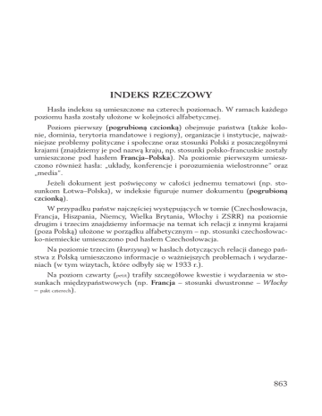 INDEKS RZECZOWY Hasła indeksu są umieszczone na czterech poziomach. W ramach każdego poziomu hasła zostały ułożone w kolejności alfabetycznej. Poziom pierwszy (pogrubioną czcionką) obejmuje państwa (także kolonie, dominia, terytoria mandatowe i regiony), organizacje i instytucje, najważniejsze problemy polityczne i społeczne oraz stosunki Polski z poszczególnymi krajami (znajdziemy je pod nazwą kraju, np. stosunki polsko-francuskie zostały umieszczone pod hasłem Francja–Polska). Na poziomie pierwszym umieszczono również hasła: „układy, konferencje i porozumienia wielostronne” oraz „media”. Jeżeli dokument jest poświęcony w całości jednemu tematowi (np. stosunkom Łotwa–Polska), w indeksie figuruje numer dokumentu (pogrubioną czcionką). W przypadku państw najczęściej występujących w tomie (Czechosłowacja, Francja, Hiszpania, Niemcy, Wielka Brytania, Włochy i ZSRR) na poziomie drugim i trzecim znajdziemy informacje na temat ich relacji z innymi krajami (poza Polską) ułożone w porządku alfabetycznym – np. stosunki czechosłowacko-niemieckie umieszczono pod hasłem Czechosłowacja. Na poziomie trzecim (kursywą) w hasłach dotyczących relacji danego państwa z Polską umieszczono informacje o ważniejszych problemach i wydarzeniach (w tym wizytach, które odbyły się w 1933 r.). Na poziom czwarty (petit) trafiły szczegółowe kwestie i wydarzenia w stosunkach międzypaństwowych (np. Francja – stosunki dwustronne – Włochy – pakt czterech). 863 INDEKS RZECZOWY Afganistan, s. 292, 448, 451, 495, 786, 847, 848 Albania, s. 38620, 4922 Argentyna, s. 548, 596–598, 674–676 Australia, s. 548, 835 Austria, dok. nr 16, 191, 236, 242, 336; s. 31, 1526, 47, 12829, 160, 235, 260, 274, 275, 306, 307, 323, 361, 365, 431, 432, 436, 459, 480, 499, 500, 532, 548, 56943, 608, 653, 763, 783, 824, 825, 853 Austria–Polska, dok. nr 123, 196, 242, 336; s. 144, 164, 30731 Belgia, s. 810, 1017, 83, 84, 14546, 151, 179, 200, 228, 238, 324, 404, 40636, 431, 513, 583, 662, 704, 809, 841 Bliski Wschód, dok. nr 44, 82, 237; s. 3, 104, 366–368, 373–379, 496 Boliwia, dok. nr 305; s. 59623 Brazylia, s. 173, 174, 596–598, 674–676 Bułgaria, s. 19, 16464, 191, 19287, 255, 260, 387, 398, 493, 495, 583, 585, 68725, 737 Bułgaria–Polska, s. 144, 164, 687 Chile, s. 596, 674–676 Chiny, dok. nr 140, 384; s. 6713, 85–87, 151, 158, 27285, 289, 324, 416, 501, 805, 806, 847, 848 Czechosłowacja, passim stosunki dwustronne: – Austria, dok. nr 293; s. 37, 160, 257, 322, 323, 438, 758 – Francja, dok. nr 114, 163; s. 57, 218, 26982, 322, 36084, 392, 435, 436, 438, 647–649, 757, 814 – Jugosławia, s. 1832, 106, 201, 323 – Niemcy, dok. nr 340; s. 18, 130, 131, 160, 167, 257, 322, 436, 645, 653, 654, 705, 757, 814 – Rumunia, s. 1832, 106, 323 – Stany Zjednoczone, s. 809 – Turcja, s. 584 – Węgry, s. 218, 436, 757, 758 – Wielka Brytania, s. 211, 29918, 394, 438, 648 – Włochy, s. 19, 128, 257, 26982, 29918, 309, 323, 435, 438, 648, 704, 758 – ZSRR, s. 204, 4933, 495 sytuacja wewnętrzna, s. 130, 13133 – Słowacja, s. 32347, 844 Czechosłowacja–Polska, dok. nr 120, 141, 195, 204, 340, 375 864 stosunki gospodarcze, dok. nr 195; s. 454 stosunki polityczne, dok. nr 120, 141, 195, 204, 340, 375; s. 18, 19, 161, 164, 168, 218, 299, 3645, 391, 392, 569, 589, 591, 643, 644, 680, 758 – sprawy mniejszości, s. 434, 435 Daleki Wschód, dok. nr 183, 226, 384; s. 6713, 85–87, 150–153, 321, 461, 472, 608, 609, 652, 751, 806, 80722 Dania, s. 90, 91, 200, 324, 33658, 38117, 38217, 411, 413, 453, 548, 786, 81730 Dania–Polska, dok. nr 186; s. 90–92, 15454, 324 Egipt, dok. nr 82; s. 103, 104, 10463 Estonia, dok. nr 349; s. 14546, 16464, 204, 205, 324, 38117, 40636, 472, 495, 809, 846 Estonia–Polska, dok. nr 374; s. 230, 324, 846 Filipiny, s. 4367, 8639 Finlandia, dok. nr 284, 380; s. 12117, 324, 38117, 448, 450, 495, 666, 786, 809, 846 Finlandia–Polska, dok. nr 380; s. 324, 624, 625, 845 Francja, passim stosunki dwustronne: – Austria, s. 37, 160, 260, 306, 42752, 437, 5297, 548, 647, 648 – Bułgaria, s. 260 – Japonia, s. 153 – Jugosławia, s. 169, 192, 36084, 364 – Kanada, s. 337 – Liban, s. 520 – Litwa, s. 723, 744 – Niemcy, dok. nr 18, 28, 150, 153, 156, 229, 283, 341, 345; s. 4, 1017, 20–22, 2234, 32, 45, 46, 53, 541, 57–59, 111, 15958, 204, 235, 237, 259, 260, 306, 391, 441, 456, 457, 513, 528, 541, 566, 567, 574–576, 579, 580, 592, 599, 608, 611, 645, 654, 658, 692, 705, 715, 739, 741, 757, 766, 767, 7814, 782, 793, 794, 799, 826 – Rumunia, s. 23539, 36084, 364, 712, 801 – Stany Zjednoczone, s. 23642, 24654, 27285, 308, 40636, 620, 809 – Syria, s. 520, 522 – Turcja, s. 469, 583 – Węgry, s. 260, 500 – Wielka Brytania, dok. nr 255, 306; s. 33, 53, 57, 59, 104, 12828, 290, 291, 293, 336, 390, 41240, 457, 541, 543, 544, 616, 620, 621, 649, 657, 6585, 69329, 739, 799 INDEKS RZECZOWY – Włochy, dok. nr 130, 134, 174, 193, 216; s. 44, 22, 127, 23539, 254, 259, 396, 427, 433, 438, 544, 567–569, 620, 621, 647, 648, 702, 703, 757, 758 – pakt czterech, dok. nr 130, 134, 174, 193, 216; s. 14647, 14748, 23539, 258, 415 – ZSRR, dok. nr 85, 220, 355; s. 4778, 48, 15757, 159, 189, 204, 461, 468–470, 799 – wizyta Herriota, s. 487 sytuacja wewnętrzna, s. 3247, 33, 3450, 7219, 345, 346, 61939, 657, 73860, 767, 76881 Francja–Polska, dok. nr 9, 18, 20, 24, 30, 41, 92, 116, 133, 159, 161, 162, 211, 243, 256, 257, 266, 307, 330, 342, 353, 363 stosunki gospodarcze, dok. nr 30, 363; s. 47, 15454, 308 – sprawa żyrardowska, s. 4776 stosunki polityczne, dok. nr 4, 9, 20, 24, 41, 92, 116, 133, 159, 161, 162, 182, 211, 256, 257, 353; s. 6, 7, 810, 11, 56–60, 148, 149, 159, 16160, 169, 191, 220, 222–225, 254, 303, 322, 386, 391–393, 414, 460, 463, 486, 511, 575, 622, 630, 69329, 702, 741, 763, 76479, 813, 814 – pakt czterech, dok. nr 92, 159, 161, 162, 182 – rozmowy Beck–Barthou w Genewie, dok. nr 24