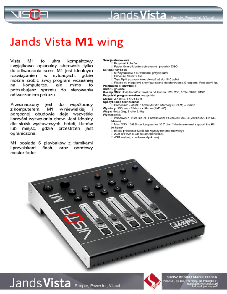 Jands Vista M1 wing Vista M1 to ultra kompaktowy i wyjątkowo opłacalny sterownik tylko do odtwarzania scen. M1 jest idealnym rozwiązaniem w sytuacjach, gdzie można zrobić swój program wcześniej na komputerze, ale mimo to potrzebujesz sprzętu do sterowania odtwarzaniem pokazu. Przeznaczony jest do współpracy z komputerem. M1 w niewielkiej i poręcznej obudowie daje wszystkie korzyści wyzwalania show. Jest idealny dla stoisk wystawowych, hoteli, klubów lub miejsc, gdzie przestrzeń jest ograniczona. M1 posiada 5 playbaków z tłumikami i przyciskami flash, oraz obrotowy master fader. Sekcja sterowania Przyciski kolorów Fader Grand Master (obrotowy) i przycisk DBO Sekcja Playback 5 Playbacków z suwakami i przyciskami Przyciski Select i Go Tryb Split pozwala kontrolować aż do 15 Cuelist Playbacki mogą być skonfigurowane do sterowania Groupami, Presetami itp. Playbacki: 5, Suwaki: 5 DMX: 2 gniazda Kanały DMX: ilość kanałów zależna od klucza: 128, 256, 1024, 2048, 8192 Przyciski programowalne: wszystkie Złącza: 2 x dmx, 1 x USB2-B Specyfikacja techniczna: Processor – 48MHz Atmel ARM7, Memory (SRAM) – 256Kb Wymiary: 250mm x 284mm x 59mm (SxDxW) Waga: Netto 2kg, Brutto 2,8kg Wymagania: Windows 7, Vista lub XP Professional z Sernice Pack 3 (wersja 32– lub 64– bitowa) Mac OSX 10.6 Snow Leopard or 10.7 Lion *Hardware must support the 64bit kernel Intel® processor i3 (i5 lub wyższy rekomendowany) 2GB of RAM (4GB rekomendowane) 4GB wolnej przestrzeni dyskowej