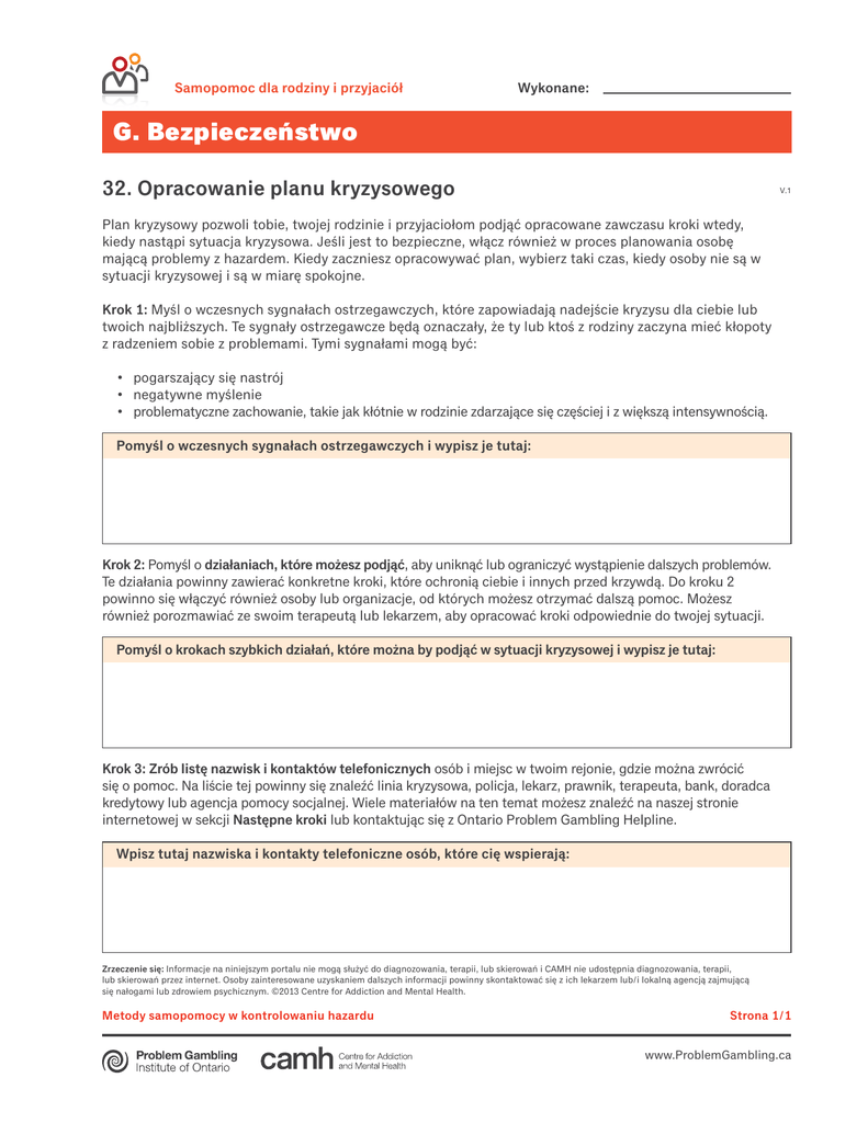 Dokument ten zawiera zarówno informacje i pól formularza. Aby przeczytać informacje, użyj strzałki w dół od pola formularza. Samopomoc dla rodziny i przyjaciół Wykonane: G. Bezpieczeństwo 32. Opracowanie planu kryzysowego V.1 Plan kryzysowy pozwoli tobie, twojej rodzinie i przyjaciołom podjąć opracowane zawczasu kroki wtedy, kiedy nastąpi sytuacja kryzysowa. Jeśli jest to bezpieczne, włącz również w proces planowania osobę mającą problemy z hazardem. Kiedy zaczniesz opracowywać plan, wybierz taki czas, kiedy osoby nie są w sytuacji kryzysowej i są w miarę spokojne. Krok 1: Myśl o wczesnych sygnałach ostrzegawczych, które zapowiadają nadejście kryzysu dla ciebie lub twoich najbliższych. Te sygnały ostrzegawcze będą oznaczały, że ty lub ktoś z rodziny zaczyna mieć kłopoty z radzeniem sobie z problemami. Tymi sygnałami mogą być: • pogarszającysięnastrój • negatywnemyślenie • problematycznezachowanie,takiejakkłótniewrodziniezdarzającesięczęściejizwiększąintensywnością. Pomyśl o wczesnych sygnałach ostrzegawczych i wypisz je tutaj: Krok 2: Pomyśl o działaniach, które możesz podjąć, aby uniknąć lub ograniczyć wystąpienie dalszych problemów. Te działania powinny zawierać konkretne kroki, które ochronią ciebie i innych przed krzywdą. Do kroku 2 powinno się włączyć również osoby lub organizacje, od których możesz otrzymać dalszą pomoc. Możesz również porozmawiać ze swoim terapeutą lub lekarzem, aby opracować kroki odpowiednie do twojej sytuacji. Pomyśl o krokach szybkich działań, które można by podjąć w sytuacji kryzysowej i wypisz je tutaj: Krok 3: Zrób listę nazwisk i kontaktów telefonicznych osób i miejsc w twoim rejonie, gdzie można zwrócić się o pomoc. Na liście tej powinny się znaleźć linia kryzysowa, policja, lekarz, prawnik, terapeuta, bank, doradca kredytowy lub agencja pomocy socjalnej. Wiele materiałów na ten temat możesz znaleźć na naszej stronie internetowej w sekcji Następne kroki lub kontaktując się z Ontario Problem Gambling Helpline. Wpisz tutaj nazwiska i kontakty telefoniczne osób, które cię wspierają: Zrzeczenie się: Informacje na niniejszym portalu nie mogą służyć do diagnozowania, terapii, lub skierowań i CAMH nie udostępnia diagnozowania, terapii, lub skierowań przez internet. Osoby zainteresowane uzyskaniem dalszych informacji powinny skontaktować się z ich lekarzem lub/i lokalną agencją zajmującą się nałogami lub zdrowiem psychicznym. ©2013 Centre for Addiction and Mental Health. Metody samopomocy w kontrolowaniu hazardu Strona 1/1 www.ProblemGambling.ca