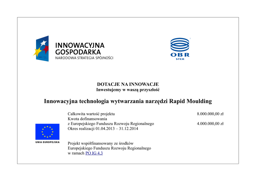 DOTACJE NA INNOWACJE Inwestujemy w waszą przyszłość Innowacyjna technologia wytwarzania narzędzi Rapid Moulding Całkowita wartość projektu Kwota dofinansowania z Europejskiego Funduszu Rozwoju Regionalnego Okres realizacji 01.04.2013 – 31.12.2014 Projekt współfinansowany ze środków Europejskiego Funduszu Rozwoju Regionalnego w ramach PO IG 4.3 8.000.000,00 zł 4.000.000,00 zł