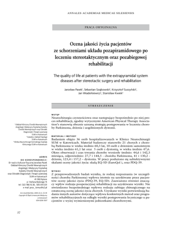 ANNALES ACADEMIAE MEDICAE SILESIENSIS PRACA ORYGINALNA Ocena jakości życia pacjentów ze schorzeniami układu pozapiramidowego po leczeniu stereotaktycznym oraz pozabiegowej rehabilitacji The quality of life at patients with the extrapyramidal system diseases after stereotactic surgery and rehabilitation Jarosław Pasek1, Sebastian Szajkowski2, Krzysztof Suszyński2, Jan Wiaderkiewicz2, Stanisław Kwiek3 STRESZCZENIE WSTĘP 1 Oddział Kliniczny Chorób Wewnętrznych Angiologii i Medycyny Fizykalnej Katedry Chorób Wewnętrznych oraz Ośrodek Diagnostyki i Terapii Laserowej SUM w Katowicach 2 Katedra i Zakład Fizjologii SUM w Katowicach 3 Klinika Neurochirurgii Centralnego Szpitala Klinicznego SUM w Katowicach ADRES D O KO R E S P O N D E N C J I : Dr nauk o kulturze fizycznej Jarosław Pasek Oddział Kliniczny Chorób Wewnętrznych Angiologii i Medycyny Fizykalnej Katedry Chorób Wewnętrznych oraz Ośrodek Diagnostyki i Terapii Laserowej SUM w Katowicach 41-902 Bytom ul. Stefana Batorego 15 tel. (32) 786 16 30, 505 014 331 e-mail: [email protected] Ann.Acad.Med.Siles. 2009, 63, 6, 32-39 Copyright © Śląski Uniwersytet Medyczny w Katowicach ISSN 0208-5607 32 Neurochirurgia czynnościowa oraz następujący bezpośrednio po niej proces rehabilitacji, zgodny wytycznymi American Physical Therapy Association’s stanowią obecnie uznaną strategię postępowania w leczeniu choroby Parkinsona, drżenia i uogólnionych dystonii. M AT E R I A Ł I M E T O D Y Badaniem objęto 36 osób hospitalizowanych w Klinice Neurochirurgii SUM w Katowicach. Materiał badawczy stanowiło 21 chorych z chorobą Parkinsona w wieku średnio 60,3 lat, 10 osób z drżeniem samoistnym w wieku średnio 61,1 lat oraz 5 osób z dystonią, w wieku średnio 47,6. Okres obserwacji i czas trwania choroby wyniosły średnio: 44,6 i 142,3 miesiąca, odpowiednio: 27,7 i 144,5 - choroba Parkinsona, 41 i 130,2 drżenie, 123,4 i 157,2 – dystonia. W pracy posłużono się subiektywnymi skalami oceny jakości życia: skalą EQ-5D (EuroQol ), oraz PDQ-39. WYNIKI Z przeprowadzonych badań wynika, że rodzaj rozpoznania (w szczególności choroba Parkinsona) wpływa istotnie na uzyskiwane przez pacjentów oceny jakości życia (PDQ-39, EQ-5D). Zauważono również znaczący wpływ rodzaju pooperacyjnej rehabilitacji na uzyskiwane wyniki. Nie stwierdzono bezpośredniego wpływu rodzaju zabiegu chirurgicznego na ostateczną ocenę jakości życia chorych. Uzyskane wyniki potwierdzają badania innych autorów dotyczące wpływu konkretnych metod oraz programów rehabilitacyjnych na odległe wyniki postępowania leczniczego u pacjentów z wyżej wymienionymi jednostkami chorobowymi. JAKOŚĆ ŻYCIA W CHOROBIE PARKINSONA WNIOSKI Rehabilitacja oraz rodzaj postawionego rozpoznania warunkują jakość życia pacjentów ze schorzeniami układu pozapiramidowego po zastosowaniu nowoczesnych metod leczenia chirurgicznego. S Ł O WA K L U C Z O W E choroba Parkinsona, fizjoterapia, głęboka stymulacja mózgu A B S T R AC T INTRODUCTION Nowadays the functional neurosurgery makes up the recognized strategy of proceeding in the treatment: Parkinson diseases (PD), tremor, and generalized dystonia. According to directive line of American Physical Therapy Association´s the main role of physiotherapist is creating individual rehabilitation programs and their incessant modification in relation to changing condition of patient. M AT E R I A L A N D M E T H O D S Patients were hospitalized in Department of Neurosurgery Medical University of Silesia in Katowice. The surgical treatment of extrapyramidal system diseases and rehabilitation after surgery were applied to 36 persons. The average age was 58,8 years. The proportional part of diagnosis in the analyzed material: (PD)-58%, tremor-28%, dystonia-14%. The average period of the observation and length of disease were: 44,6 and 142,3 month. For evaluation of quality of life PDQ-39 questionnaire and EQ-5D (EuroQol) questionnaire were used. R E S U LT S The results of investigations were elaborated in the aim of comparison of the quality of life in relation to applied surgical treatment and after surgery rehabilitation. The results proved the statistically essential influence of rehabilitation on: mobility, pain and usual activities (EQ-5D) questionnaire. The regress analyses showed the essential, negative influence of length disease on EQ-5D assessment. CONCLUSIONS Rehabilitation and the type of diagnosis influence essentially on the quality of life at persons after stereotactic surgery performed because of extrapyramidal system diseases. KEY WORDS Parkinson disease, physiotherapy, deep brain stimulation WSTĘP Choroba Parkinsona (Morbus Parkinsoni) jest jedną z najczęstszych chorób neurodegeneracyjnych OUN. Główne objawy tej jednostki chorobowej to drżenie spoczynkowe, spowolnienie ruchowe oraz sztywność. Rozwijają się one w wyniku uszkodzenia układu nigrostriatalnego mózgu i spadku stężenia neuroprzekaźnika – dopaminy [1]. Wprowadzenie do terapii przed ponad 40-stu laty prekursora dopa33 ANNALES ACADEMIAE MEDICAE SILESIENSIS miny – lewodopy, stało się złotym standardem leczenia choroby Parkinsona. Jednak wraz z postępem choroby u wielu chorych pojawiały się fluktuacje ruchowe i dyskinezy, nierzadko bardzo trudne do leczenia [1,2]. Niezależnie od prowadzonego leczenia farmakologicznego podejmowano próby leczenia neurochirurgicznego choroby Parkinsona i innych chorób układu pozapiramidowego [3,4]. Dokładne poznanie anatomii czynnościowej, biochemii oraz fizjologii układu pozapiramidowego, umożliwiło wprowadzenie coraz częściej chirurgicznych metod leczenia [4]. Neurochirurgia czynnościowa stanowi obecnie uznaną strategię postępowania w leczeniu choroby Parkinsona (PD), leczeniu drżenia i uogólnionych dystonii [5,6,7,8,9]. Obecnie do najczęściej stosowanych metod chirurgicznych wykorzystywanych w leczeniu schorzeń układu pozapiramidowego należą: ablacja