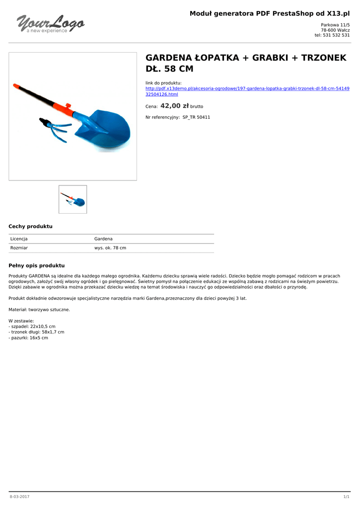 Moduł generatora PDF PrestaShop od X13.pl Parkowa 11/5 78-600 Wałcz tel: 531 532 531 GARDENA ŁOPATKA + GRABKI + TRZONEK DŁ. 58 CM link do produktu: http://pdf.x13demo.pl/akcesoria-ogrodowe/197-gardena-lopatka-grabki-trzonek-dl-58-cm-54149 32504126.html Cena: 42,00 zł brutto Nr referencyjny: SP_TR 50411 Cechy produktu Licencja Gardena Rozmiar wys. ok. 78 cm Pełny opis produktu Produkty GARDENA są idealne dla każdego małego ogrodnika. Każdemu dziecku sprawią wiele radości. Dziecko będzie mogło pomagać rodzicom w pracach ogrodowych, założyć swój własny ogródek i go pielęgnować. Świetny pomysł na połączenie edukacji ze wspólną zabawą z rodzicami na świeżym powietrzu. Dzięki zabawie w ogrodnika można przekazać dziecku wiedzę na temat środowiska i nauczyć go odpowiedzialności oraz dbałości o przyrodę. Produkt dokładnie odwzorowuje specjalistyczne narzędzia marki Gardena,przeznaczony dla dzieci powyżej 3 lat. Materiał: tworzywo sztuczne. W zestawie: - szpadel: 22x10,5 cm - trzonek długi: 58x1,7 cm - pazurki: 16x5 cm 8-03-2017 1/1