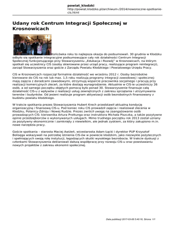 powiat_klodzki http://powiat.klodzko.pl/archiwum-/2014/noworoczne-spotkaniecis.html Udany rok Centrum Integracji Społecznej w Krosnowicach Końcówka roku to najlepsza okazja do podsumowań. 30 grudnia w Kłodzku odbyło się spotkanie integracyjne podsumowujące cały rok działalności Centrum Integracji Społecznej funkcjonującego przy Stowarzyszeniu „Edukacja i Rozwój” w Krosnowicach, na którym spotkali się uczestnicy CIS (osoby skierowane przez urząd pracy, realizujące program reintegracji), zarząd Stowarzyszenia oraz goście z Zarządu Powiatu Kłodzkiego i Powiatowego Urzędu Pracy. CIS w Krosnowicach rozpoczął formalnie działalność we wrześniu 2012 r. Osoby bezrobotne kierowane do CIS na rok lub max. 1,5 roku realizują programy integracji zawodowej i społecznej: mają zajęcia z doradcami zawodowymi, otrzymują wsparcie pracownika socjalnego i pracują przy realizacji komercyjnych zleceń, za które dostają wynagrodzenie. Aktualnie w CIS-ie uczestniczy 26 osób, a od samego początku objętych pomocą było ponad 30. Stowarzyszenie finansuje całą działalność CIS-u z wpływów z realizacji usług zewnętrznych z zakresu sprzątania i utrzymywania terenów i budynków. Od jesieni realizuje program aktywizacji osób bezrobotnych finansowany z budżetu powiatu kłodzkiego. W trakcie spotkania prezes Stowarzyszenia Hubert Krech przedstawił aktualną kondycję organizacyjną i finansową CIS-u. Pod koniec roku CIS prowadził zajęcia i realizował zlecenia w Kłodzku, Polanicy-Zdroju i Nowej Rudzie. Prezes zwrócił uwagę na zaangażowanie osób prowadzących CIS: kierownika Artura Prottunga oraz instruktora Michała Piszczka, a także pozytywne opinie przedsiębiorców o wykonywanych usługach. Mimo trudnego początku rok 2013 został uznany za pozytywny ekonomicznie i zamknięty z niewielkim, ale jednak zyskiem, za który zakupiono m.in. nowe narzędzia pracy. Goście spotkania – starosta Maciej Awiżeń, wicestarosta Adam Łącki i dyrektor PUP Krzysztof Bolisęga wskazywali na potrzebę istnienia CIS-ów w powiecie kłodzkim, jako niezwykle pożytecznych i spełniających swoją rolę instytucji, łagodzących skutki wysokiego bezrobocia. W trakcie dyskusji z członkami Stowarzyszenia deklarowali dalszą współpracę przy rozwoju CIS-u oraz powstawaniu nowych projektów z zakresu ekonomii społecznej. Data publikacji 2017-03-08 5:40:16, Strona: 1/1