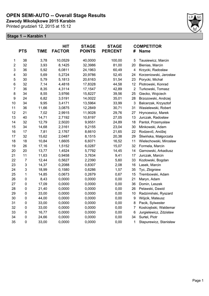 OPEN SEMI-AUTO -- Overall Stage Results Zawody Mikołajkowe 2015 Karabin Printed grudzień 12, 2015 at 15:12 Stage 1 -- Karabin 1 1 2 3 4 5 6 7 8 9 10 11 12 13 14 15 16 17 18 19 20 21 22 23 24 25 26 27 28 29 30 31 32 33 34 35 PTS TIME HIT FACTOR STAGE POINTS STAGE PERCENT 38 32 36 30 30 32 36 34 24 34 36 21 40 32 34 17 32 18 26 20 11 7 3 3 1 0 0 0 0 0 0 0 0 0 0 3,78 3,93 5,92 5,69 5,79 7,14 8,35 8,55 6,82 9,95 11,66 7,02 14,71 12,79 14,68 7,81 15,62 10,84 17,16 13,77 11,63 12,44 14,37 18,99 14,85 8,43 17,09 21,40 33,00 44,00 33,00 33,00 16,77 24,66 33,00 10,0529 8,1425 6,0811 5,2724 5,1813 4,4818 4,3114 3,9766 3,5191 3,4171 3,0875 2,9915 2,7192 2,5020 2,3161 2,1767 2,0487 1,6605 1,5152 1,4524 0,9458 0,5627 0,2088 0,1580 0,0673 0,0000 0,0000 0,0000 0,0000 0,0000 0,0000 0,0000 0,0000 0,0000 0,0000 40,0000 32,3986 24,1963 20,9786 20,6163 17,8328 17,1547 15,8227 14,0022 13,5964 12,2849 11,9028 10,8197 9,9551 9,2155 8,6610 8,1515 6,6071 6,0287 5,7792 3,7634 2,2390 0,8307 0,6286 0,2679 0,0000 0,0000 0,0000 0,0000 0,0000 0,0000 0,0000 0,0000 0,0000 0,0000 100,00 81,00 60,49 52,45 51,54 44,58 42,89 39,56 35,01 33,99 30,71 29,76 27,05 24,89 23,04 21,65 20,38 16,52 15,07 14,45 9,41 5,60 2,08 1,57 0,67 0,00 0,00 0,00 0,00 0,00 0,00 0,00 0,00 0,00 0,00 COMPETITOR # Name 5 20 4 24 23 12 2 25 28 3 31 27 13 18 30 22 29 11 32 14 17 33 16 35 15 21 36 26 10 9 8 7 6 34 1 Tausiewicz, Marcin Bienias, Marcin Krzycki, Radosław Korzeniowski, Jarosław Porycki, Michał Piotrowski, Konrad Turkowski, Tomasz Giecko, Wojciech Brzozowski, Andrzej Balcerzak, Krzysztof Wasielewski, Robert Hryncewicz, Marek Jurczak, Radosław Pantoł, Przemysław Minkowski, Adam Rodzevič, Andžej Śliwińska, Małgorzata Wielechowski, Mirosław Formela, Marcin Garnowski, Arkadiusz Jurczak, Marcin Kozłowski, Bogdan Lasek, Marcin Tyc, Zbigniew Trembowski, Adam Maryn, Adam Domin, Leszek Pelawski, Dawid Radzimiński, Ryszard Wójcik, Mateusz Pacik, Sylwester Kostrzębski, Waldemar Jurgielewicz, Zdzisław Surtel, Piotr Stapurewicz, Stanisław Page 1 OPEN SEMI-AUTO -- Overall Stage Results Zawody Mikołajkowe 2015 Karabin Printed grudzień 12, 2015 at 15:12 Stage 2 -- Karabin 2 1 2 3 4 5 6 7 8 9 10 11 12 13 14 15 16 17 18 19 20 21 22 23 24 25 26 27 28 29 30 31 32 33 34 35 PTS TIME HIT FACTOR STAGE POINTS STAGE PERCENT 89 104 96 106 100 99 106 98 94 88 79 86 87 102 93 100 74 82 73 74 80 51 32 61 37 12 18 12 0 0 0 0 0 0 0 12,66 21,25 21,04 26,80 25,80 28,86 32,48 31,88 30,75 29,02 26,75 30,15 31,64 40,29 37,29 42,18 32,35 42,89 38,36 40,00 47,33 37,94 28,08 59,16 44,20 28,73 45,60 67,61 121,00 54,77 99,00 42,90 25,80 33,00 63,78 7,0300 4,8941 4,5627 3,9552 3,8760 3,4304 3,2635 3,0740 3,0569 3,0324 2,9533 2,8524 2,7497 2,5316 2,4940 2,3708 2,2875 1,9119 1,9030 1,8500 1,6903 1,3442 1,1396 1,0311 0,8371 0,4177 0,3947 0,1775 0,0000 0,0000 0,0000 0,0000 0,0000 0,0000 0,0000 120,0000 83,5409 77,8844 67,5143 66,1615 58,5550 55,7076 52,4726 52,1804 51,7619 50,4113 48,6896 46,9362 43,2143 42,5712 40,4686 39,0465 32,6349 32,4840 31,5789 28,8522 22,9455 19,4526 17,6006 14,2891 7,1297 6,7380 3,0297 0,0000 0,0000 0,0000 0,0000 0,0000 0,0000 0,0000 100,00 69,62 64,90 56,26 55,13 48,80 46,42 43,73 43,48 43,13 42,01 40,57 39,11 36,01 35,48 33,72 32,54 27,20 27,07 26,32 24,04 19,12 16,21 14,67 11,91 5,94 5,62 2,52 0,00 0,00 0,00 0,00 0,00 0,00 0,00 COMPETITOR # Name 5 20 24 4 12 23 34 31 3 25 22 35 13 32 27 18 26 2 21 16 11 33 30 29 15 17 28 14 9 10 7 36 6 1 8 Tausiewicz, Marcin Bienias, Marcin Korzeniowski, Jarosław Krzycki, Radosław Piotrowski, Konrad Porycki, Michał Surtel, Piotr Wasielewski, Robert Balcerzak, Krzysztof Giecko, Wojciech Rodzevič, Andžej Tyc, Zbigniew Jurczak, Radosław Formela, Marcin Hryncewicz, Marek Pantoł, Przemysław Pelawski, Dawid Turkowski, Tomasz Maryn, Adam Lasek, Marcin Wielechowski, Mirosław Kozłowski, Bogdan Minkowski, Adam Śliwińska, Małgorzata Trembowski, Adam Jurczak, Marcin Brzozowski, Andrzej Garnowski, Arkadiusz Wójcik, Mateusz Radzimiński, Ryszard Kostrzębski, Waldemar Domin, Leszek Jurgielewicz, Zdzisław Stapurewicz, Stanisław Pacik, Sylwester Page 1
