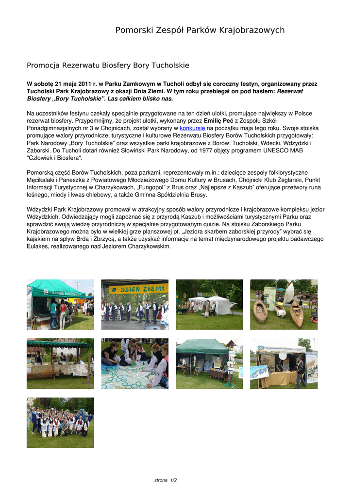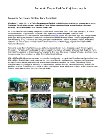 Pomorski Zespół Parków Krajobrazowych Promocja Rezerwatu Biosfery Bory Tucholskie W sobotę 21 maja 2011 r. w Parku Zamkowym w Tucholi odbył się coroczny festyn, organizowany przez Tucholski Park Krajobrazowy z okazji Dnia Ziemi. W tym roku przebiegał on pod hasłem: Rezerwat Biosfery „Bory Tucholskie”. Las całkiem blisko nas. Na uczestników festynu czekały specjalnie przygotowane na ten dzień ulotki, promujące największy w Polsce rezerwat biosfery. Przypomnijmy, że projekt ulotki, wykonany przez Emilię Peć z Zespołu Szkół Ponadgimnazjalnych nr 3 w Chojnicach, został wybrany w konkursie na początku maja tego roku. Swoje stoiska promujące walory przyrodnicze, turystyczne i kulturowe Rezerwatu Biosfery Borów Tucholskich przygotowały: Park Narodowy „Bory Tucholskie” oraz wszystkie parki krajobrazowe z Borów: Tucholski, Wdecki, Wdzydzki i Zaborski. Do Tucholi dotarł również Słowiński Park Narodowy, od 1977 objęty programem UNESCO MAB "Człowiek i Biosfera". Pomorską część Borów Tucholskich, poza parkami, reprezentowały m.in.: dziecięce zespoły folklorystyczne Męcikalaki i Paneszka z Powiatowego Młodzieżowego Domu Kultury w Brusach, Chojnicki Klub Żeglarski, Punkt Informacji Turystycznej w Charzykowach, „Fungopol” z Brus oraz „Najlepsze z Kaszub” oferujące przetwory runa leśnego, miody i kwas chlebowy, a także Gminna Spółdzielnia Brusy. Wdzydzki Park Krajobrazowy promował w atrakcyjny sposób walory przyrodnicze i krajobrazowe kompleksu jezior Wdzydzkich. Odwiedzający mogli zapoznać się z przyrodą Kaszub i możliwościami turystycznymi Parku oraz sprawdzić swoją wiedzę przyrodniczą w specjalnie przygotowanym quizie. Na stoisku Zaborskiego Parku Krajobrazowego można było w wielkiej grze planszowej pt. „Jeziora skarbem zaborskiej przyrody” wybrać się kajakiem na spływ Brdą i Zbrzycą, a także uzyskać informacje na temat międzynarodowego projektu badawczego Eulakes, realizowanego nad Jeziorem Charzykowskim. strona 1/2 strona 2/2 Powered by TCPDF (www.tcpdf.org)