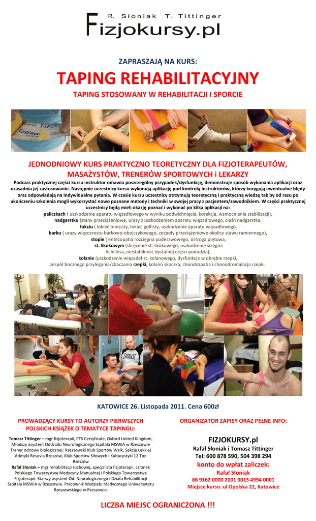 ZAPRASZAJĄ NA KURS: TAPING REHABILITACYJNY TAPING STOSOWANY W REHABILITACJI I SPORCIE JEDNODNIOWY KURS PRAKTYCZNO TEORETYCZNY DLA FIZJOTERAPEUTÓW, MASAŻYSTÓW, TRENERÓW SPORTOWYCH i LEKARZY Podczas praktycznej części kursu instruktor omawia poszczególny przypadek/dysfunkcję, demonstruje sposób wykonania aplikacji oraz uzasadnia jej zastosowanie. Następnie uczestnicy kursu wykonują aplikację pod kontrolą instruktorów, którzy korygują ewentualne błędy oraz odpowiadają na indywidualne pytania. W czasie kursu uczestnicy otrzymują teoretyczną i praktyczną wiedzę tak by od razu po ukooczeniu szkolenia mogli wykorzystad nowo poznane metody i techniki w swojej pracy z pacjentem/zawodnikiem. W części praktycznej uczestnicy będą mieli okazję poznad i wykonad po kilka aplikacji na: paliczkach ( uszkodzenie aparatu więzadłowego w wyniku podwichnięcia, korekcja, wzmocnienie stabilizacji), nadgarstku (stany przeciążeniowe, urazy z uszkodzeniem aparatu więzadłowego, cieśo nadgarstka, łokciu ( łokied tenisisty, łokied golfisty, uszkodzenie aparatu więzadłowego, barku ( urazy więzozrostu barkowo-obojczykowego, zespoły przeciążeniowe okolicy stawu ramiennego), stopie ( entezopatia rozcięgna podeszwowego, ostroga piętowa, st. Skokowym (skręcenie st. skokowego, uszkodzenie ścięgna Achillesa, niestabilnośd dystalnej części podudzia), kolanie (uszkodzenie więzadeł st. kolanowego, dysfunkcje w obrębie rzepki, zespół bocznego przylegania/zbaczania rzepki, kolano skoczka, chondropatia i chonodromalacja rzepki. KATOWICE 26. Listopada 2011. Cena 600zł PROWADZĄCY KURSY TO AUTORZY PIERWSZYCH POLSKICH KSIĄŻEK O TEMATYCE TAPINGU: Tomasz Tittinger – mgr fizjoterapii, PTS Certyficate, Oxford United Kingdom, Młodszy asystent Oddziału Neurologicznego Szpitala MSWiA w Rzeszowie Trener odnowy biologicznej: Rzeszowski Klub Sportów Walk, Sekcja Lekkiej Atletyki Resovia Rzeszów, Klub Sportów Siłowych i Kulturystyki 12 Ton Rzeszów Rafał Słoniak – mgr rehabilitacji ruchowej, specjalista fizjoterapii, członek Polskiego Towarzystwa Medycyny Manualnej i Polskiego Towarzystwa Fizjoterapii. Starszy asystent Od. Neurologicznego i Działu Rehabilitacji Szpitala MSWiA w Rzeszowie. Pracownik Wydziału Medycznego Uniwersytetu Rzeszowskiego w Rzeszowie. ORGANIZATOR ZAPISY ORAZ PEŁNE INFO: FIZJOKURSY.pl Rafał Słoniak i Tomasz Tittinger Tel: 600 878 590, 504 398 294 konto do wpłat zaliczek: Rafał Słoniak 86 9162 0000 2001 0013 4994 0001 Miejsce kursu: ul Opolska 22, Katowice LICZBA MIEJSC OGRANICZONA !!!